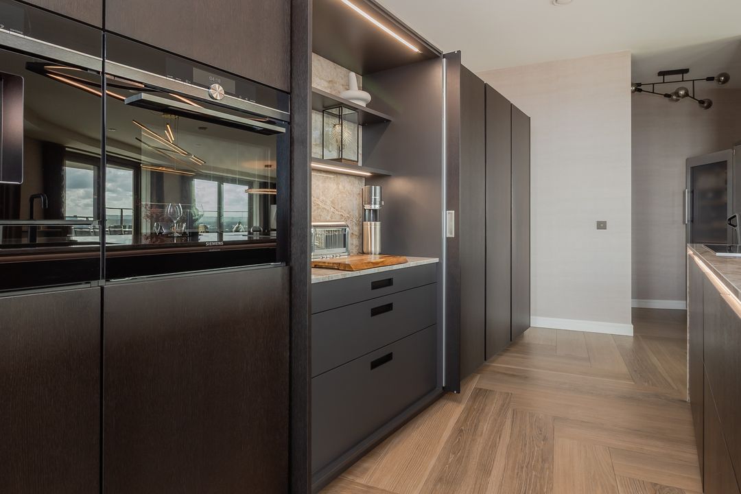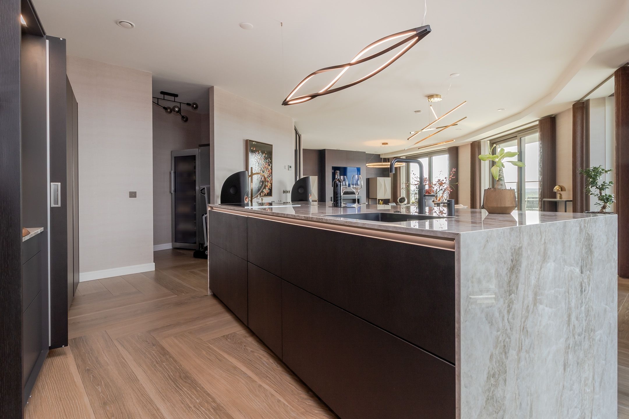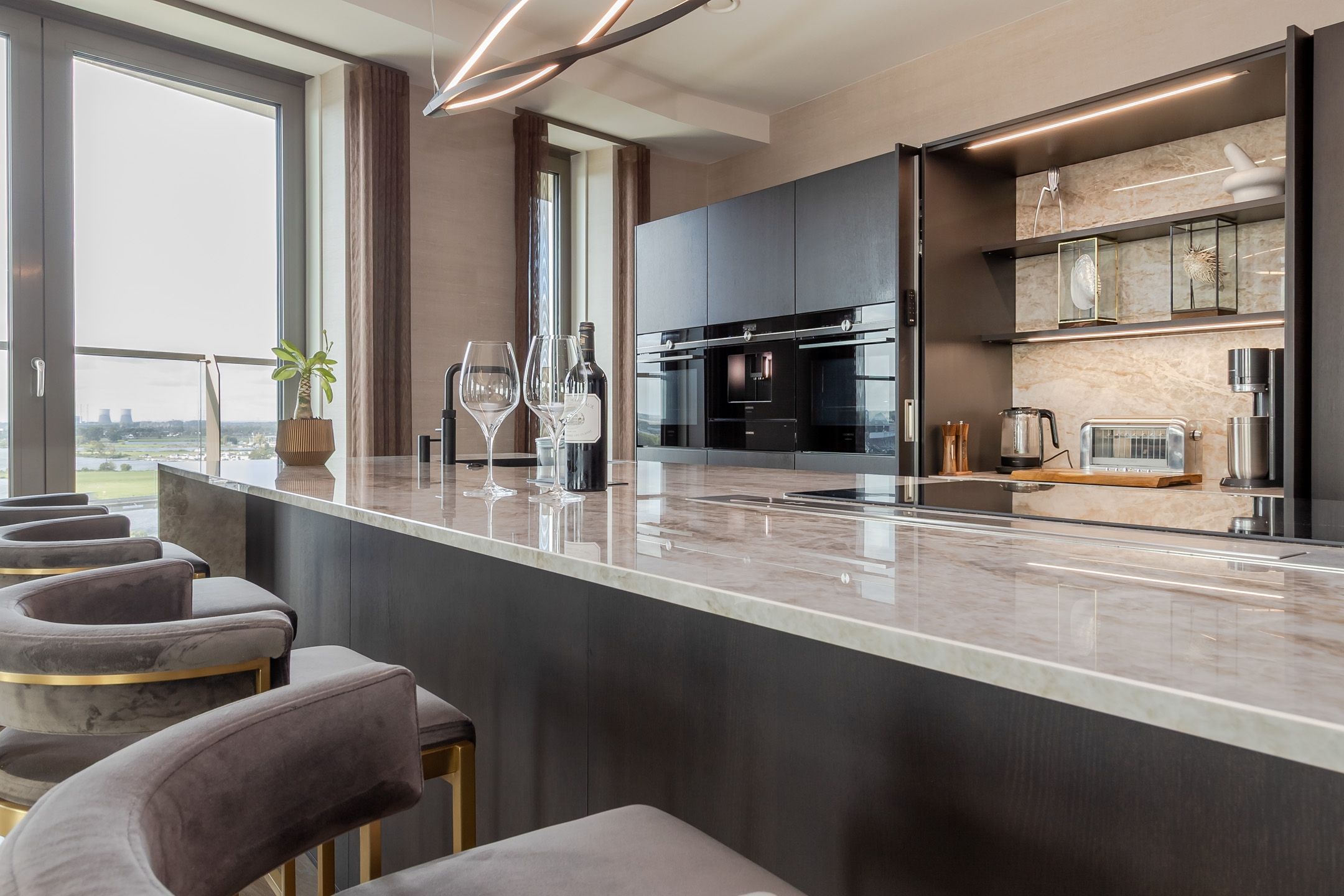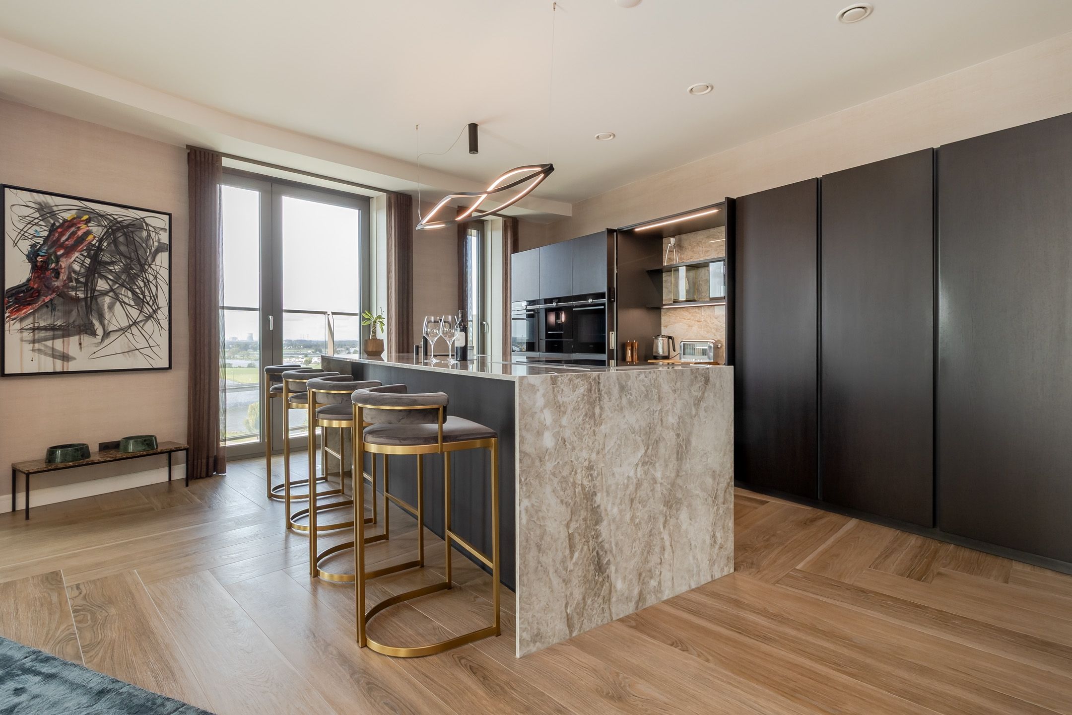 De luxe open keuken sluit naadloos aan bij de woonkamer.