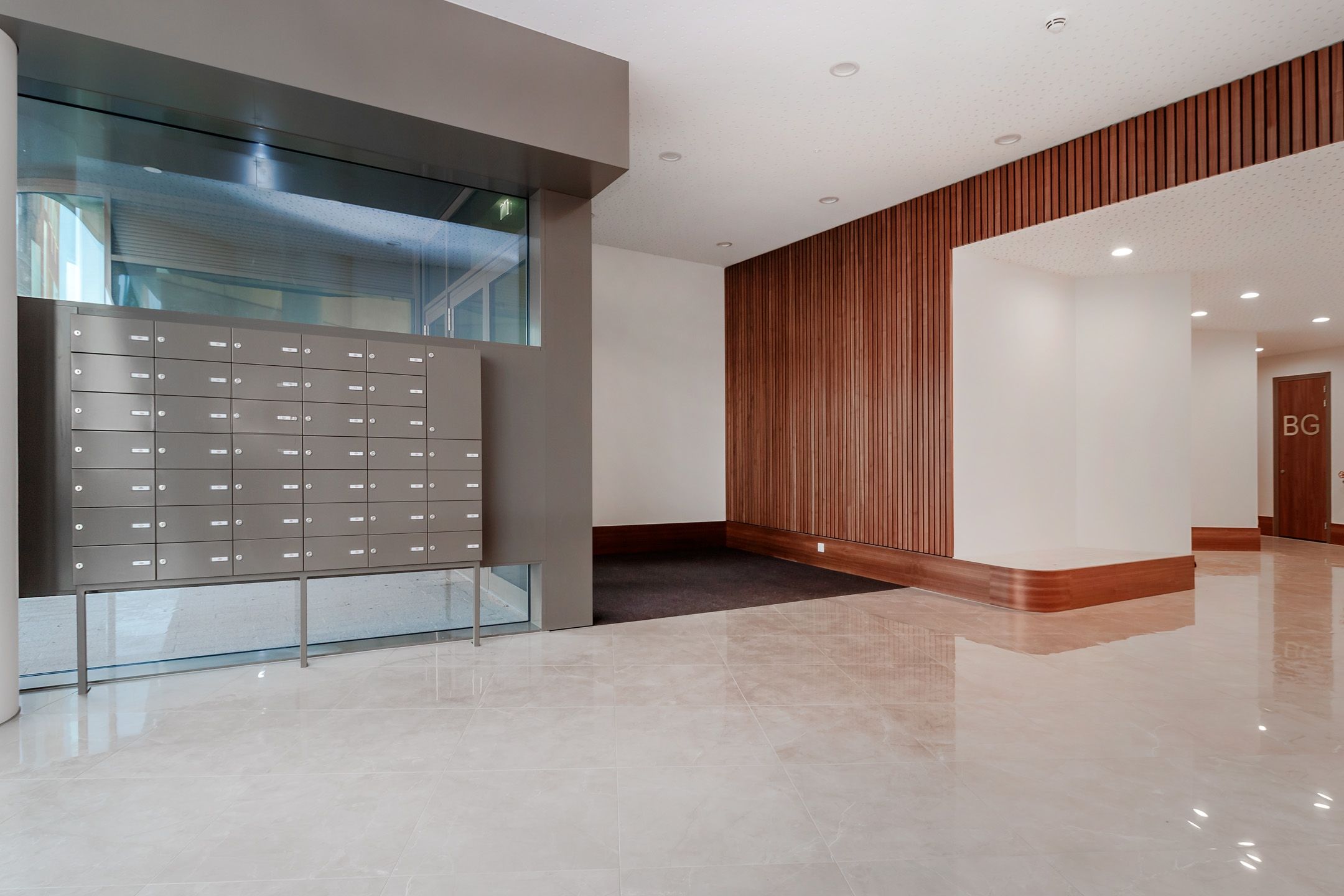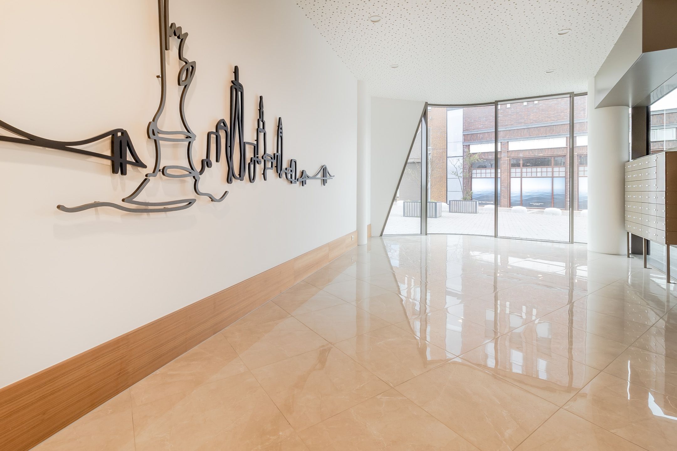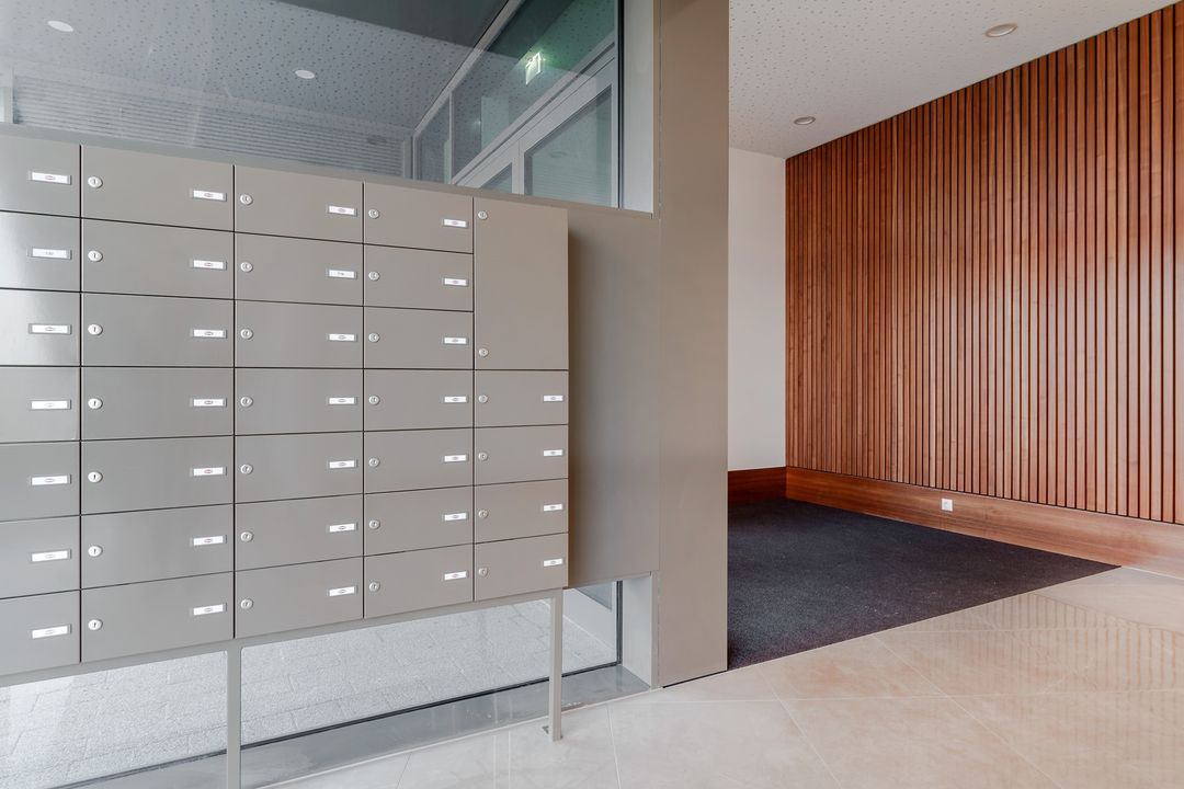 De entree van het complex voelt meteen luxe aan. Een stijlvolle hal met brievenbussen, bellenbord en intercom geeft toegang tot de lift en het trappenhuis.