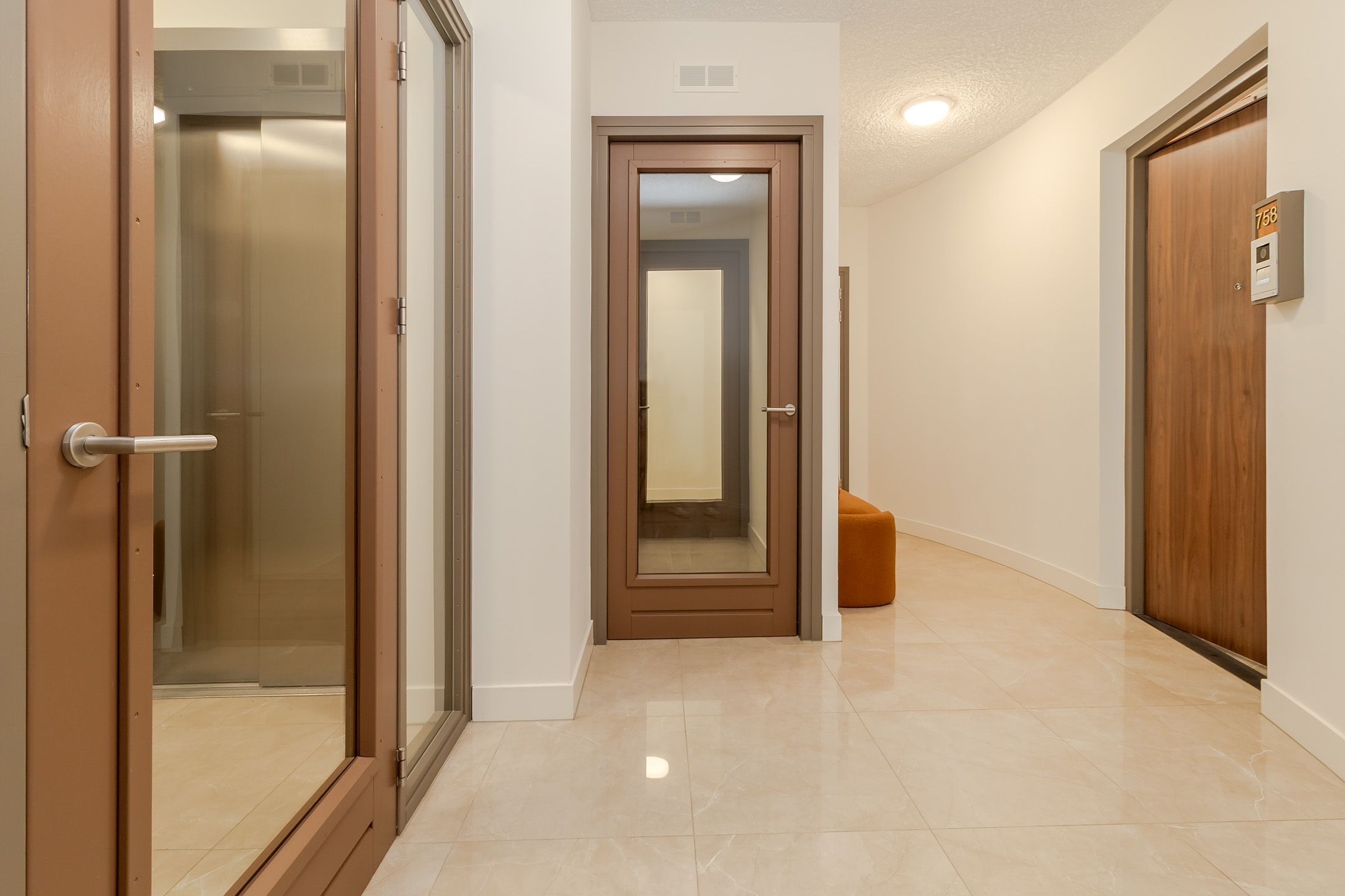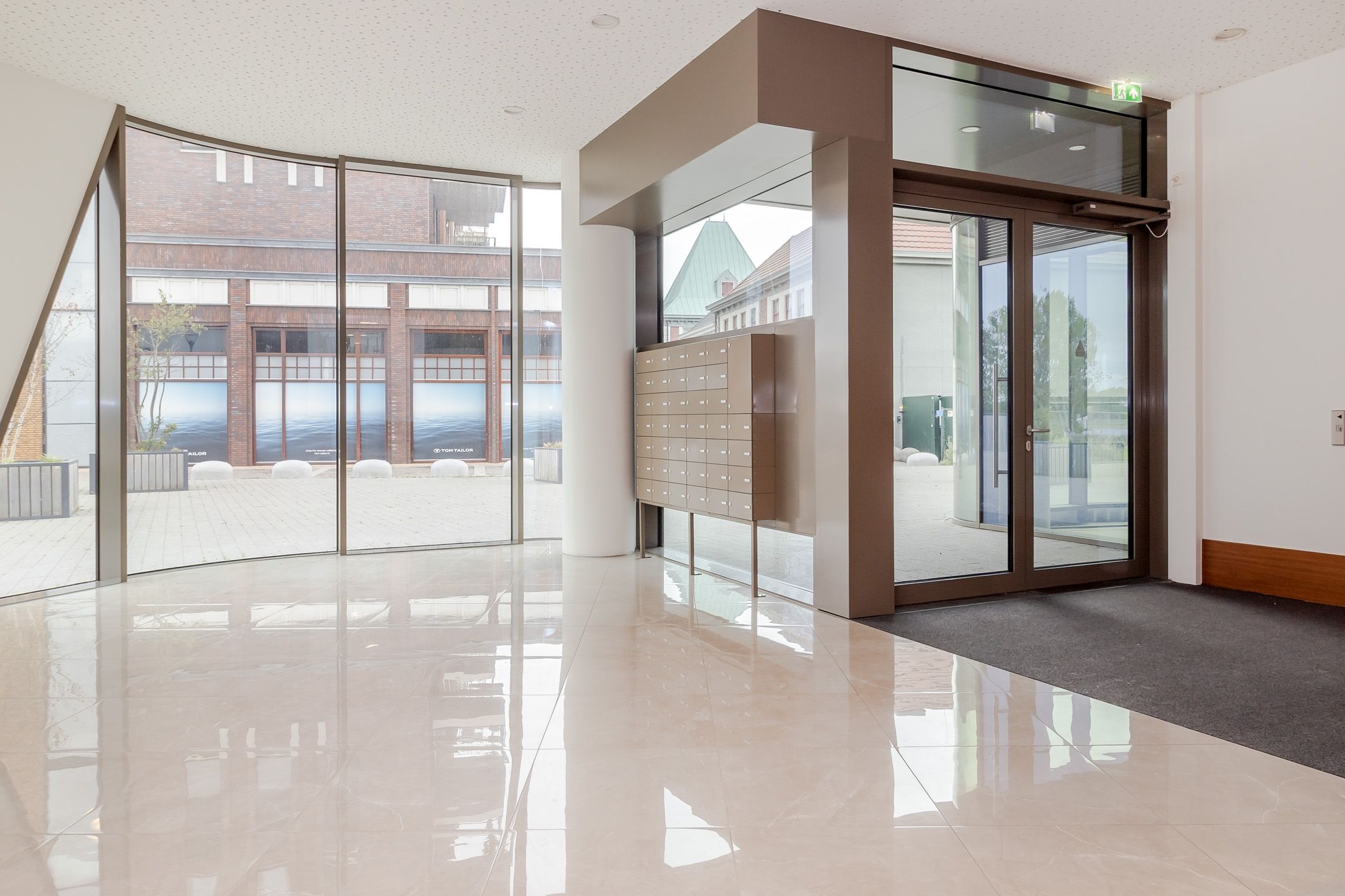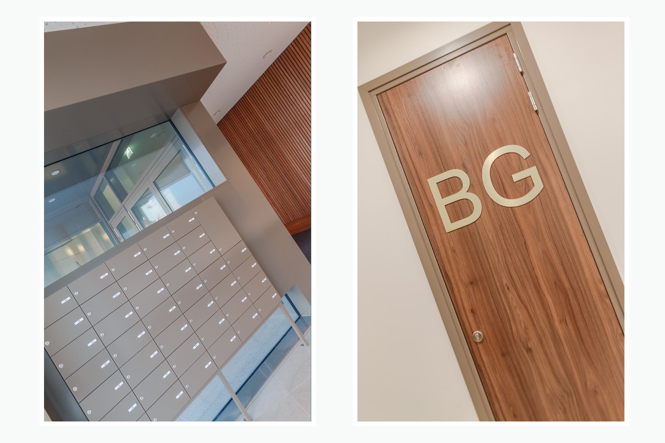 De entree van het complex voelt meteen luxe aan. Een stijlvolle hal met brievenbussen, bellenbord en intercom geeft toegang tot de lift en het trappenhuis.