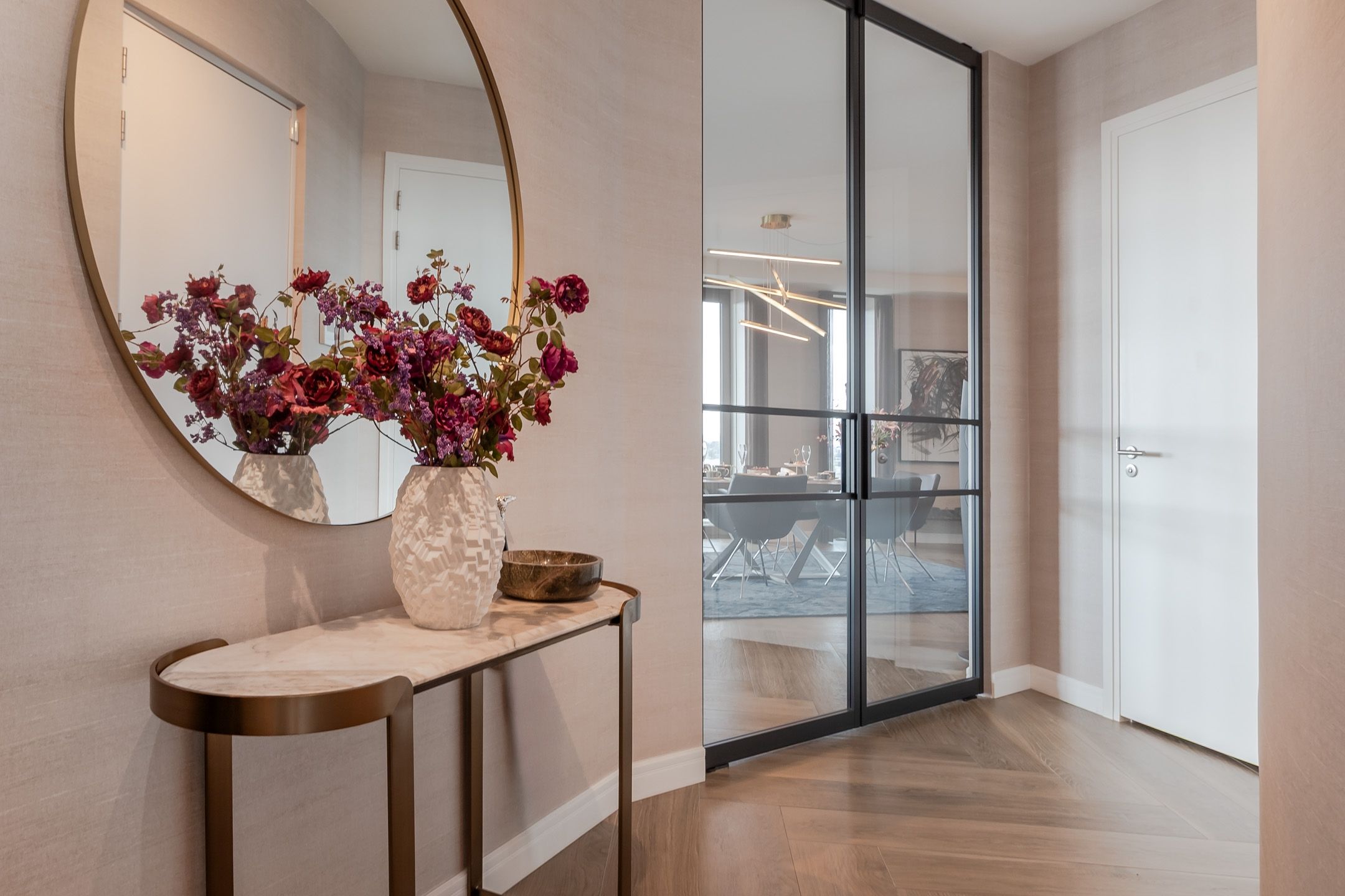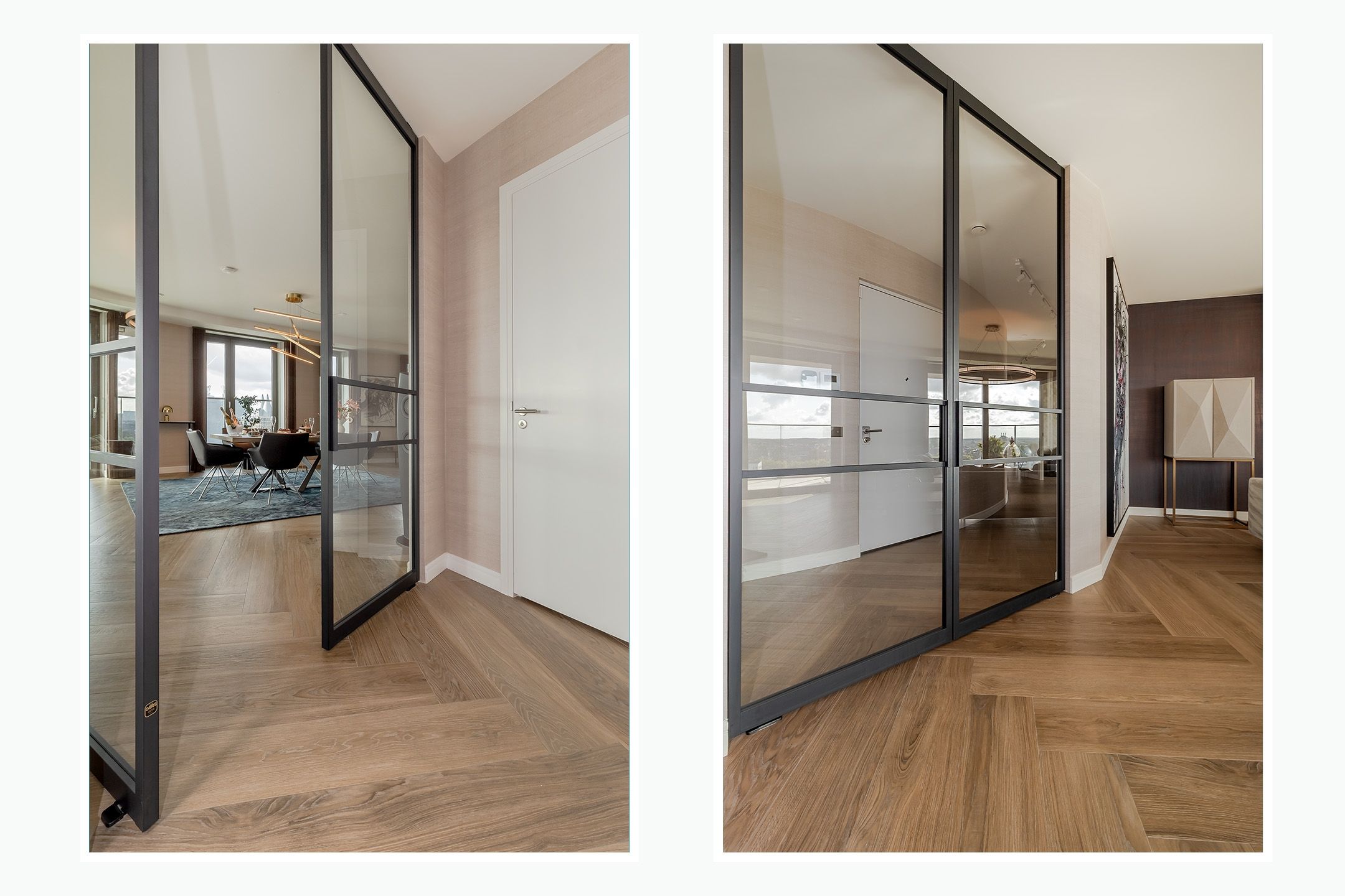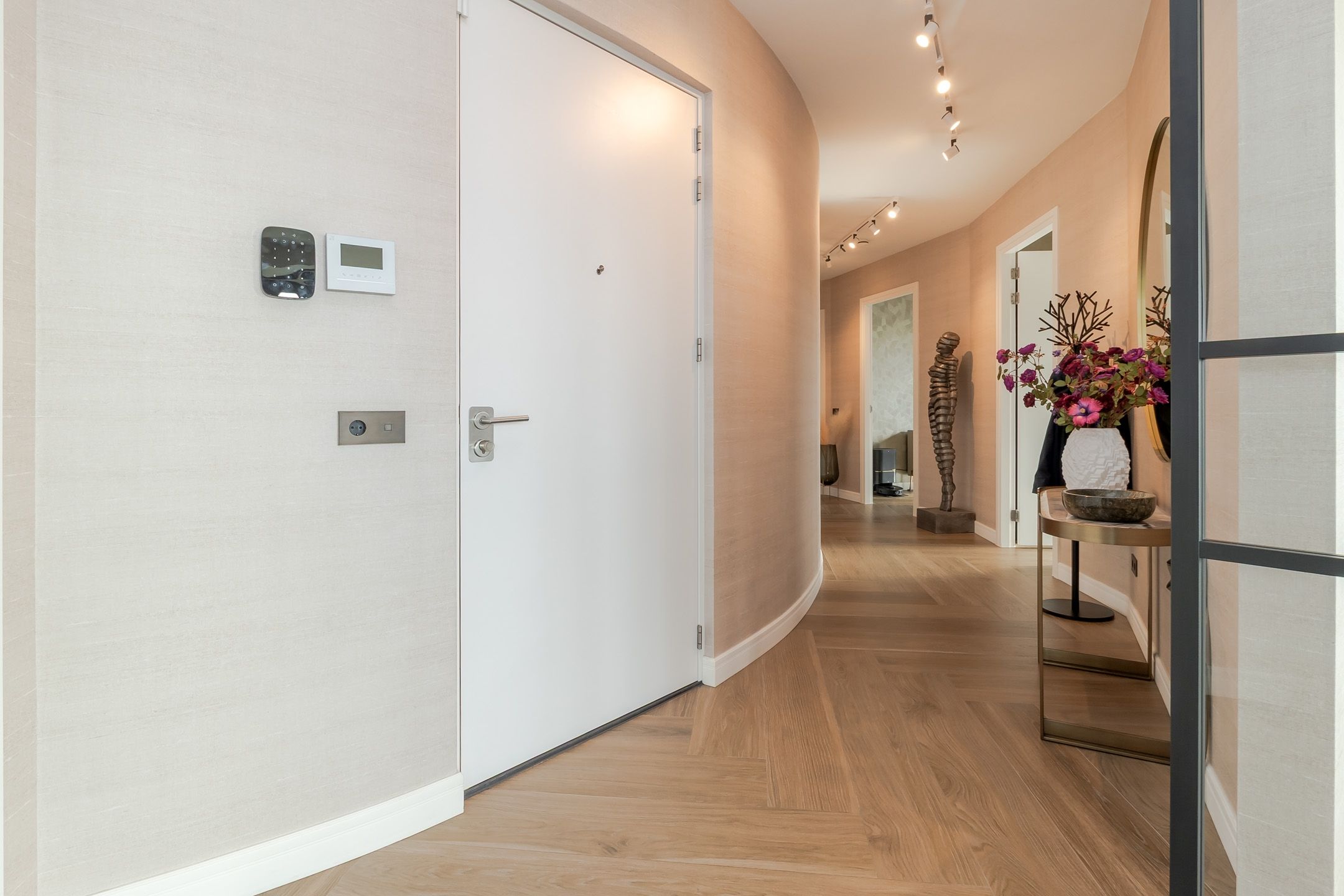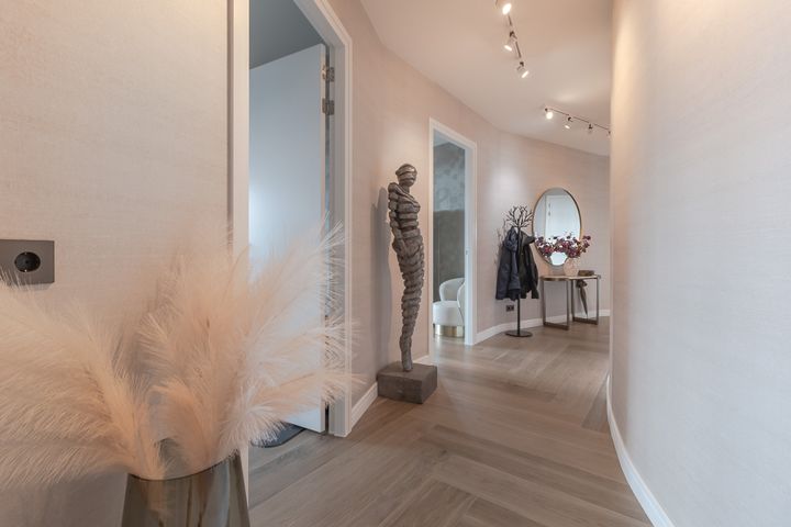 Eenmaal binnen stap je in de halfronde centrale hal, die toegang geeft tot alle ruimtes. Wat meteen opvalt: de strakke afwerking, vloerverwarming (koelen en verwarmen gemiddeld ca. 12 graden verschil in de zomer) door het hele appartement en een warme houtlook tegelvloer.