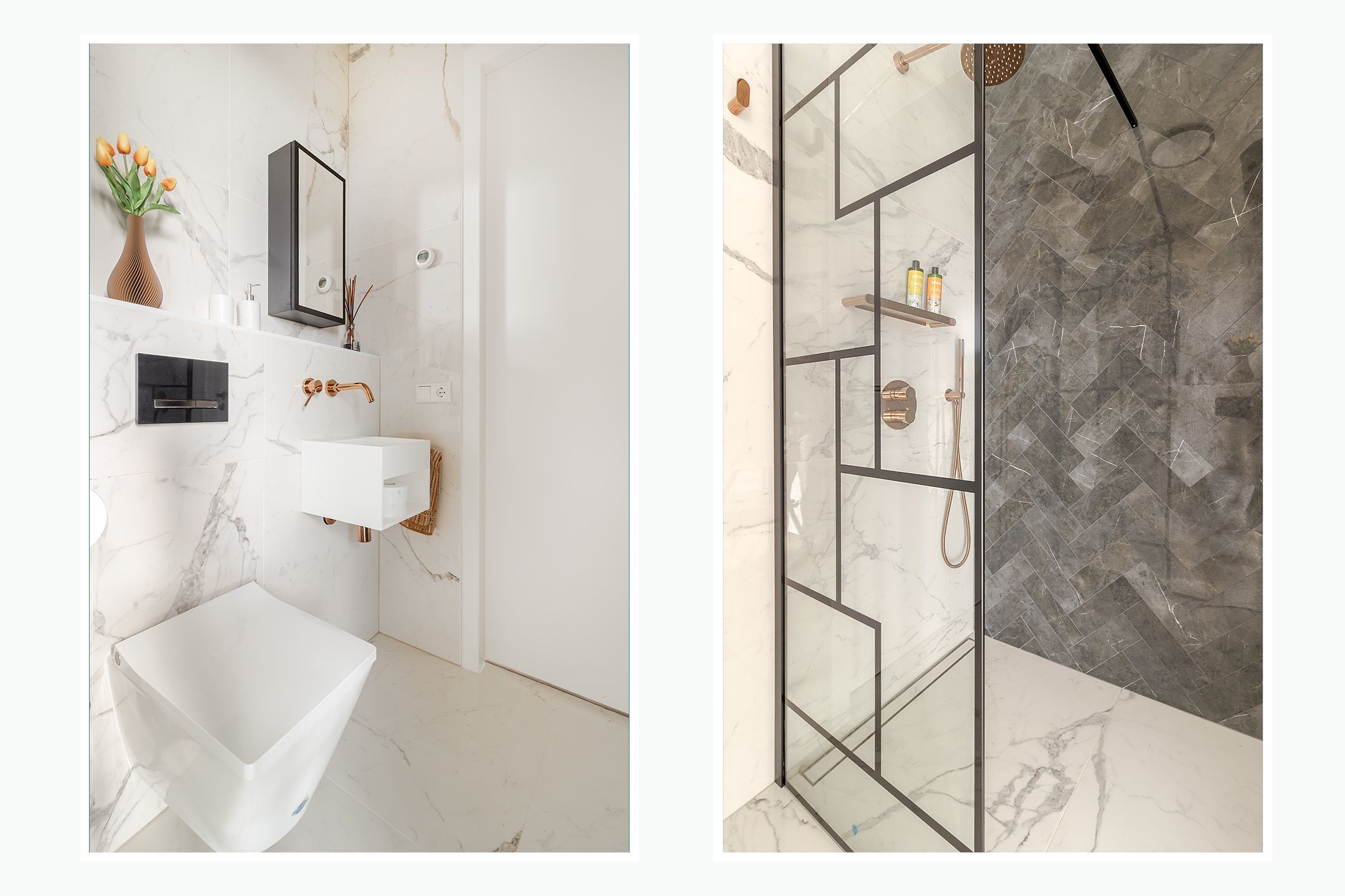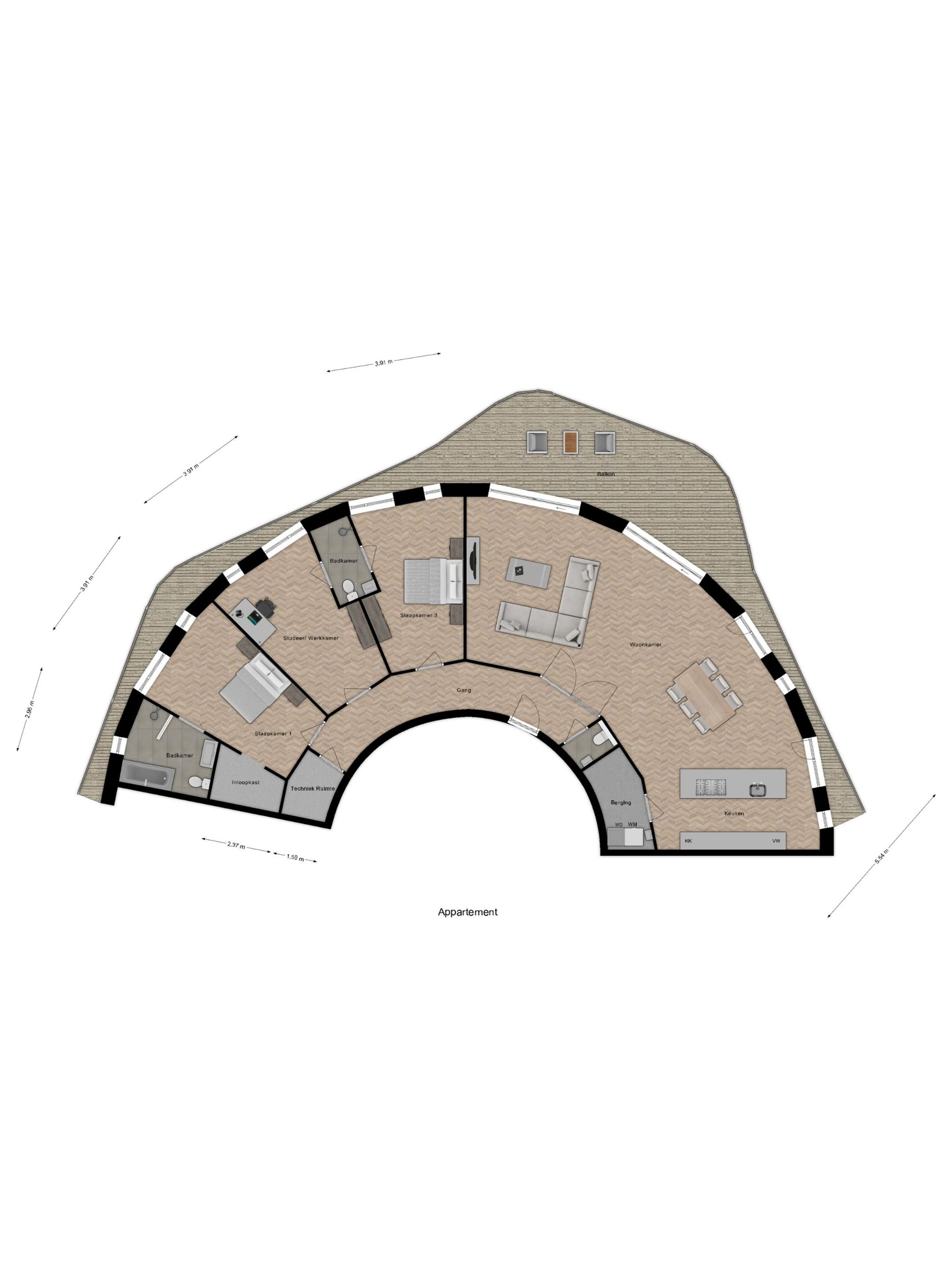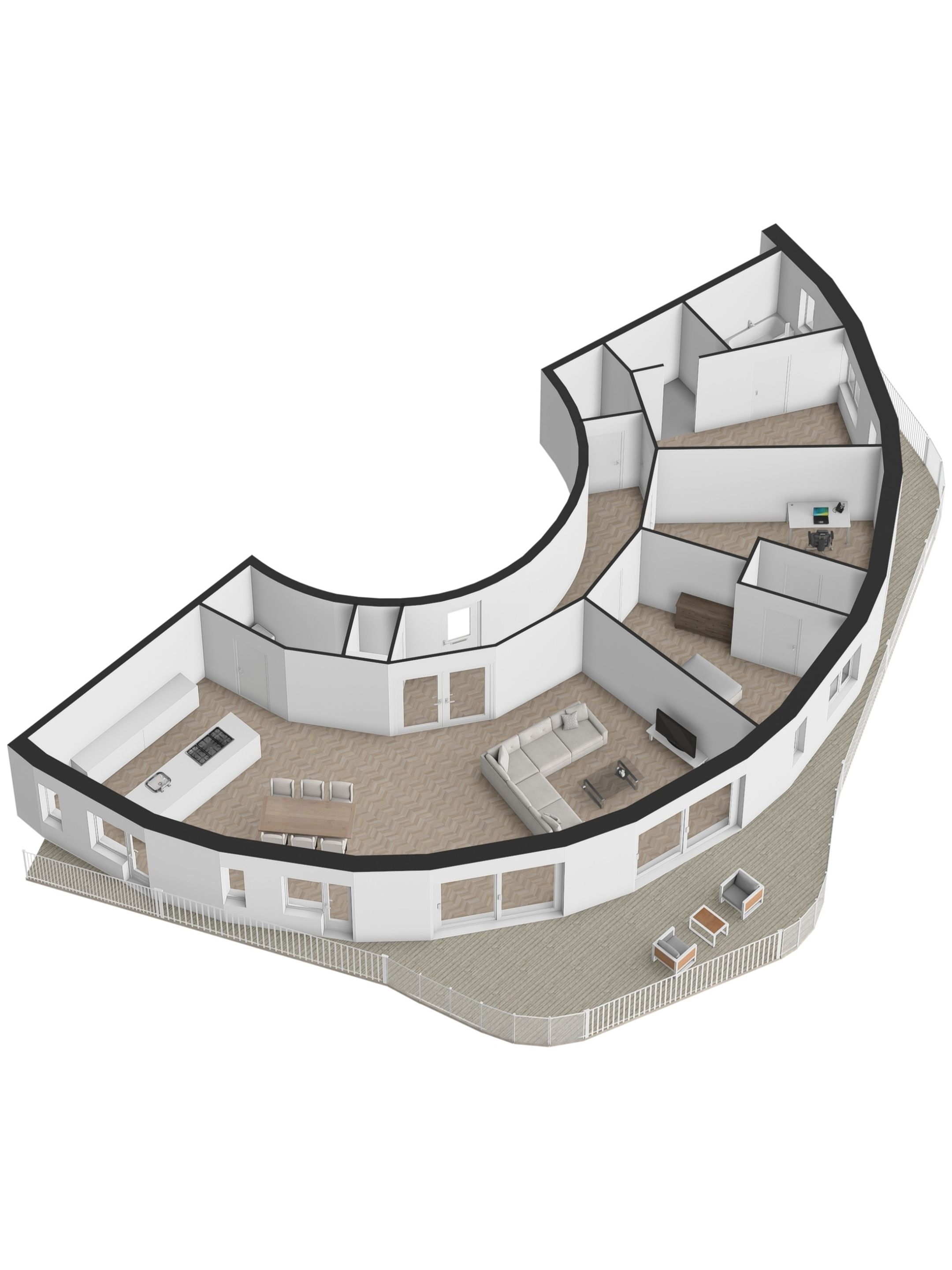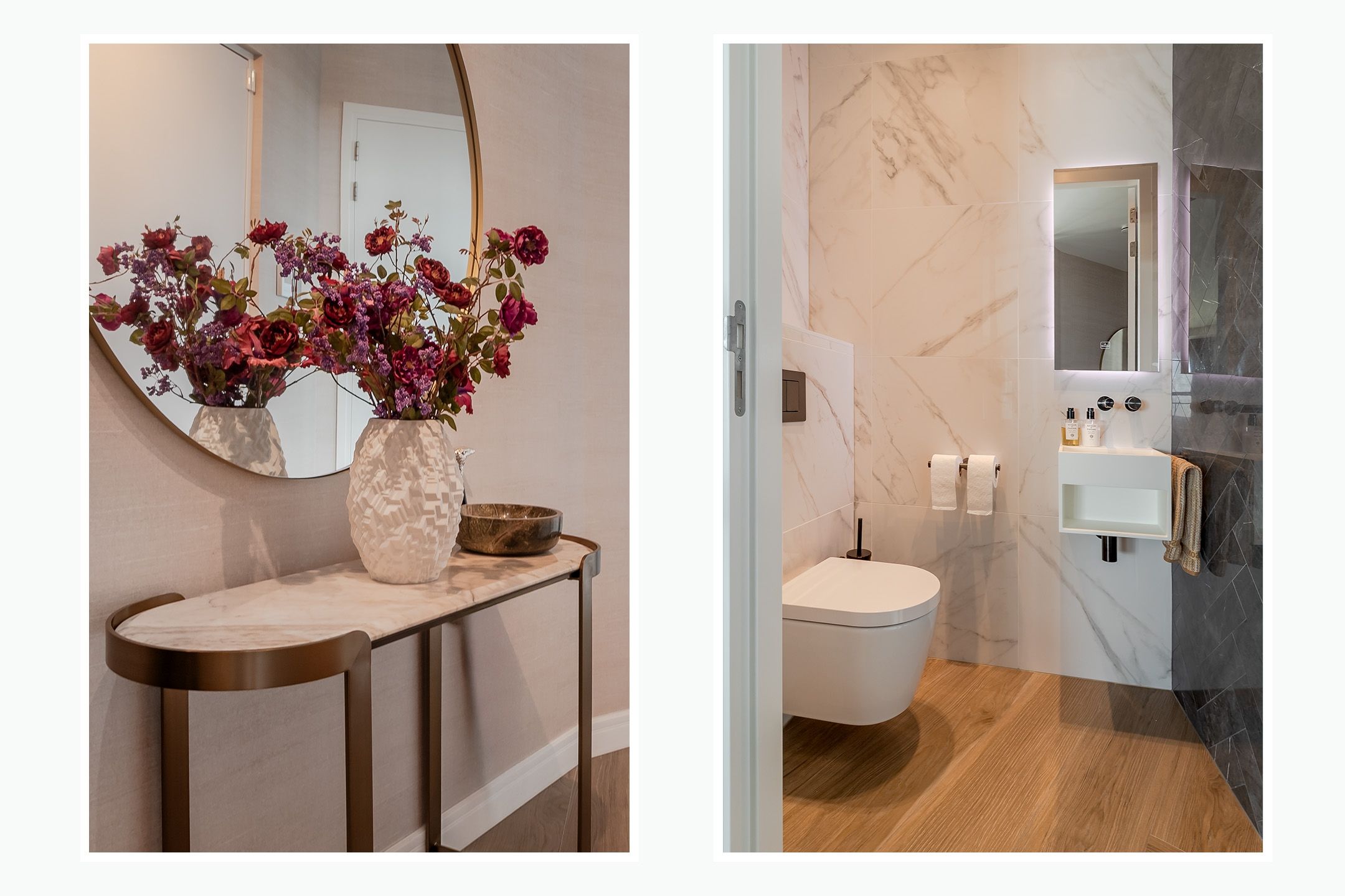 Eenmaal binnen stap je in de halfronde centrale hal, die toegang geeft tot alle ruimtes. Wat meteen opvalt: de strakke afwerking, vloerverwarming (koelen en verwarmen gemiddeld ca. 12 graden verschil in de zomer) door het hele appartement en een warme houtlook tegelvloer.