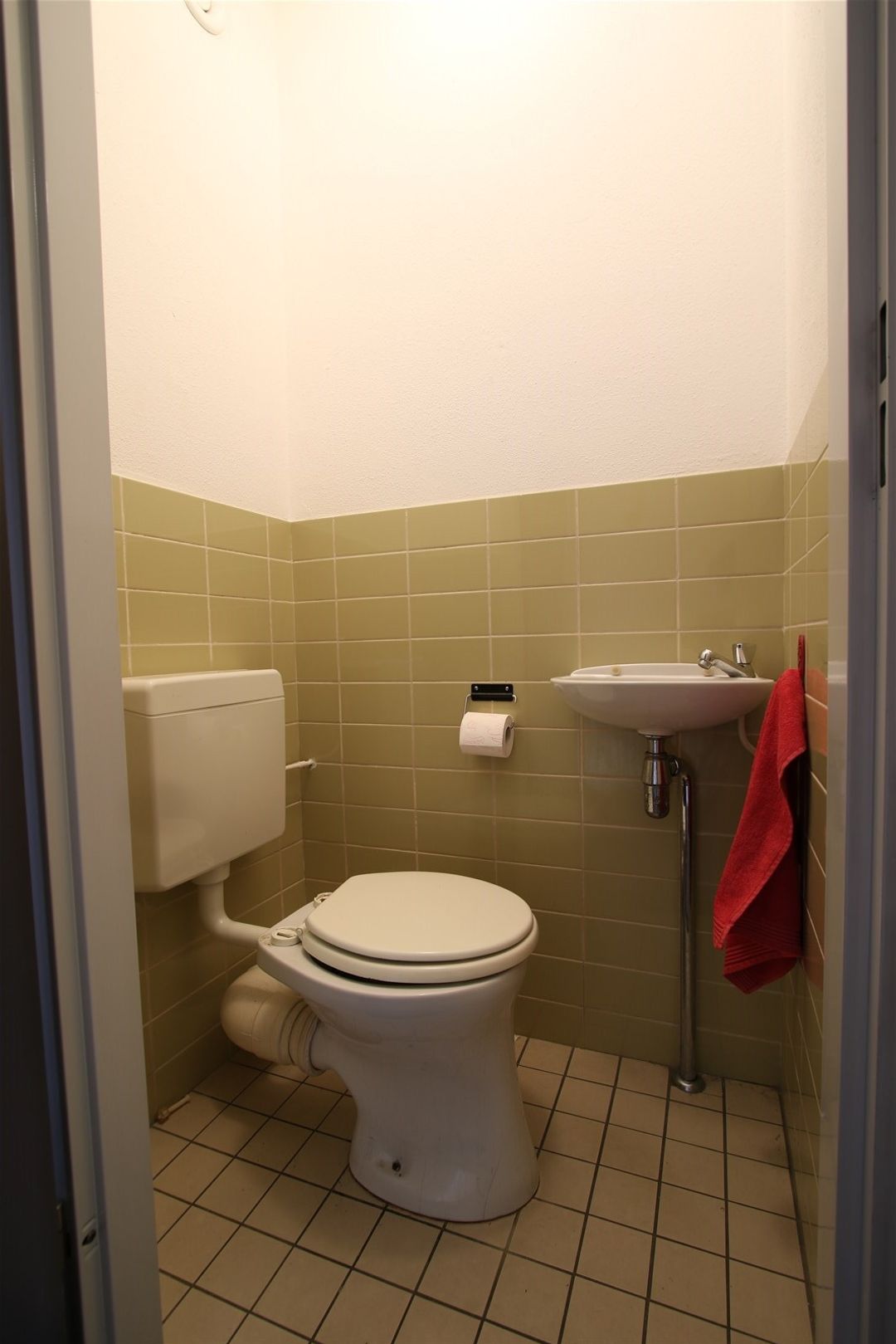 Het separate toilet is voorzien van een toilet, fonteintje en is gedeeltelijk betegeld met een groene wandtegel en een beige vloertegel.