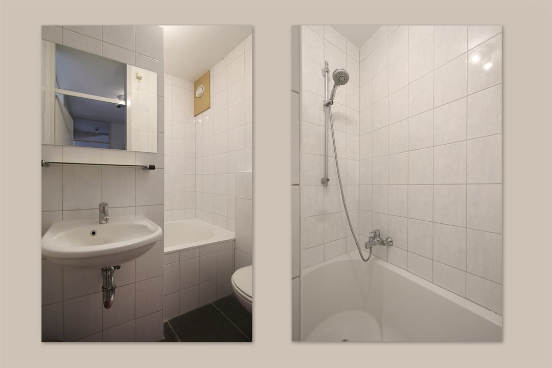 Het bad is afgescheiden met een muur voor de vaste wastafel.
