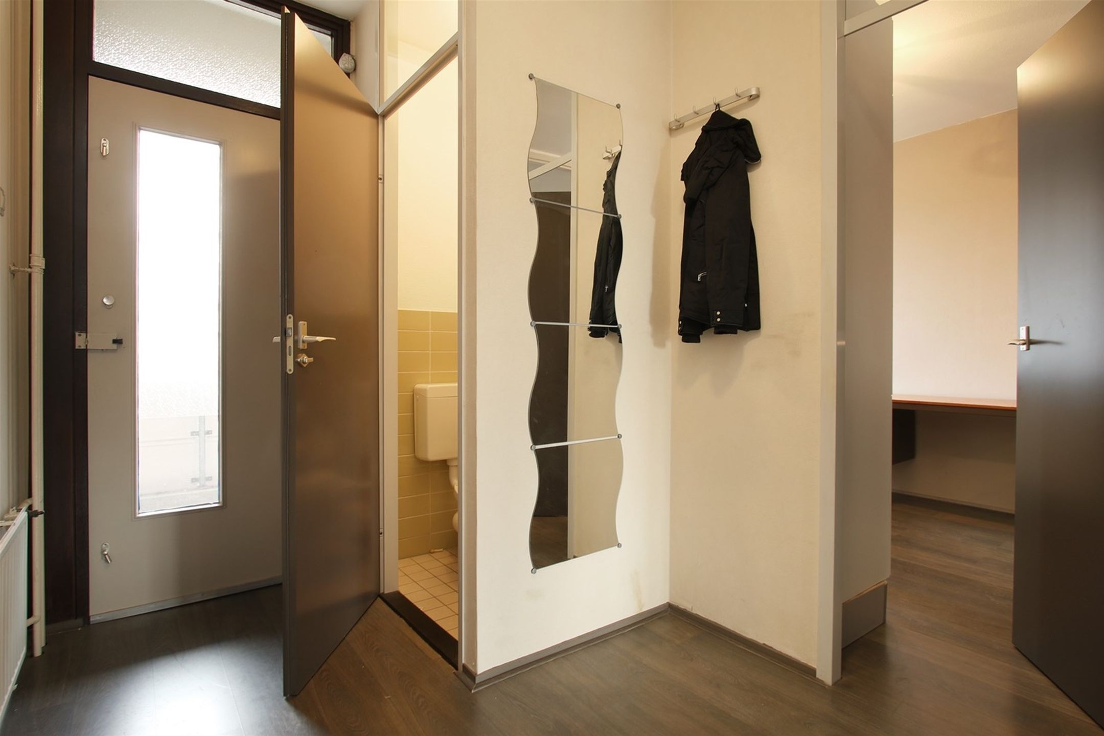 De hal, voorzien van laminaatvloer, biedt toegang tot de toiletruimte, woonkamer, keuken en bergkast.