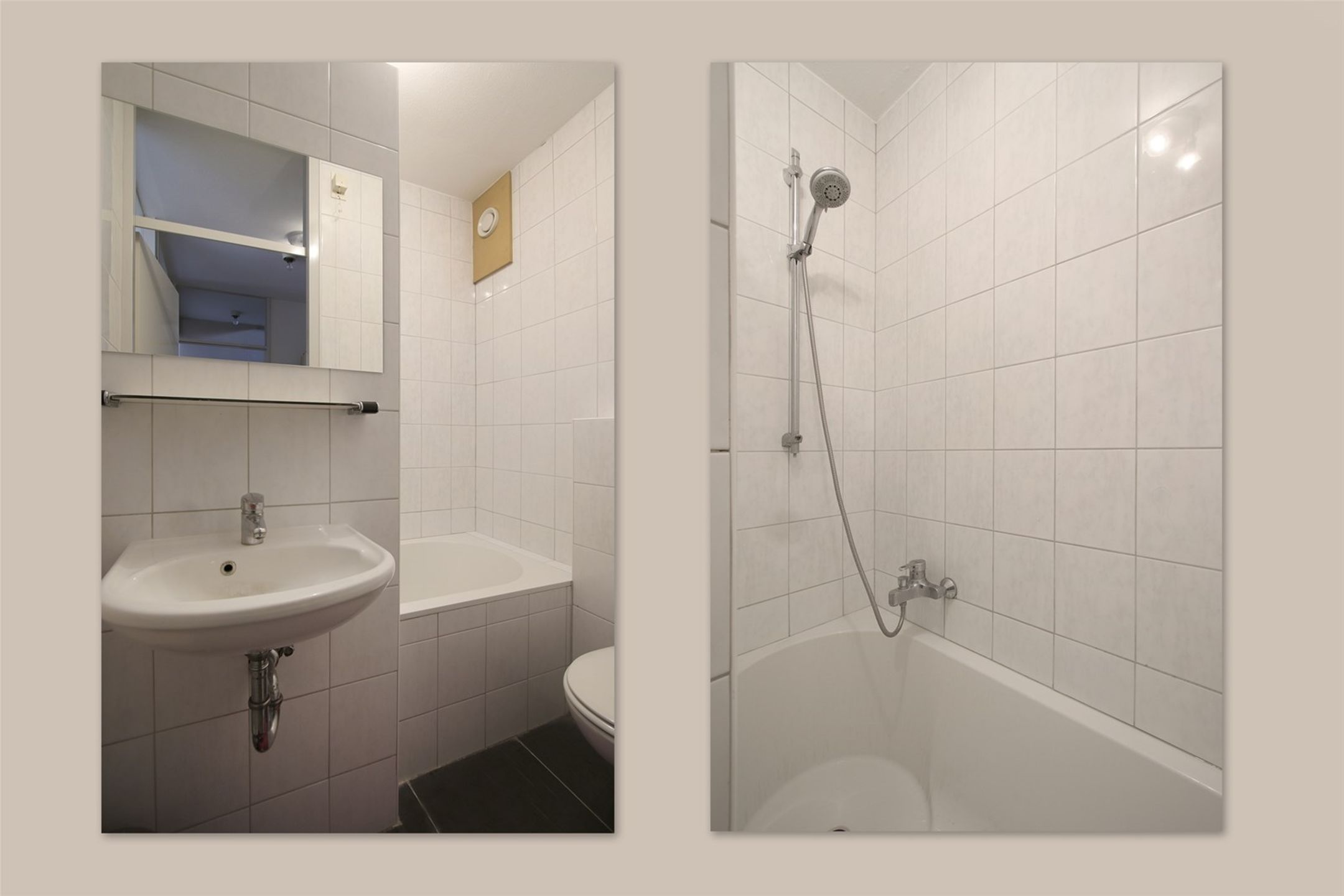 Op de overloop is de toegang tot de moderne, badkamer met bad, douchen kan in het sta gedeelte van het bad.