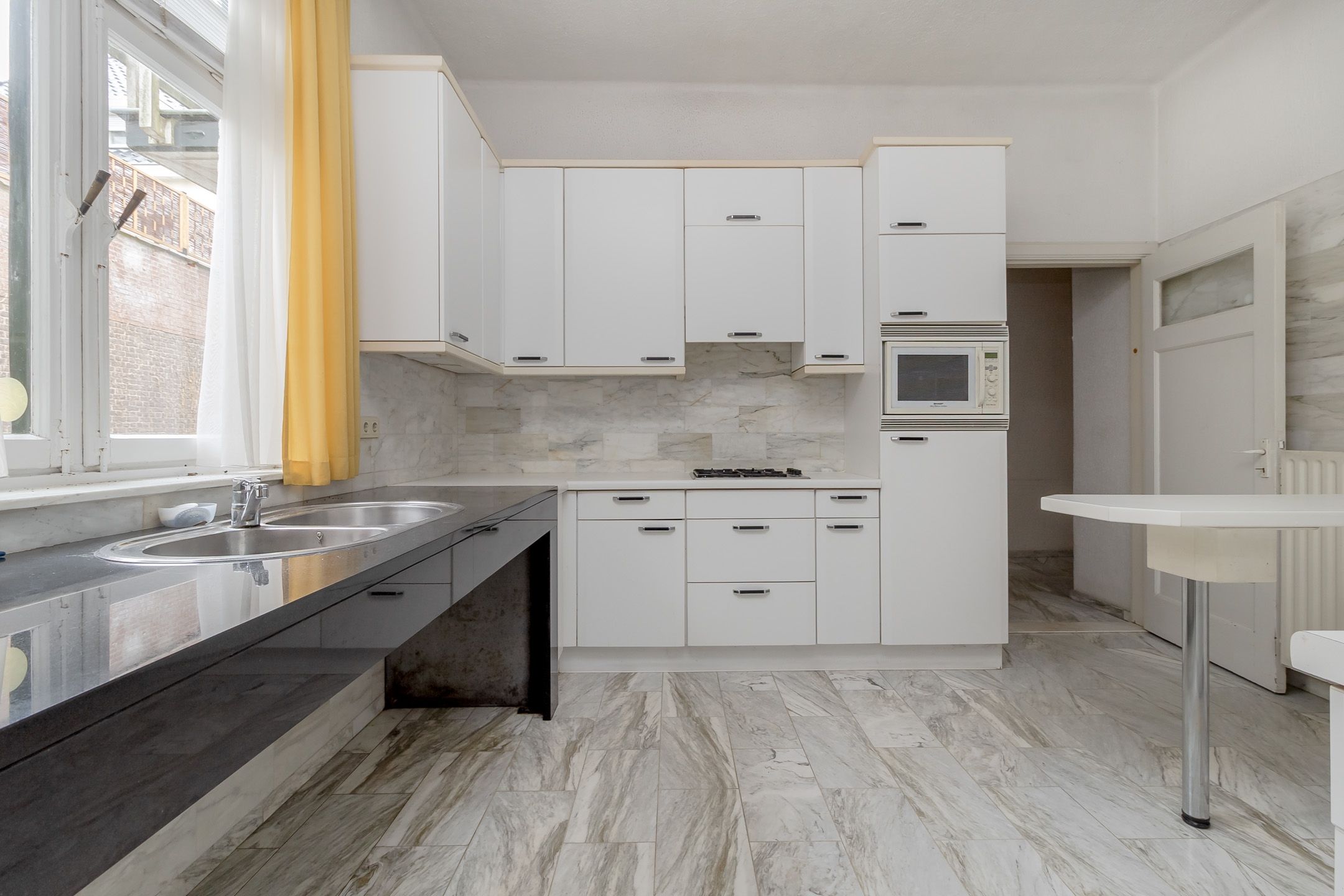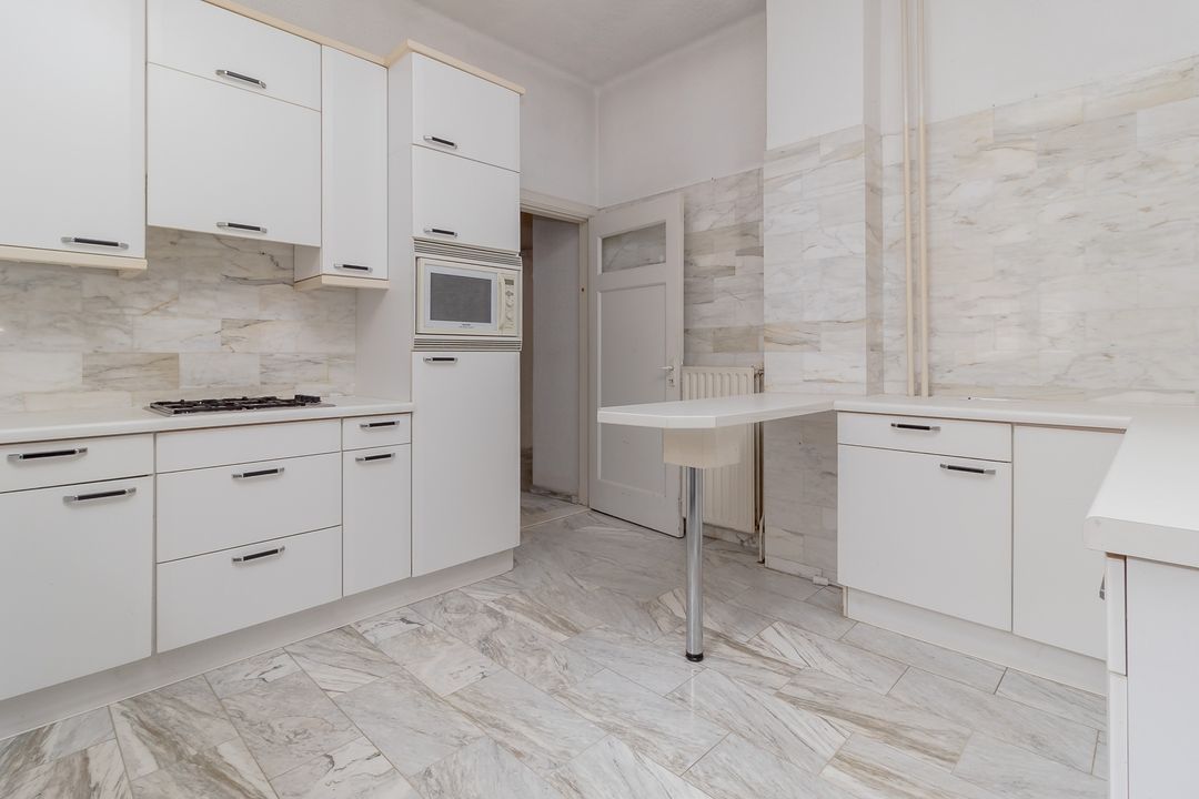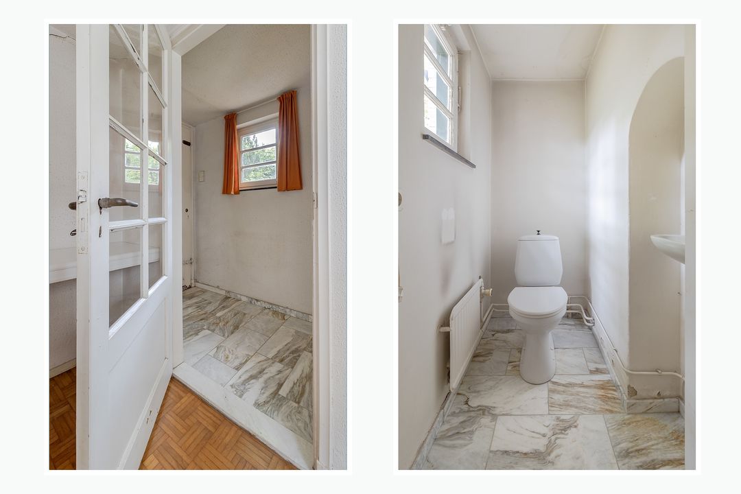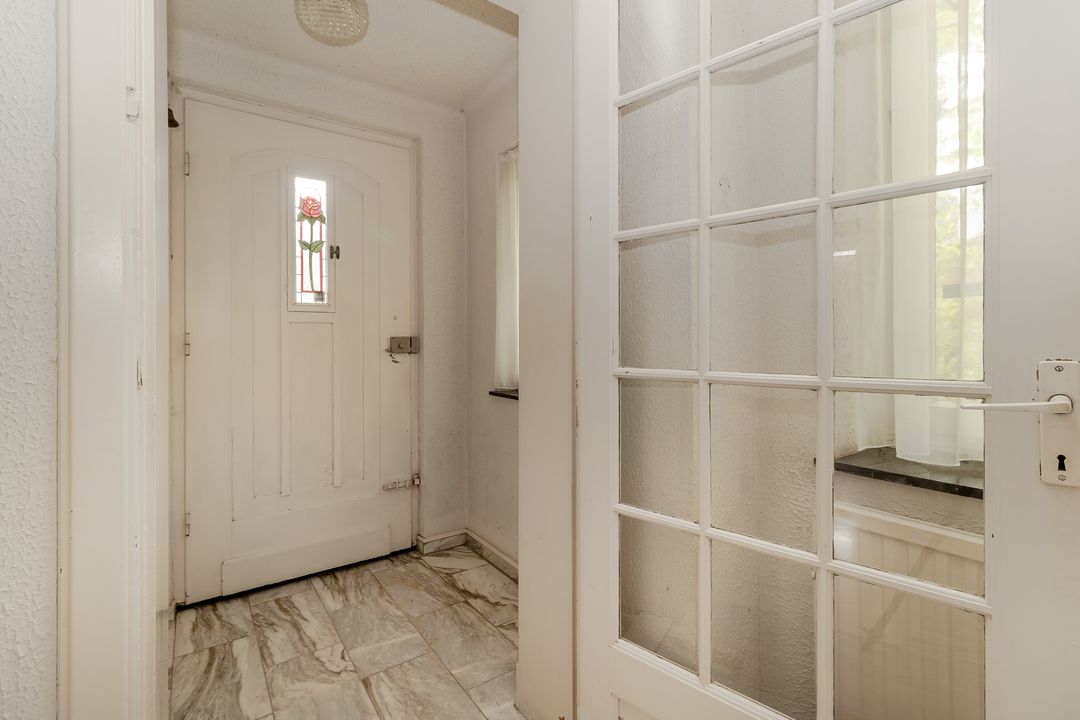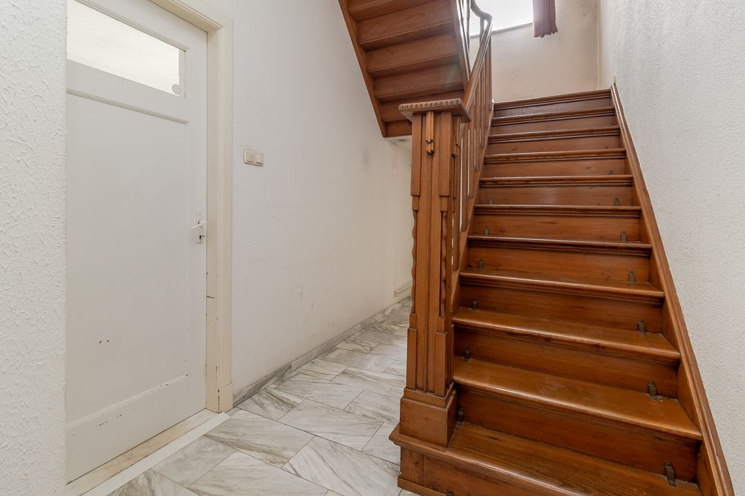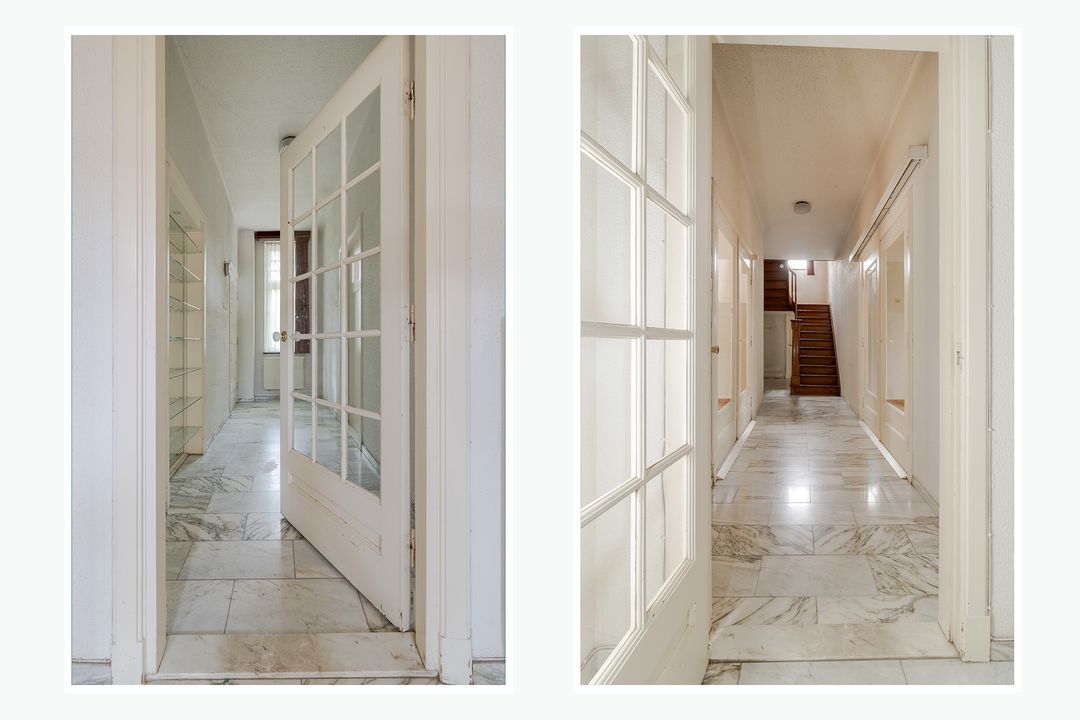 Via de statige voortuin stap je binnen in de hal met originele marmeren vloeren. Via de lange gang kom je in de woonkamer aan de voor- en achterkant, de keuken, het toilet, de kelder en bij de fraaie trapopgang.