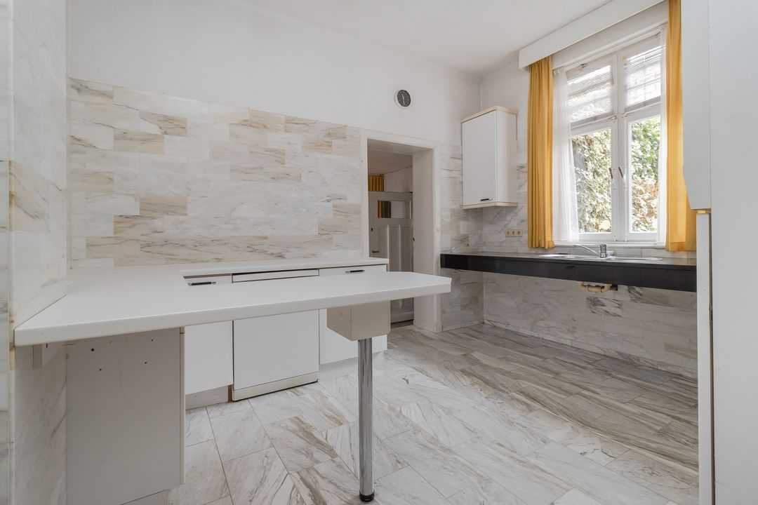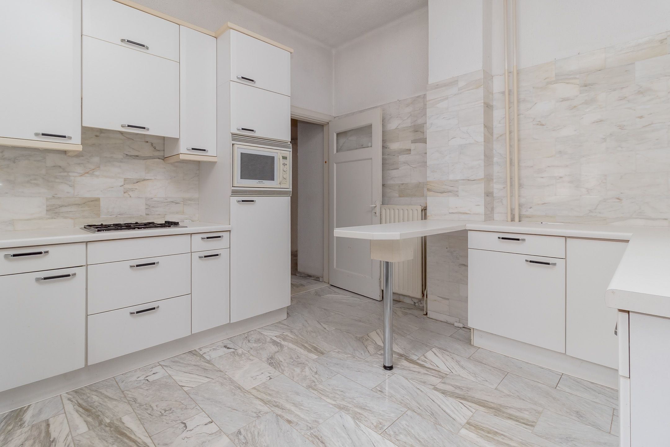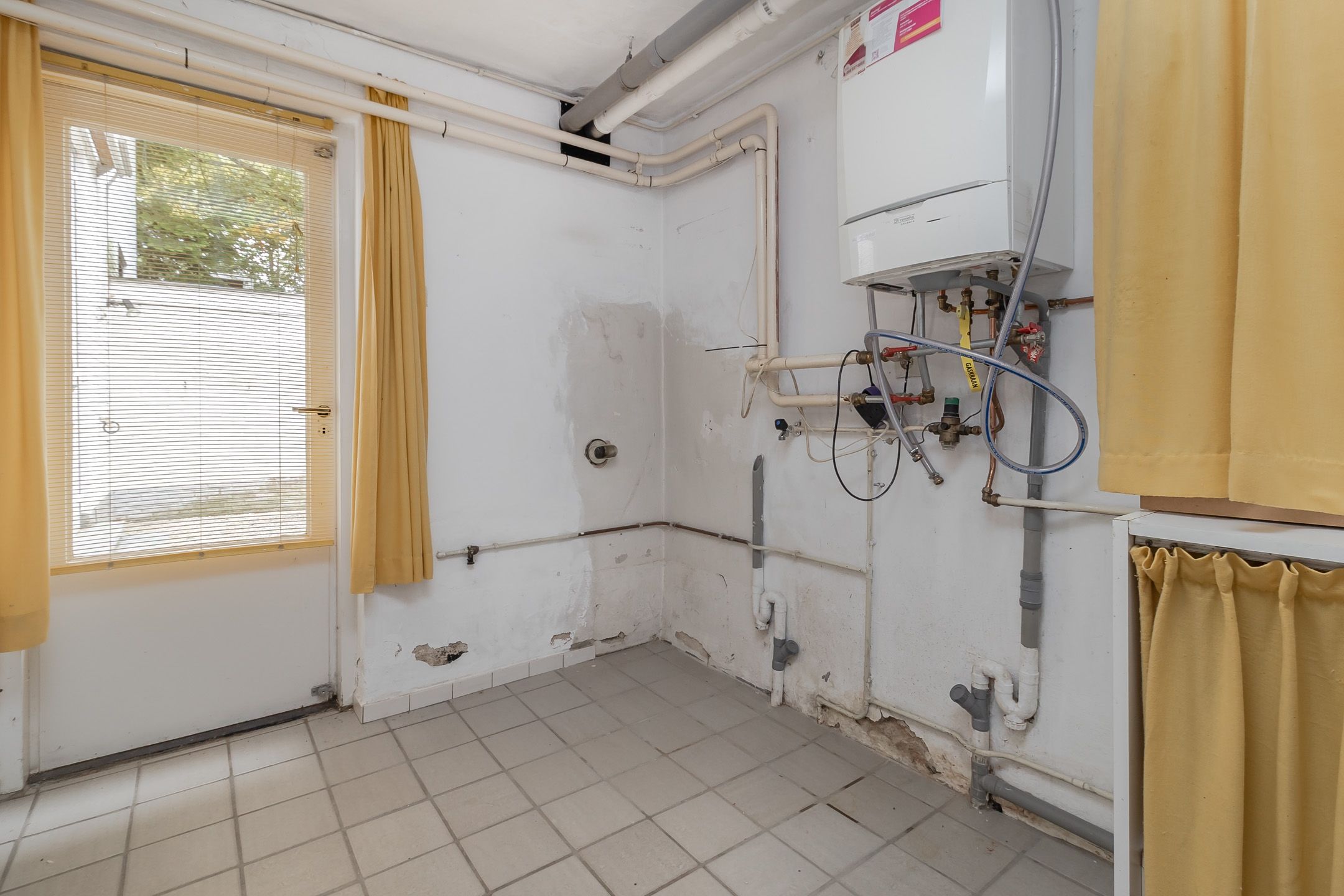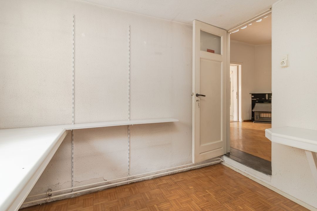 De keuken ligt aan de achterkant en heeft nu een functionele witte jaren ’70 inrichting. Via de keuken kom je in de bijkeuken. Hier zijn de aansluitingen van de wasmachine en droger.