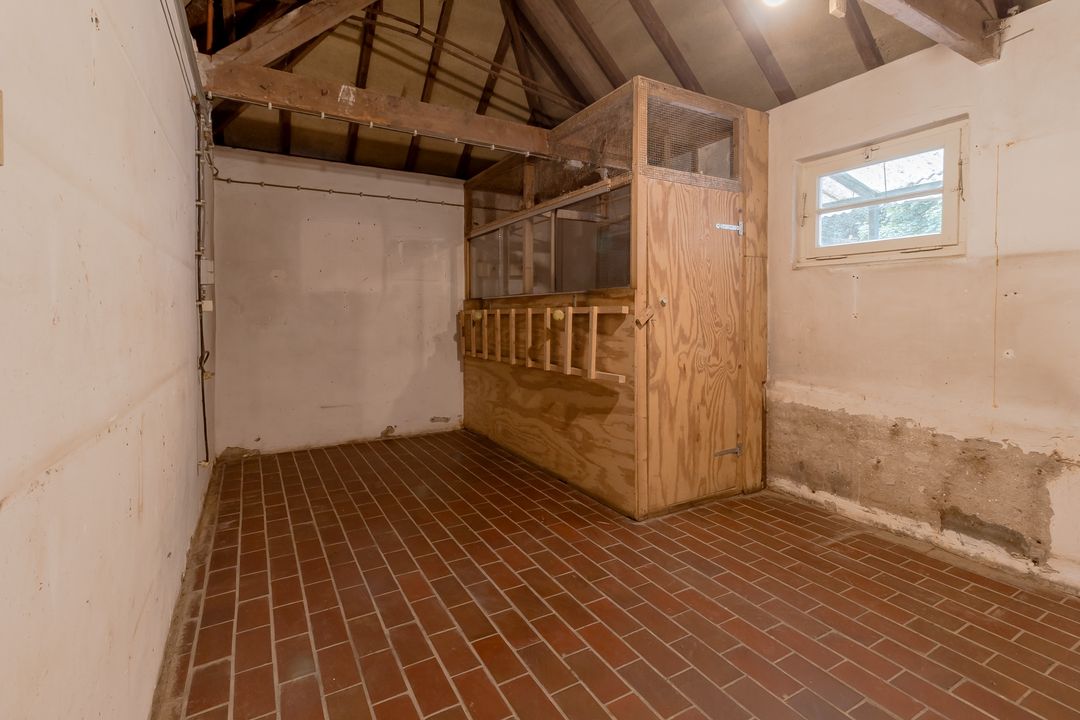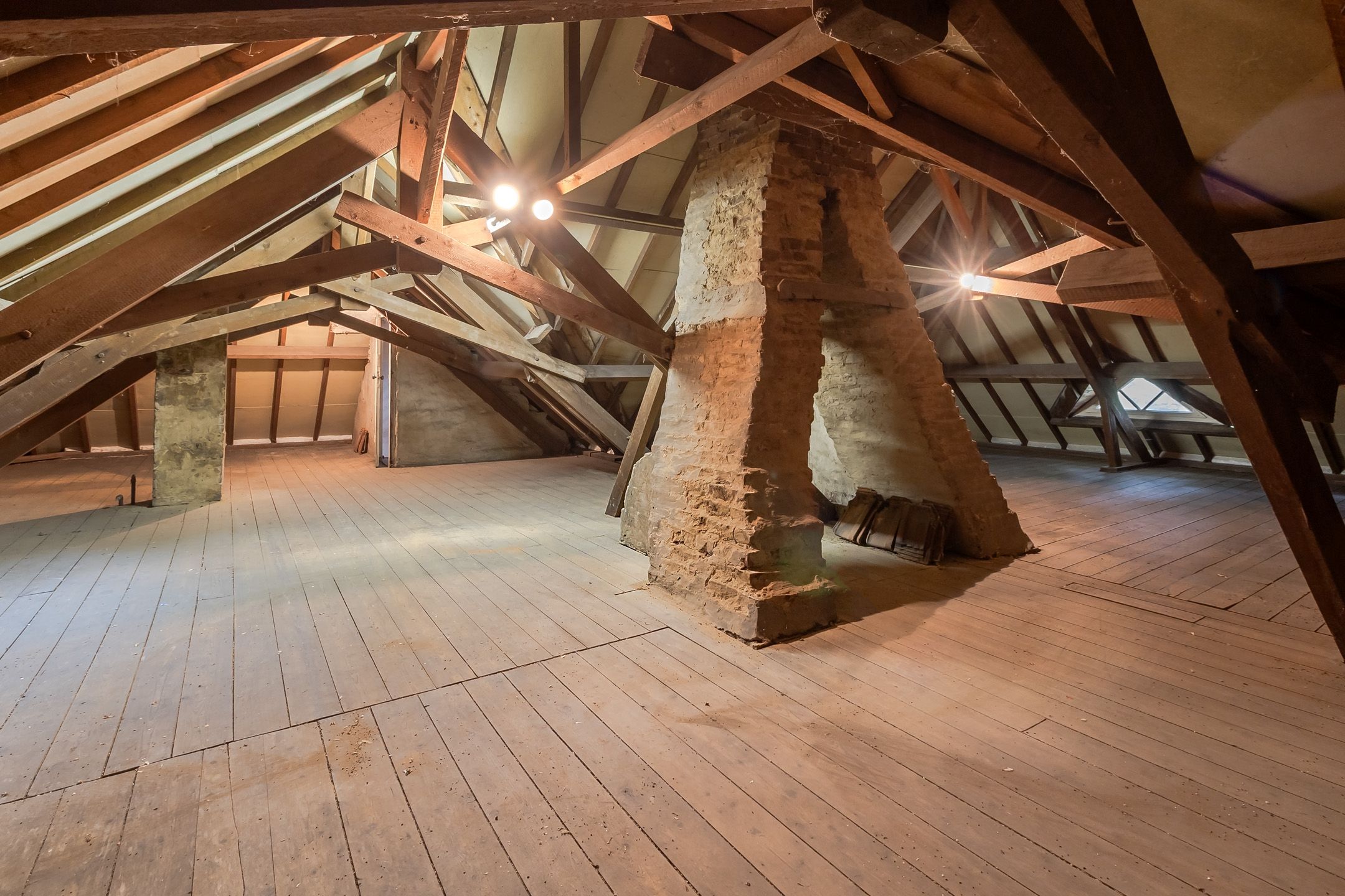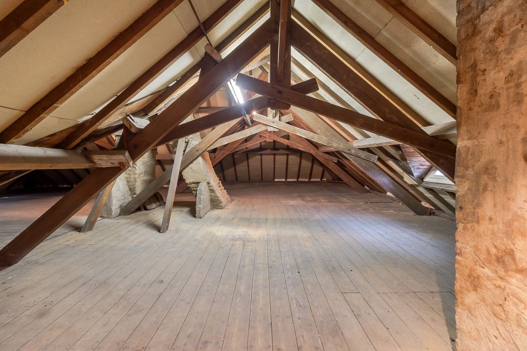 Op de ruime zolder vallen meteen de authentieke houten balken op en het prachtige spant.