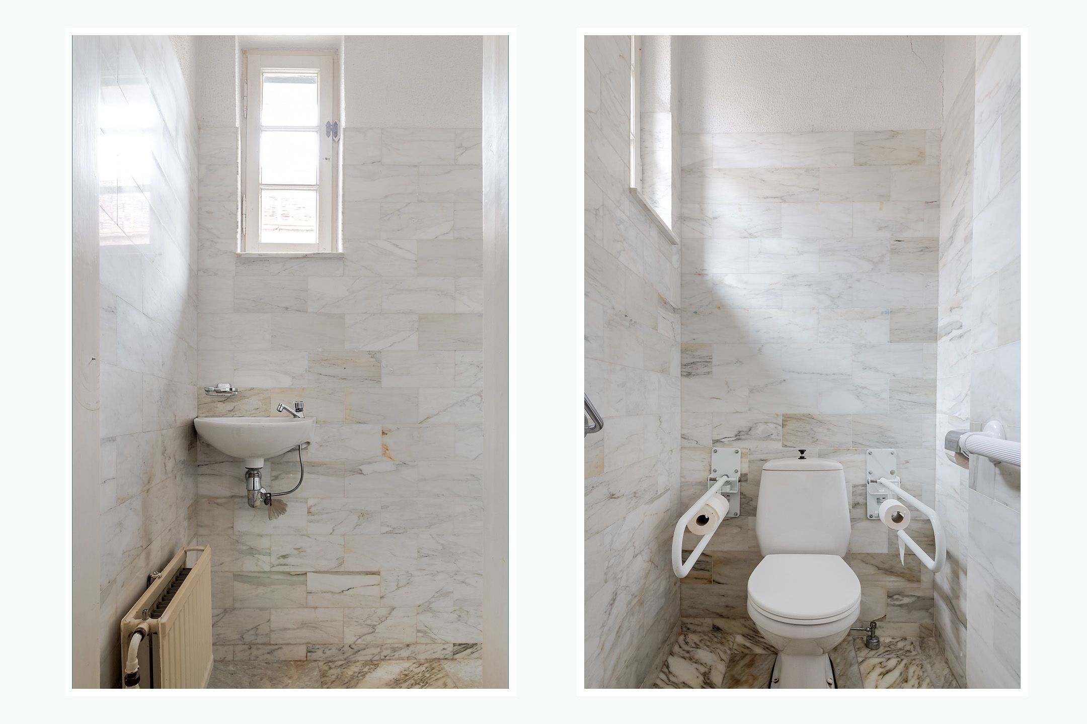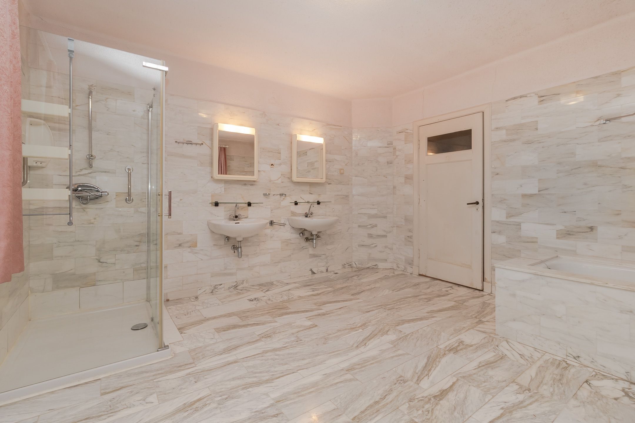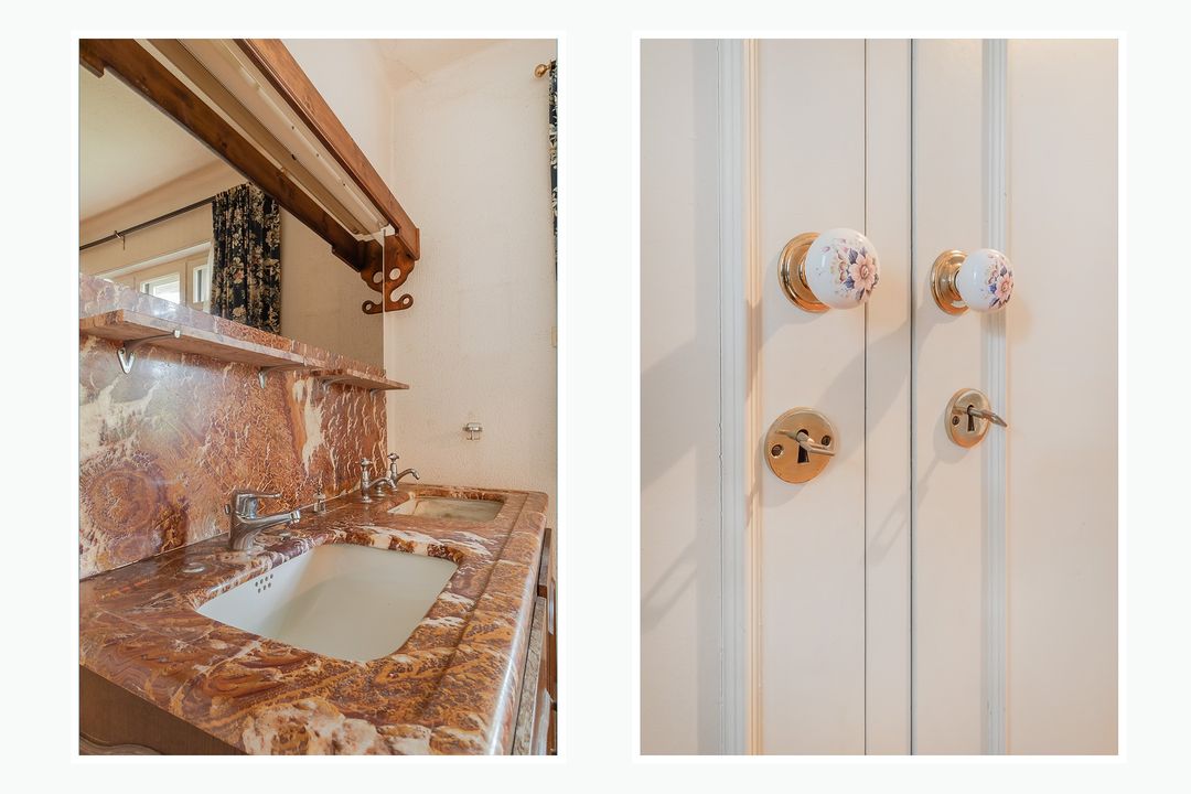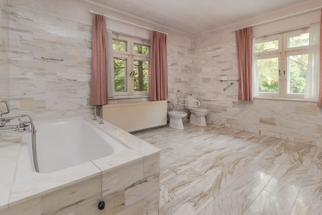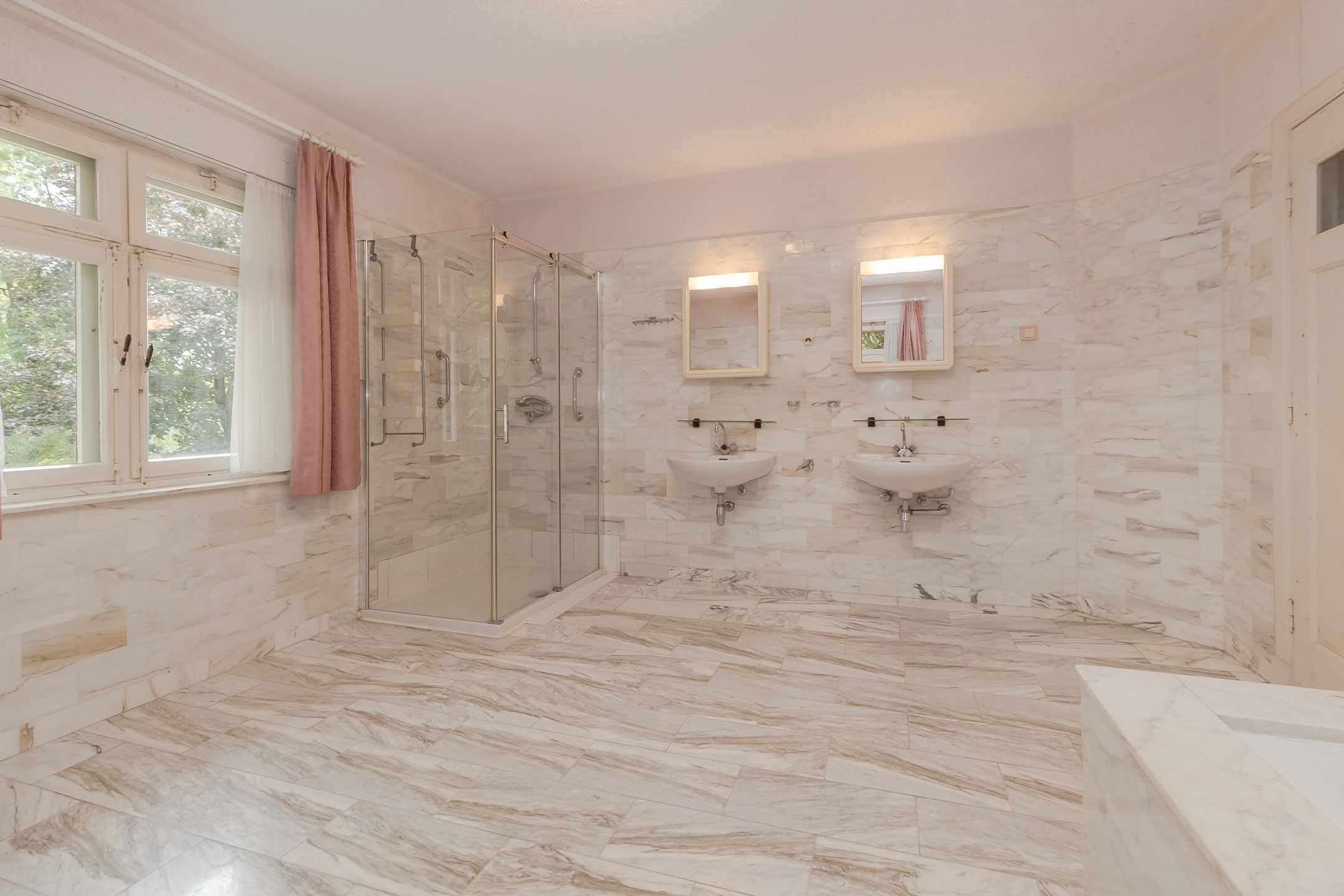 De badkamer is in originele jaren ’80 stijl, met wit sanitair en marmeren wand- en vloertegels. Een ligbad, toilet, bidet, douche en 2 aparte wastafels maken deze ruimte compleet.