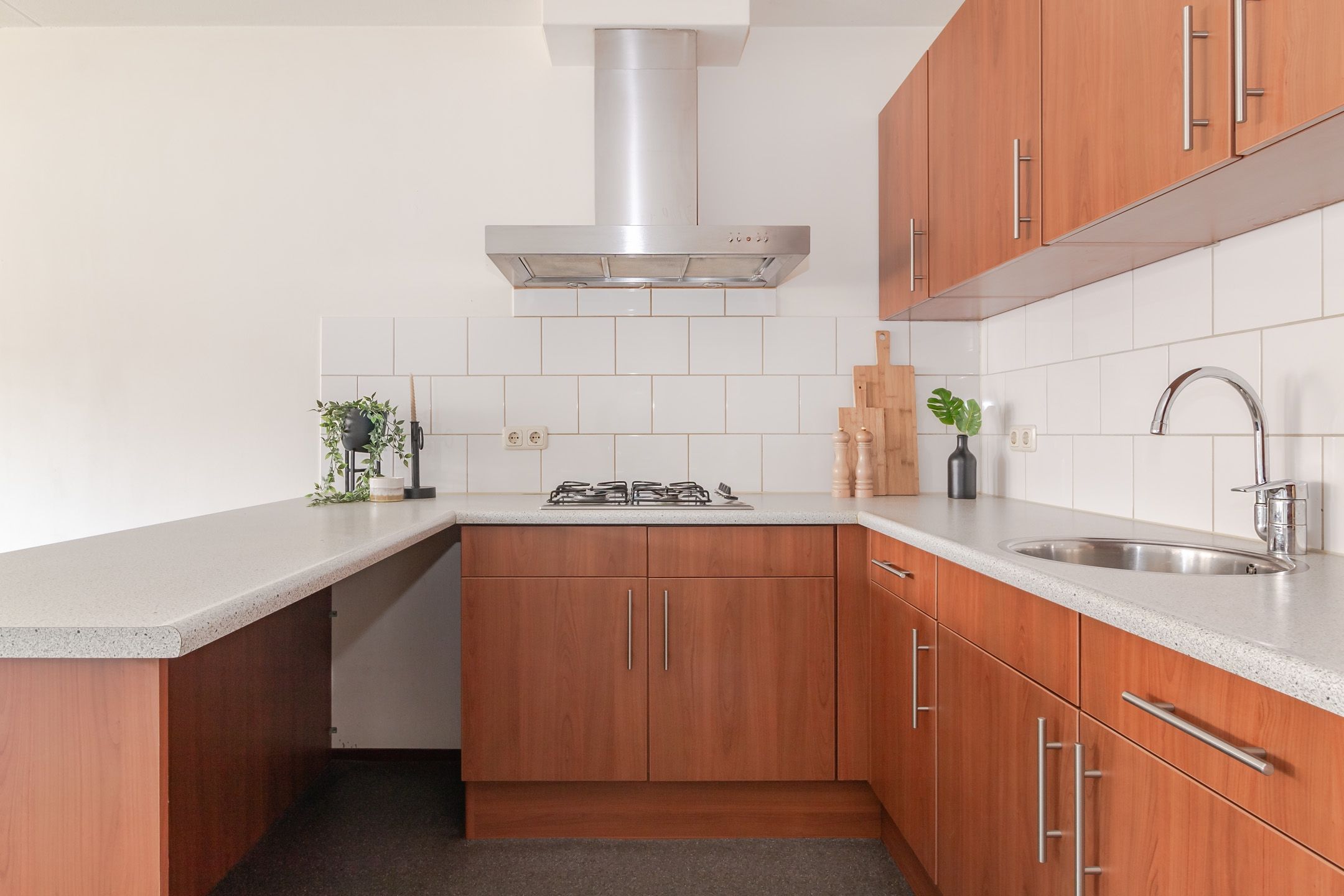 De U vormige keukenopstelling heeft warm donker houten kastfronten met rvs handgrepen en een grijs/wit aanrechtblad.