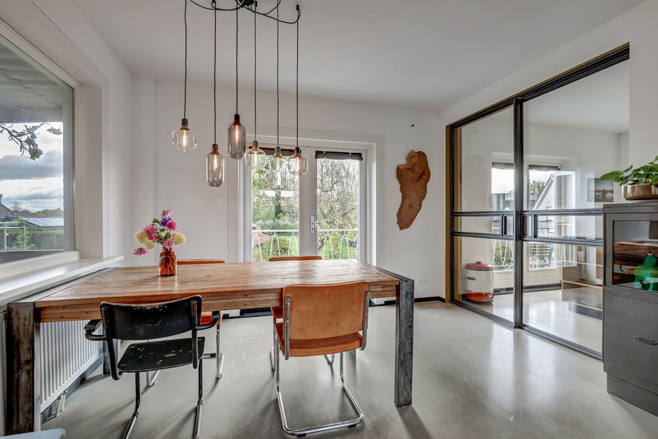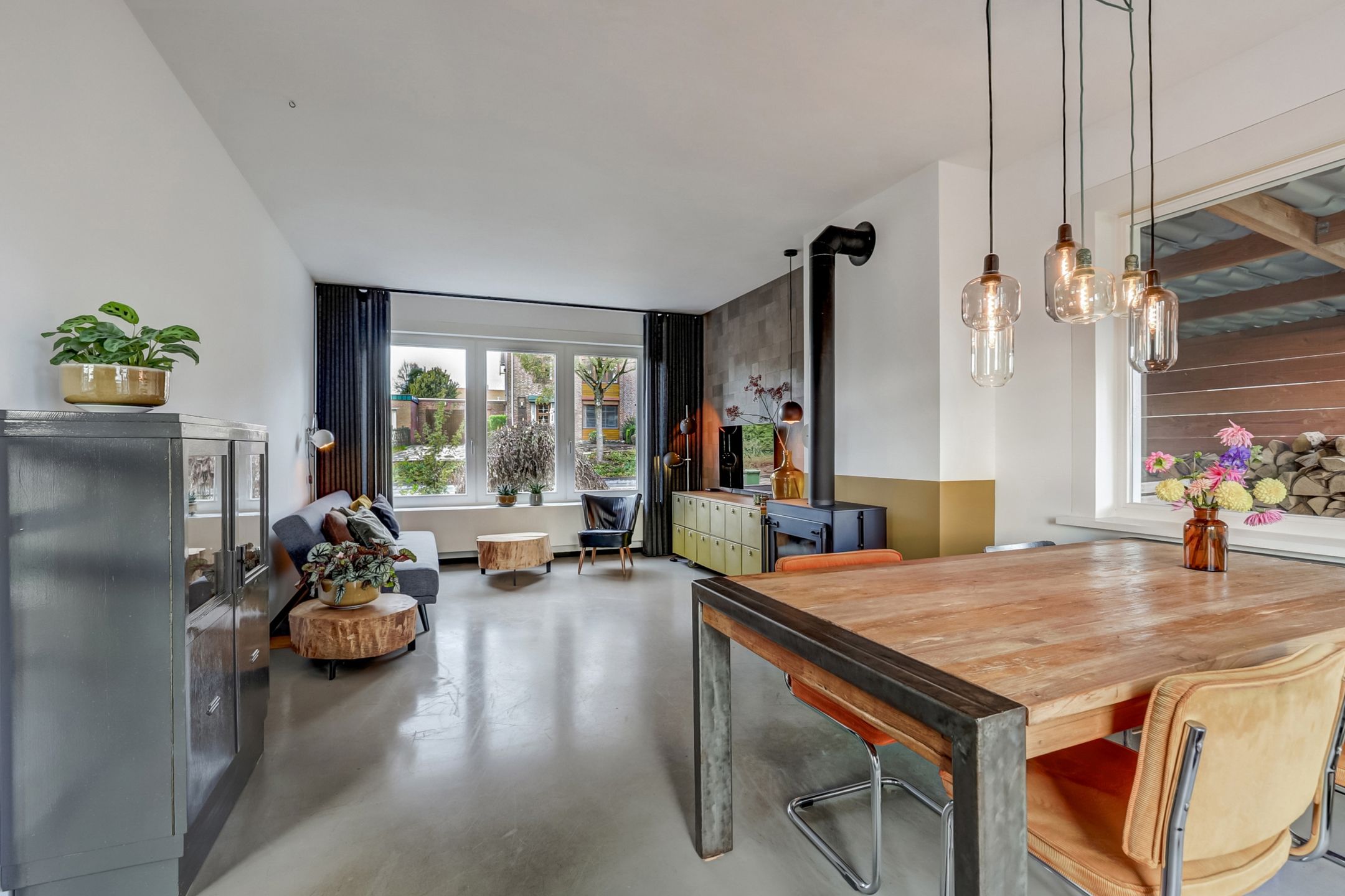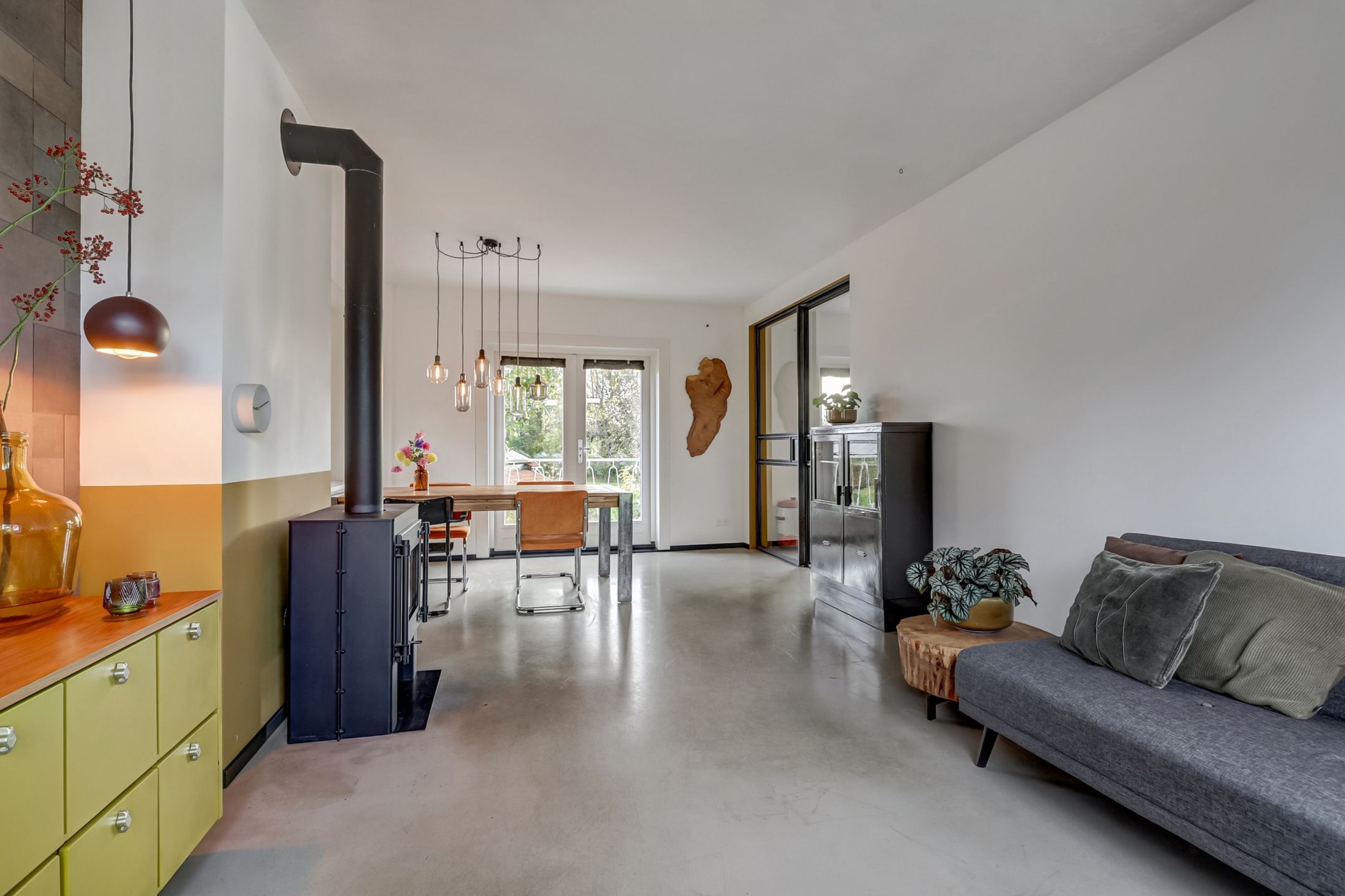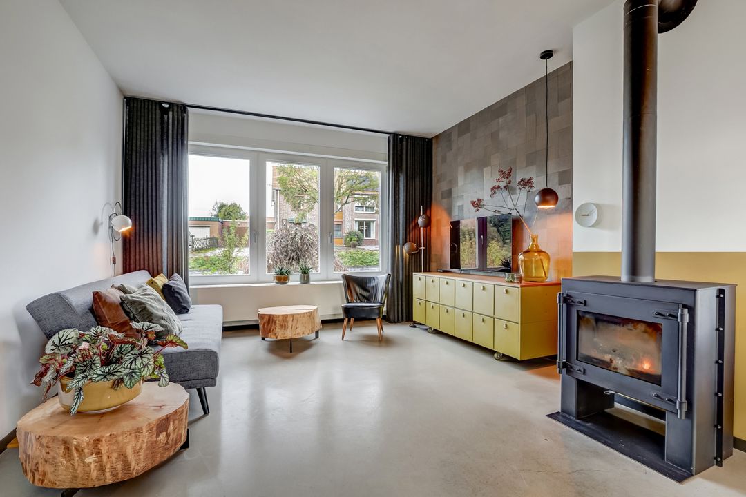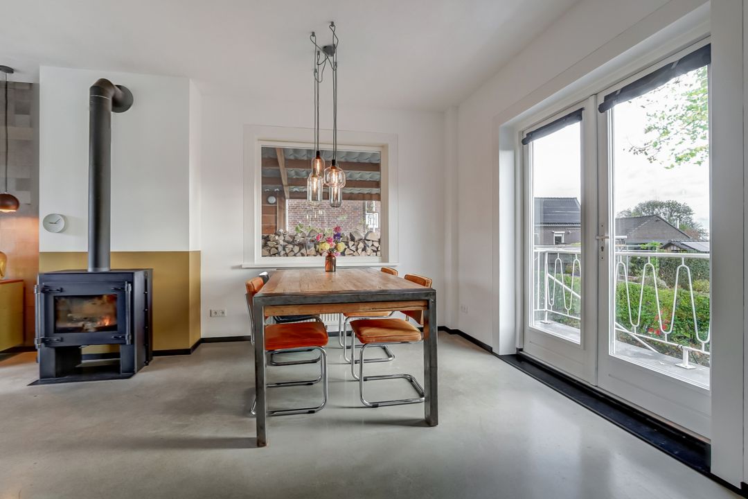De woonkamer is van de keuken gescheiden door stalen schuifdeuren, die perfect aansluit bij de industriële deur naar de hal. Deze subtiele afscheiding zorgt voor een mooie verbinding tussen de ruimtes terwijl het open en licht blijft. De woonkamer straalt warmte en gezelligheid uit. Er is voldoende ruimte voor een grote eettafel en een comfortabel zitgedeelte rond de houtkachel waar je heerlijk kunt ontspannen bij het knisperende vuur. Aan de voorzijde zorgen de grote raampartijen met twee draaikiepvensters voor veel natuurlijke lichtinval terwijl ook aan de achterzijde openslaande deuren naar het balkon toegang geven tot het buitenleven en het mooie uitzicht. De wanden zijn strak gestuct en één wand springt er echt uit: deze is bekleed met leren wandbekleding in een stijlvol patroon wat de ruimte een unieke uitstraling geeft. Een extra pluspunt: er is een tweede rookkanaal aanwezig bij de muur tussen de keuken en woonkamer wat de mogelijkheid biedt voor een tweede kachel of haard.
