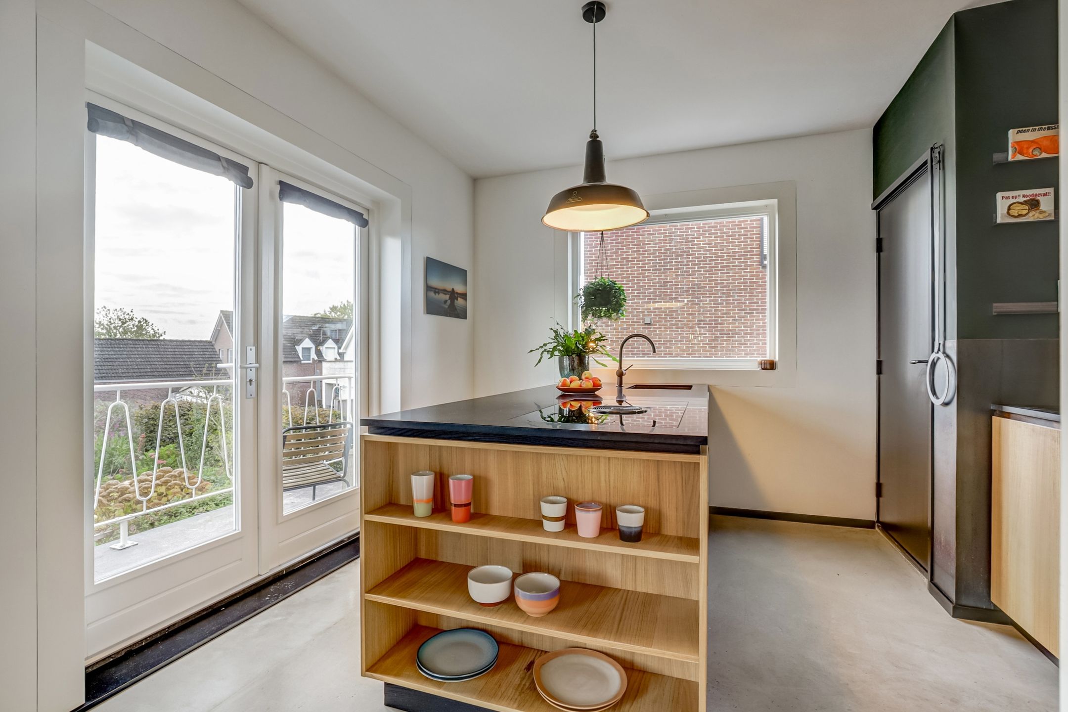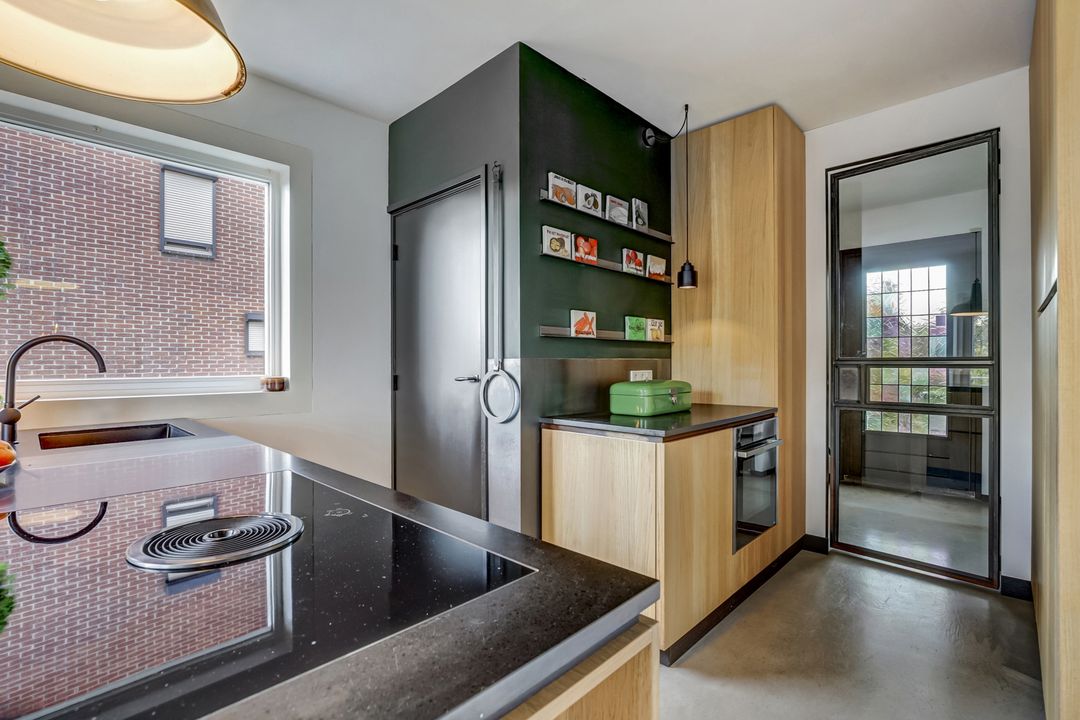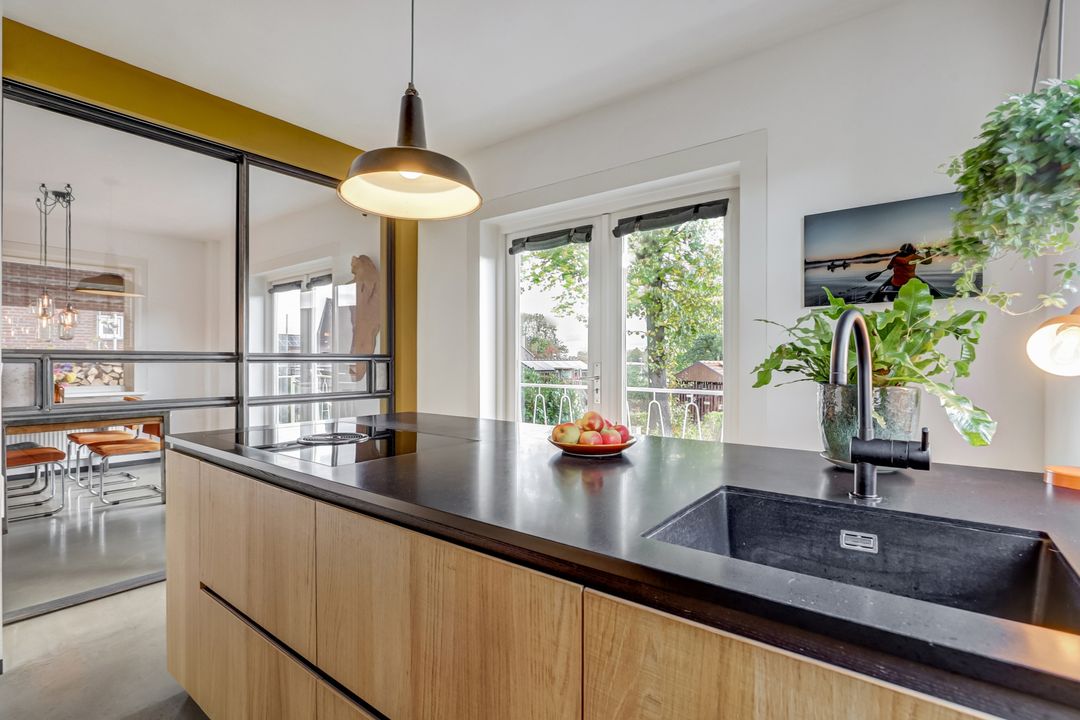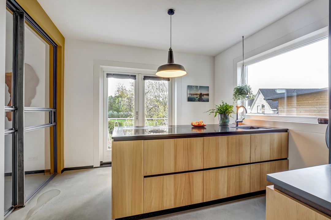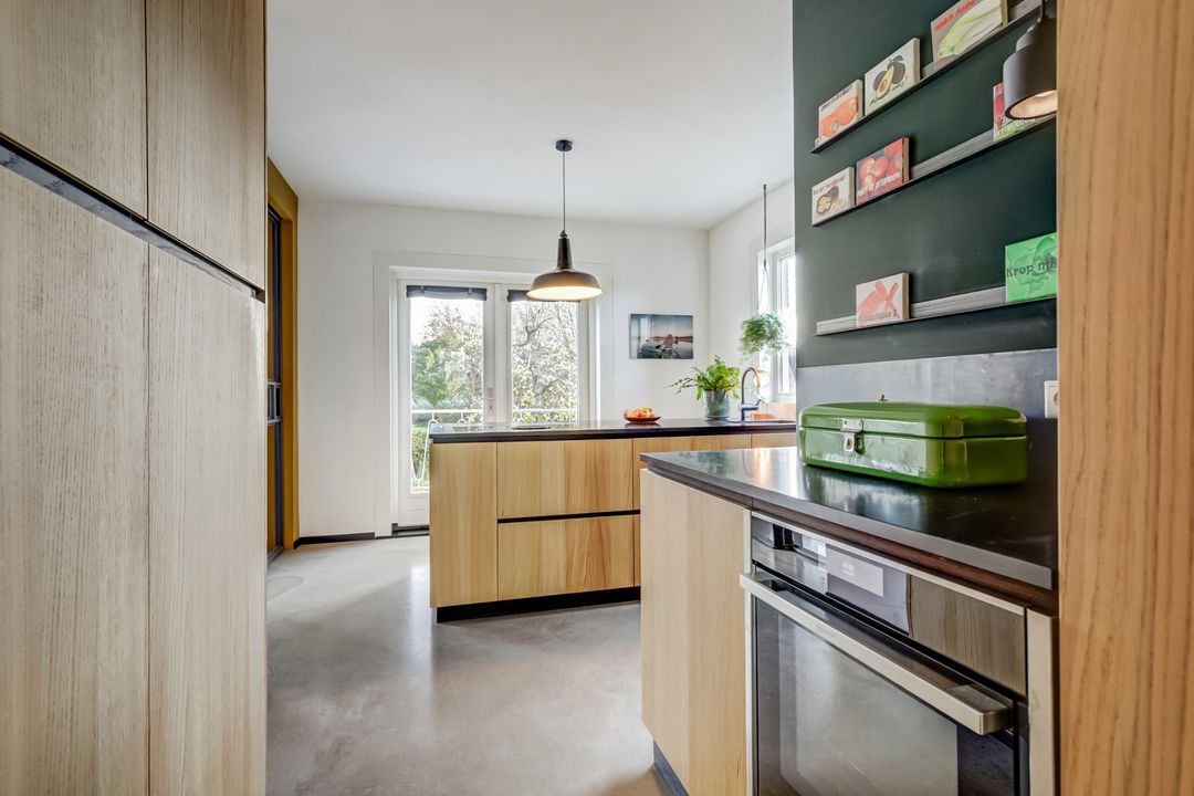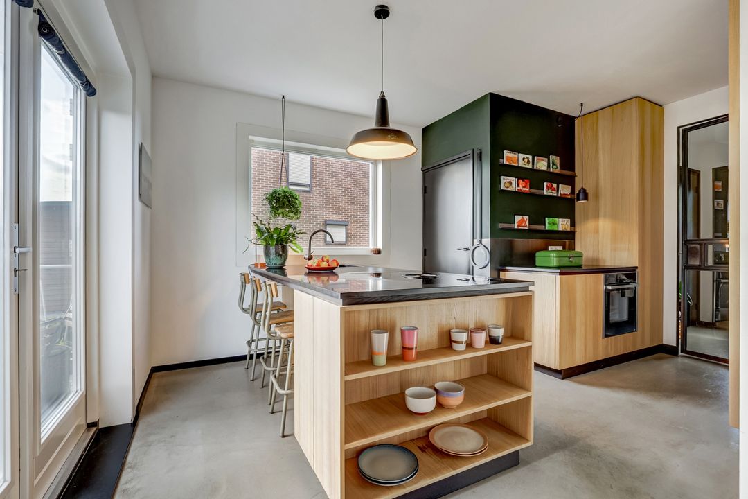 De volgende ruimte die je betreedt is de keuken, een heerlijke lichte plek die direct een gevoel van ruimte en comfort geeft. Dankzij de openslaande deuren naar het balkon en het grote zijraam biedt deze ruimte veel natuurlijke licht. Op het balkon kun je al vroeg in het jaar beschut genieten van het ochtendzonnetje en een kopje koffie. De keuken is praktisch en doordacht ingedeeld met een kastenwand, meerdere werkbladen en een groot kookeiland als centraal punt. Hier kook je met plezier op het vierpits inductiefornuis met geïntegreerde afzuiging terwijl je uitkijkt over de tuin en het achterliggende landschap. De keuken is voorzien van hoogwaardige inbouwapparatuur waaronder een luxe ‘slide and hide’-oven met stoomfunctie, een vaatwasser, grote koelkast en vriezer. De combinatie van de houten kastfronten en het donkere stenen werkblad zorgt voor een stijlvolle uitstraling. Bovendien biedt de keuken veel opbergruimte waardoor alles netjes en overzichtelijk blijft.