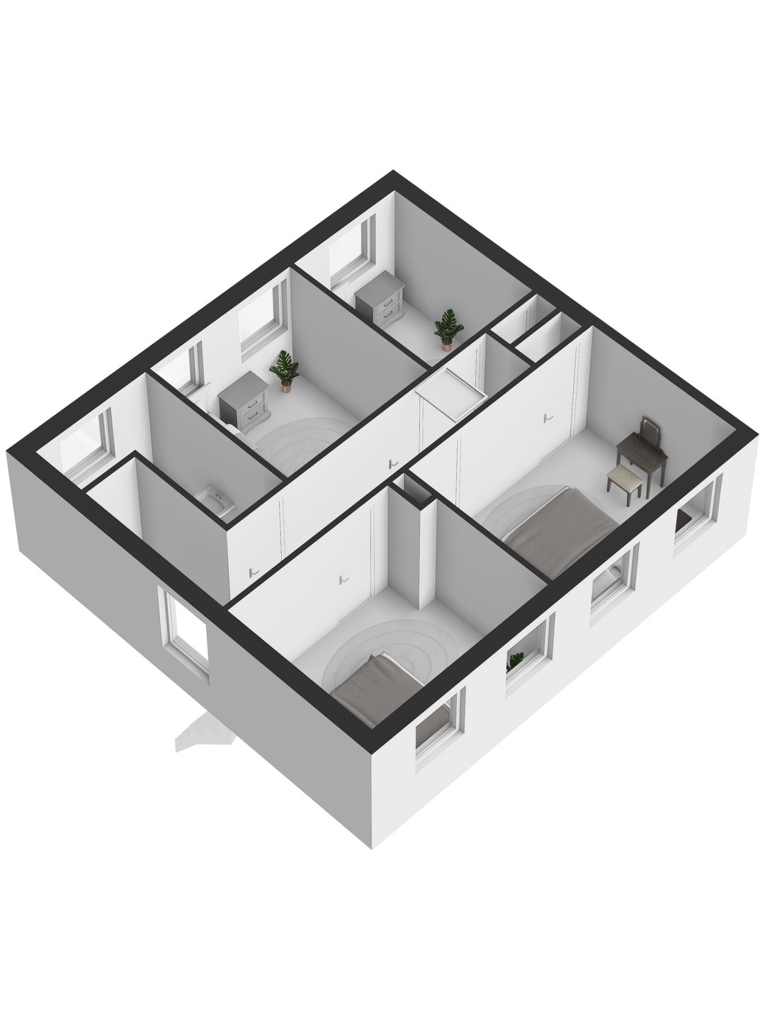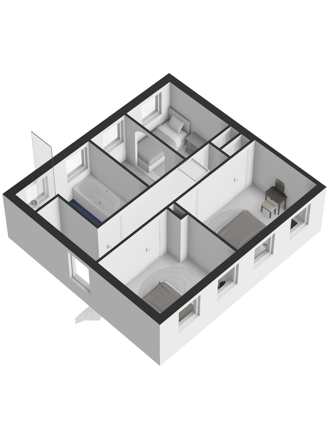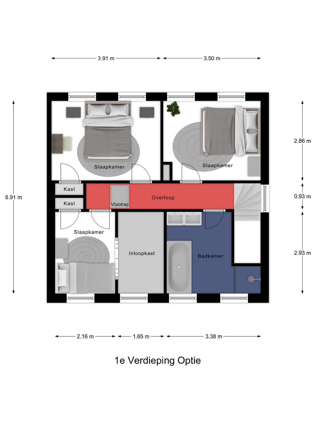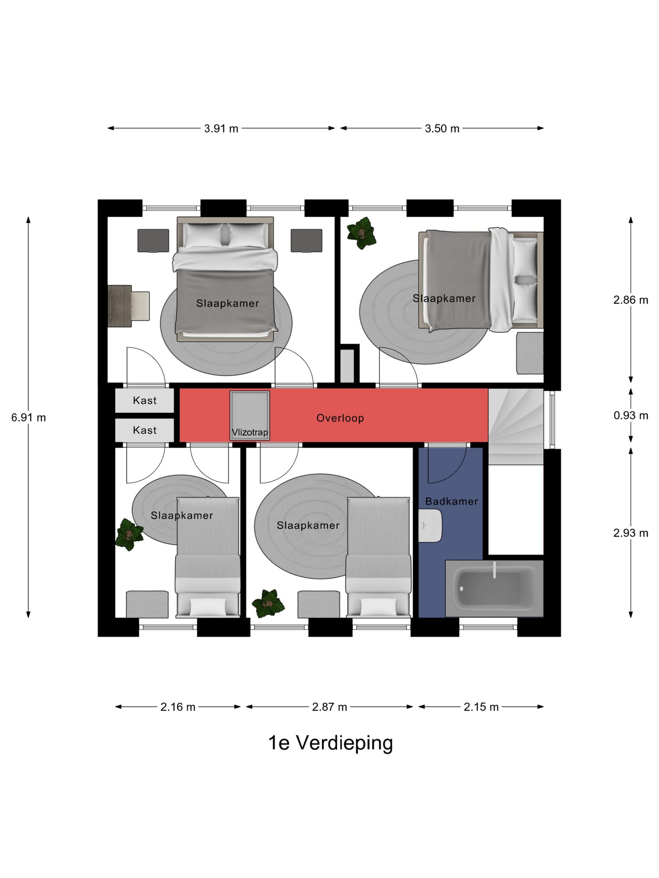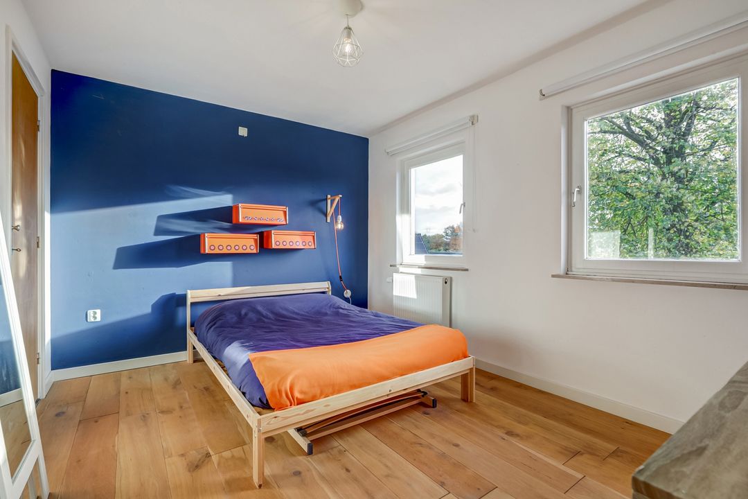 Er zijn in totaal vier slaapkamers, waarvan drie ruim van formaat en één wat kleiner. Alle kamers beschikken over één of twee draairamen voor een fijne lichtinval en natuurlijke ventilatie. De twee achterste slaapkamers zijn bovendien voorzien van een handige inbouwkast.