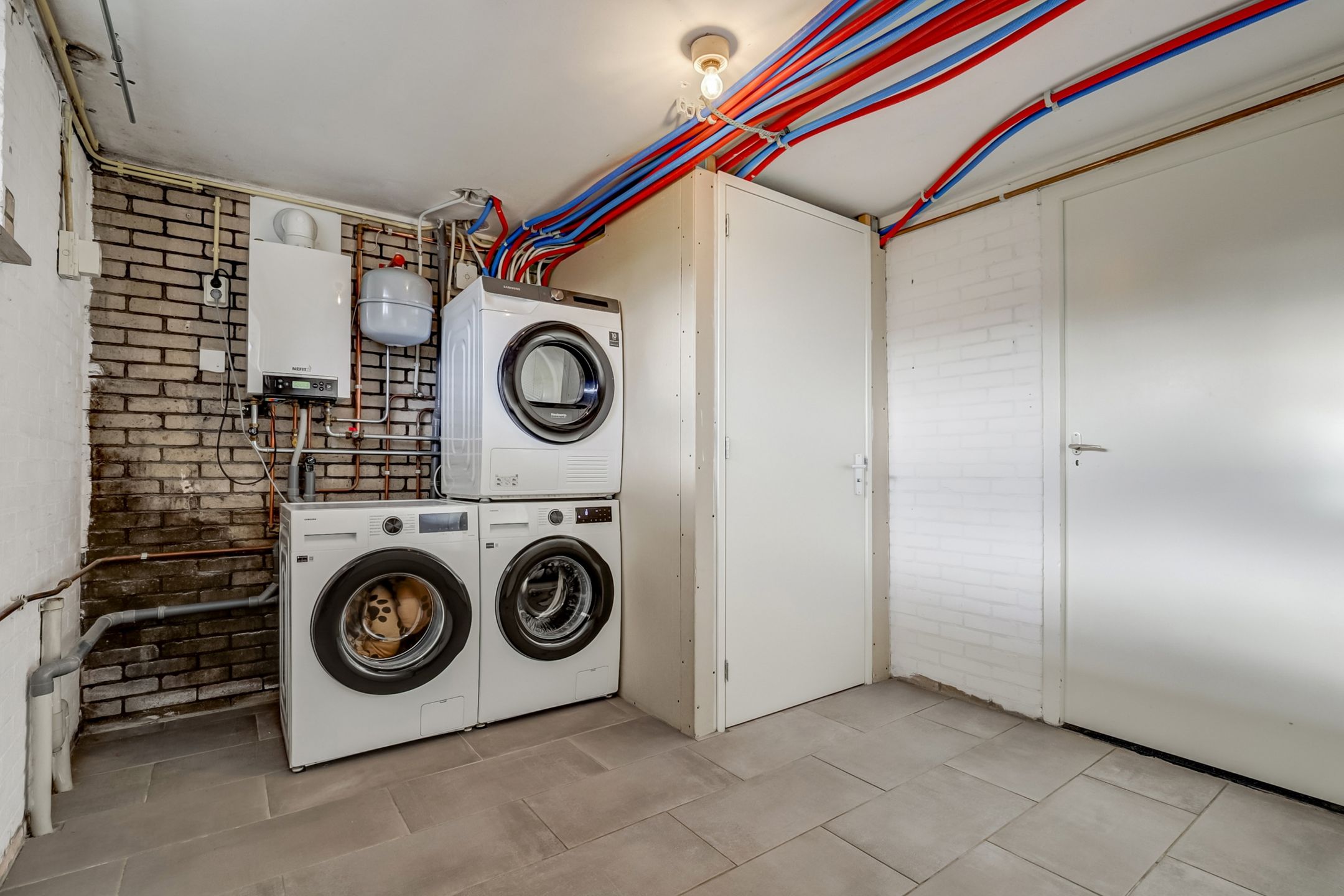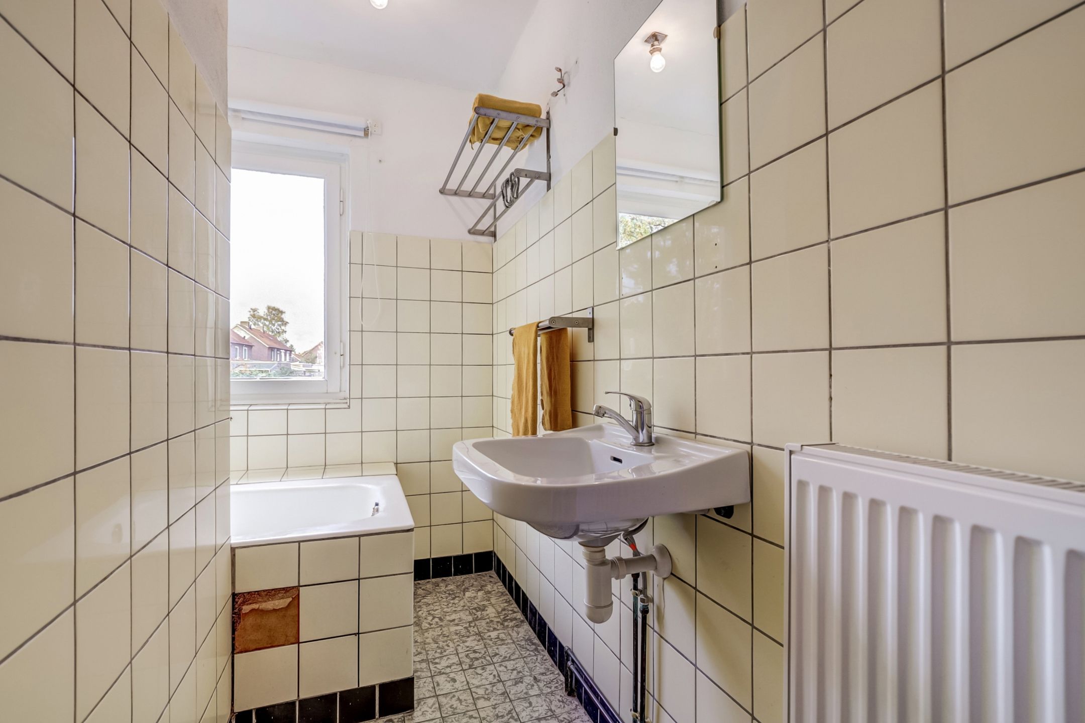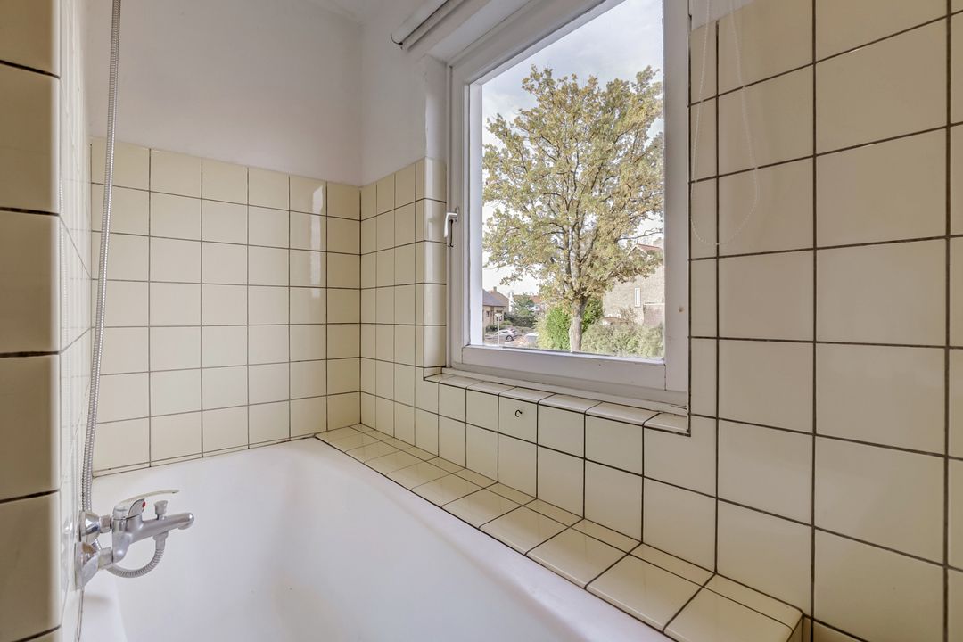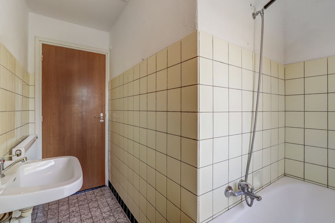 De badkamer is eenvoudig maar functioneel ingericht met een ligbad met douchefunctie en een wastafel. Handig om te weten: de aansluiting van het toilet beneden loopt door naar de badkamer, waardoor het relatief eenvoudig is om hier een derde toilet te realiseren.