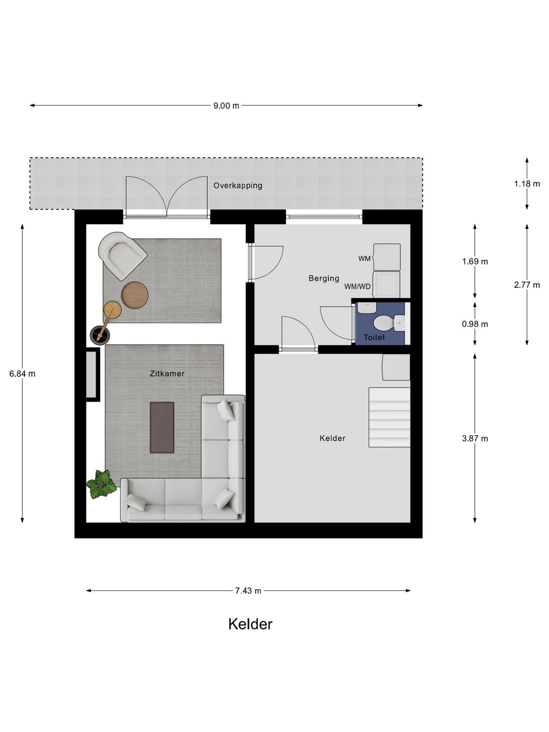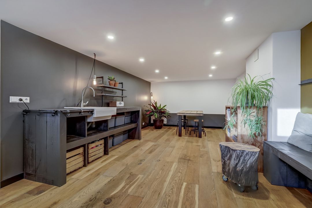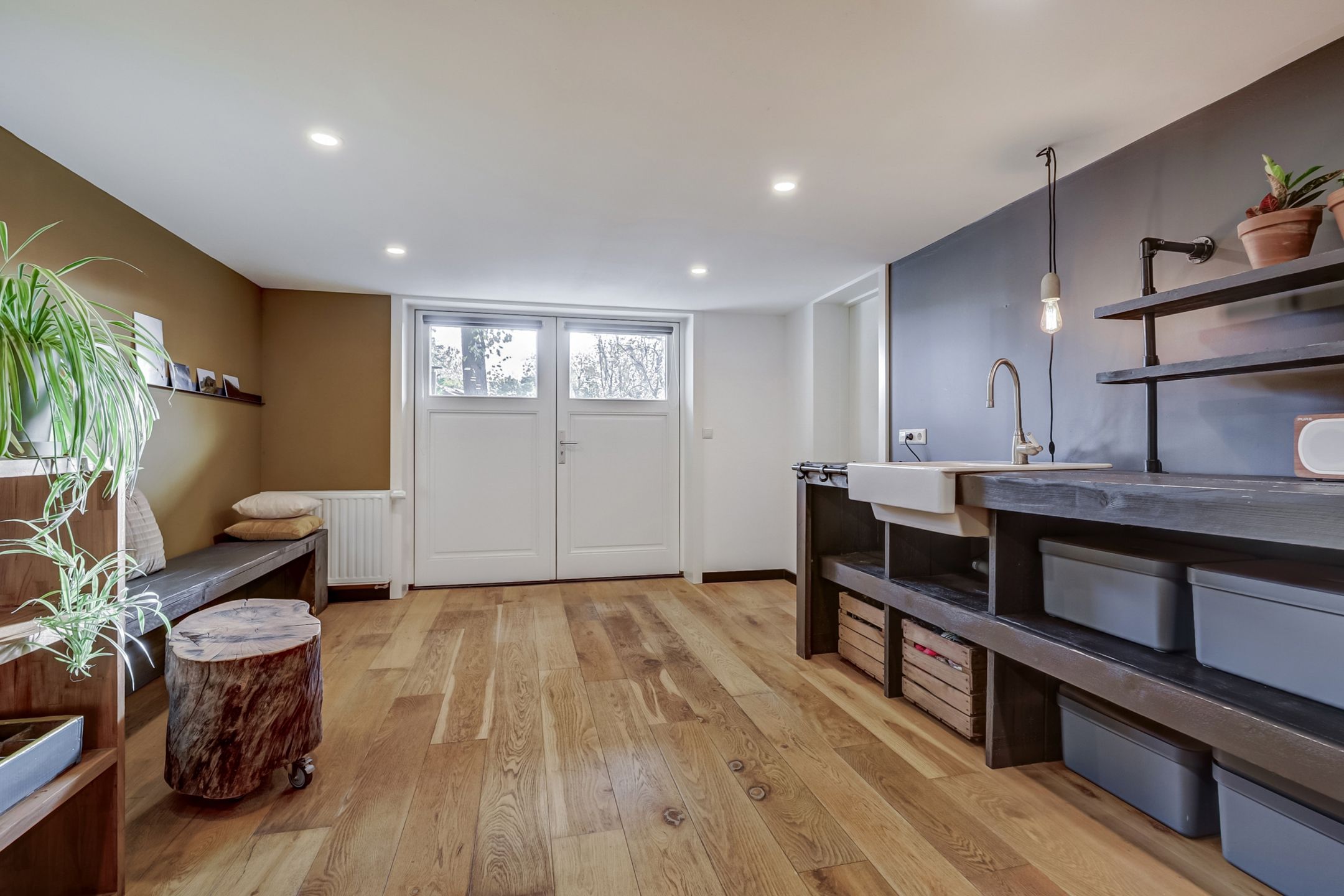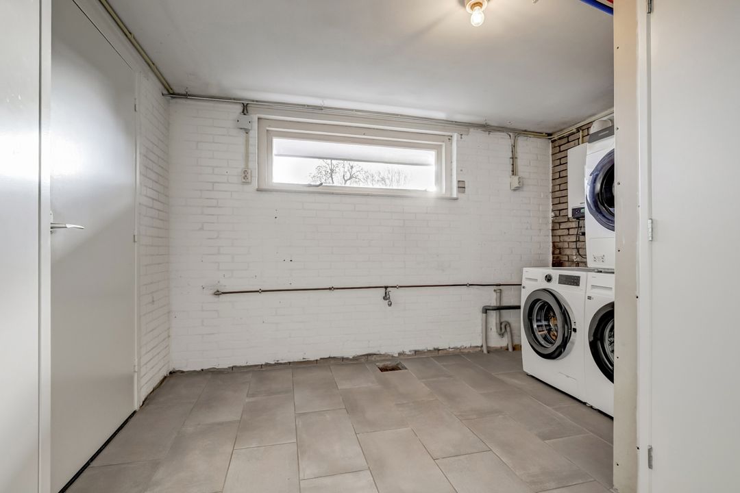 Het souterrain is zowel vanuit de keuken als vanuit de tuin bereikbaar en vormt een verrassend veelzijdige extra leefruimte. Bij binnenkomst kom je eerst in de voorraadruimte waar volop plaats is voor proviand, voorraadkasten en andere opslag. Vervolgens kom je in de berging met de witgoedaansluitingen, de cv-installatie (Nefit, 2016) en een toiletruimte. Via een deur stap je vervolgens in een sfeervolle ruimte die momenteel wordt gebruikt als werk- en speelkamer, maar zich uitstekend leent voor diverse doeleinden, denk aan een hobbyruimte, tuinkamer, logeerkamer of zelfs een studio. De ruimte is afgewerkt met een mooie houten vloer en voorzien van dubbele deuren die direct toegang geven tot de achtertuin. Er is een keukenblok met wasbak (warm en koud water) aanwezig wat de ruimte extra praktisch maakt. Bovendien is er een rookkanaal aanwezig zodat ook hier de mogelijkheid bestaat om een houtkachel te plaatsen. De ingebouwde spotverlichting met dimmer in het plafond zorgt voor een prettige, gelijkmatige lichtverdeling. Het souterrain is daarmee een volwaardige extra woonlaag die zorgt voor veel flexibiliteit en wooncomfort met direct contact met de tuin en het prachtige uitzicht.
