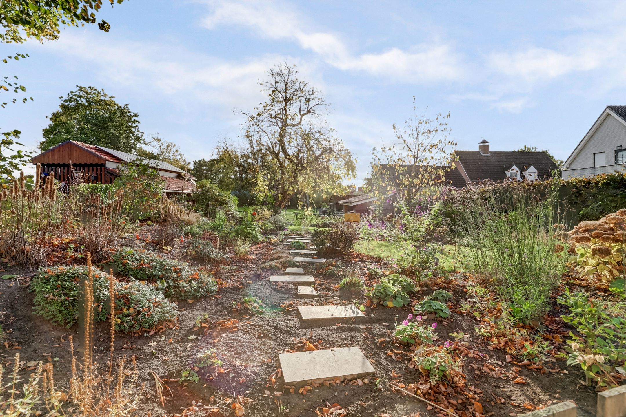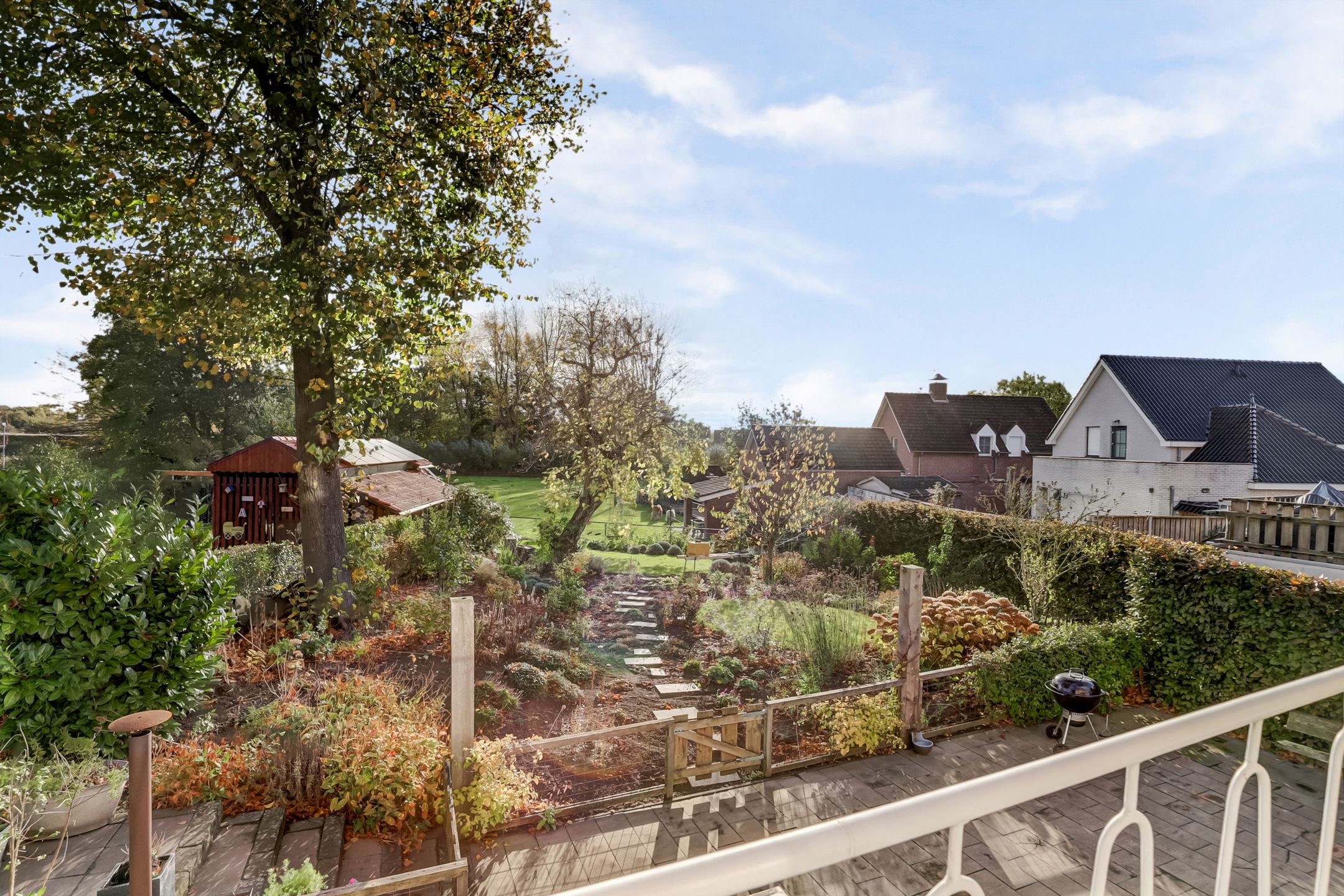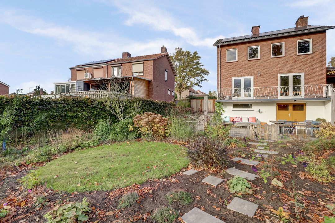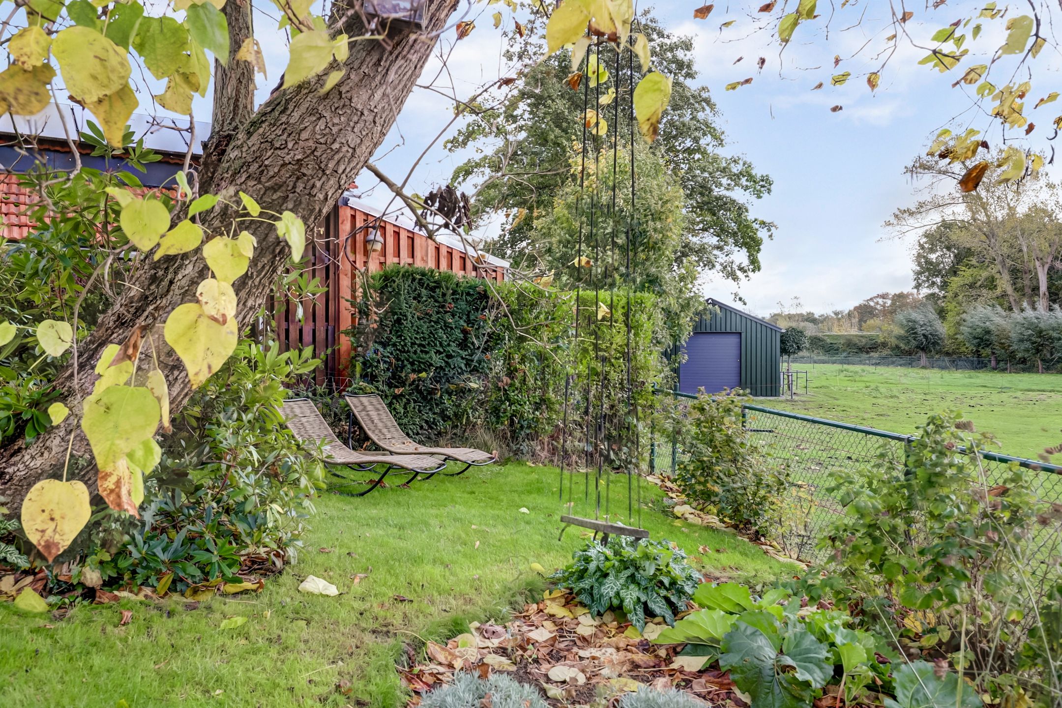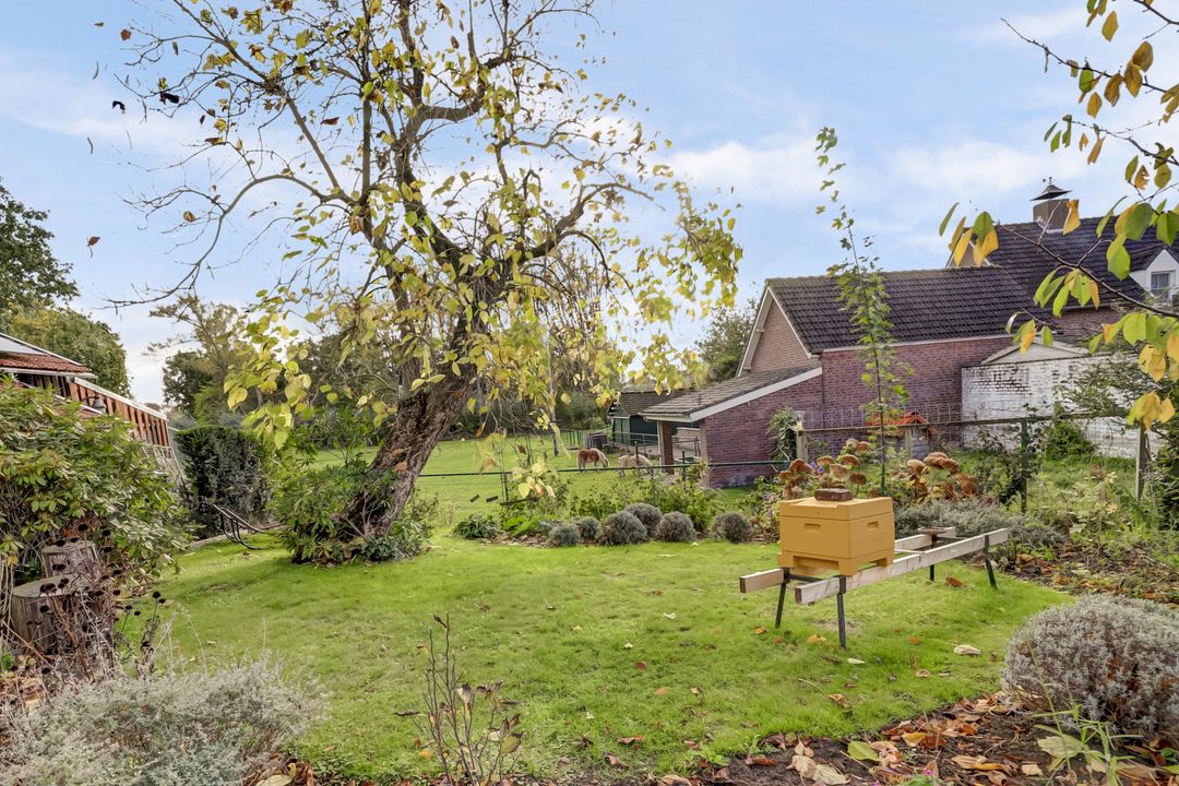 De achtertuin is een heerlijk verlengstuk van de woning, een plek waar je volop kunt genieten van rust, ruimte en het vrije uitzicht. Met een lengte van 25 tot 30 meter biedt de tuin volop mogelijkheden om te ontspannen, te tuinieren of te spelen. Direct achter het huis ligt een groot terras, ideaal voor gezellige etentjes of lange zomeravonden buiten. De tuin is fraai aangelegd en wordt gesierd door enkele prachtige bomen, waaronder een lindeboom en een Catalpaboom die in de zomer voor natuurlijke schaduw en een groen karakter zorgen samen met het gazon en de vele plantenborders die vol staan met volwassen beplanting. Achterin de tuin kijk je uit over het aangrenzende weilanden met paarden en daarachter de Haelensebeek, een uitzicht dat nooit verveelt!