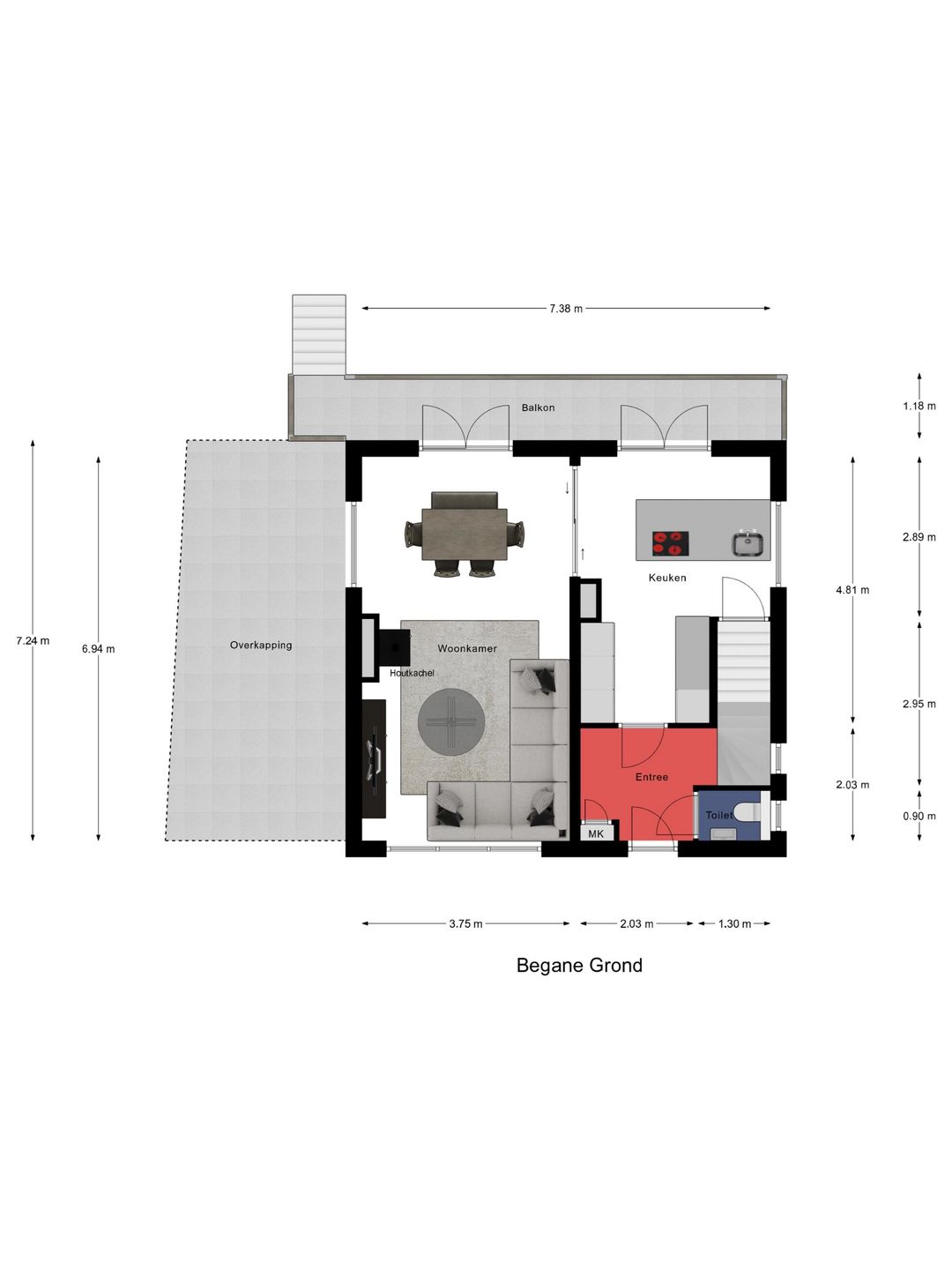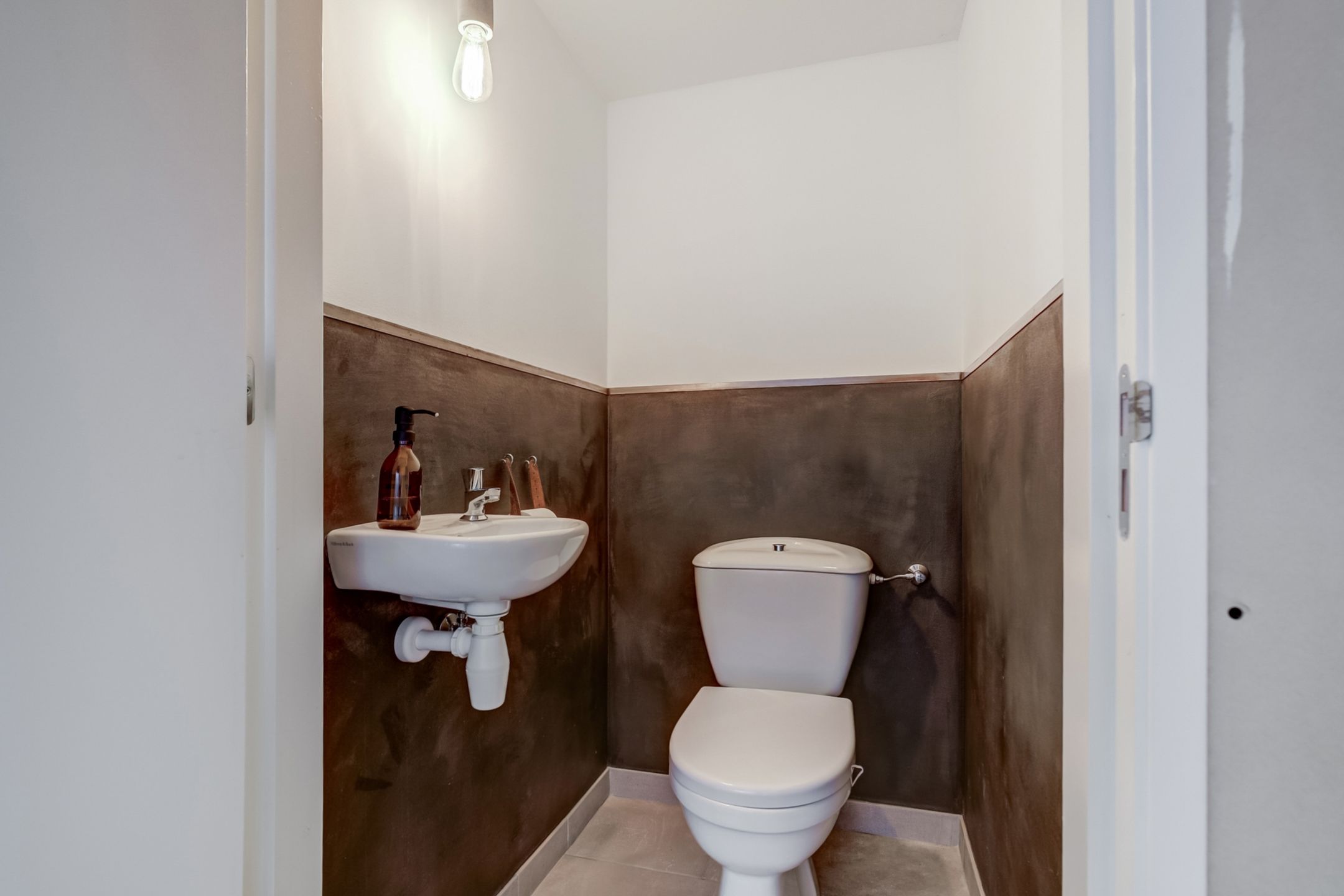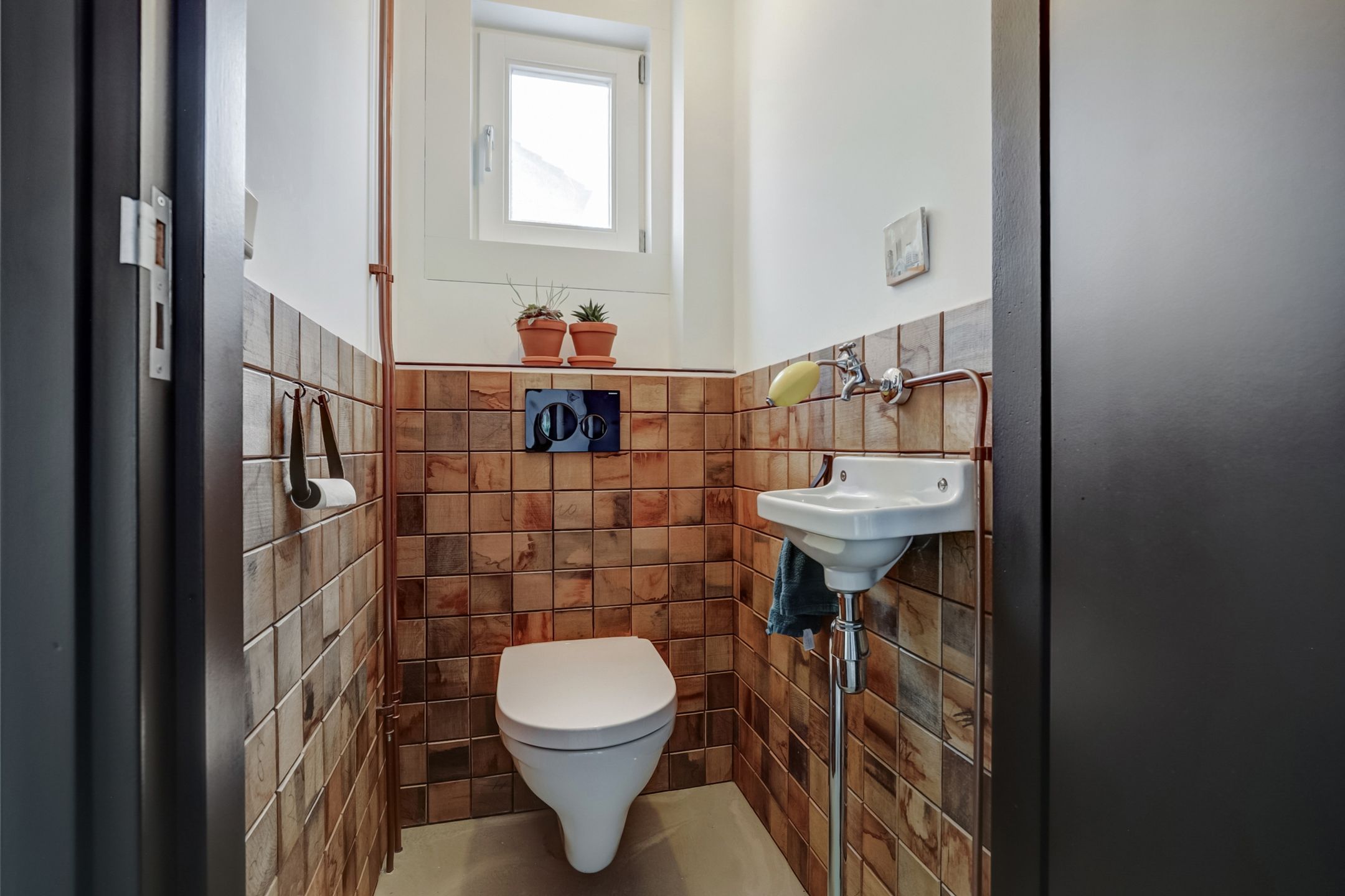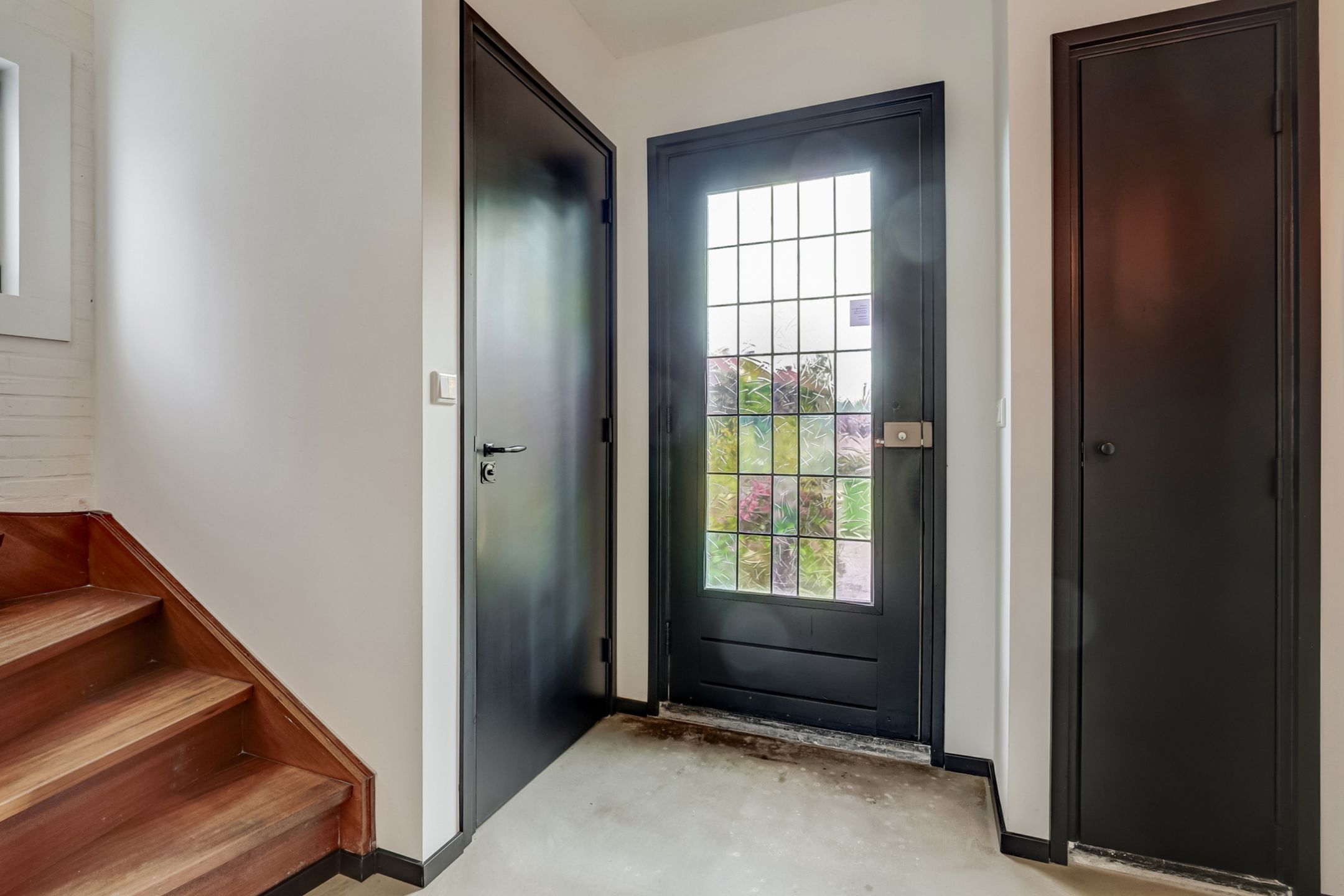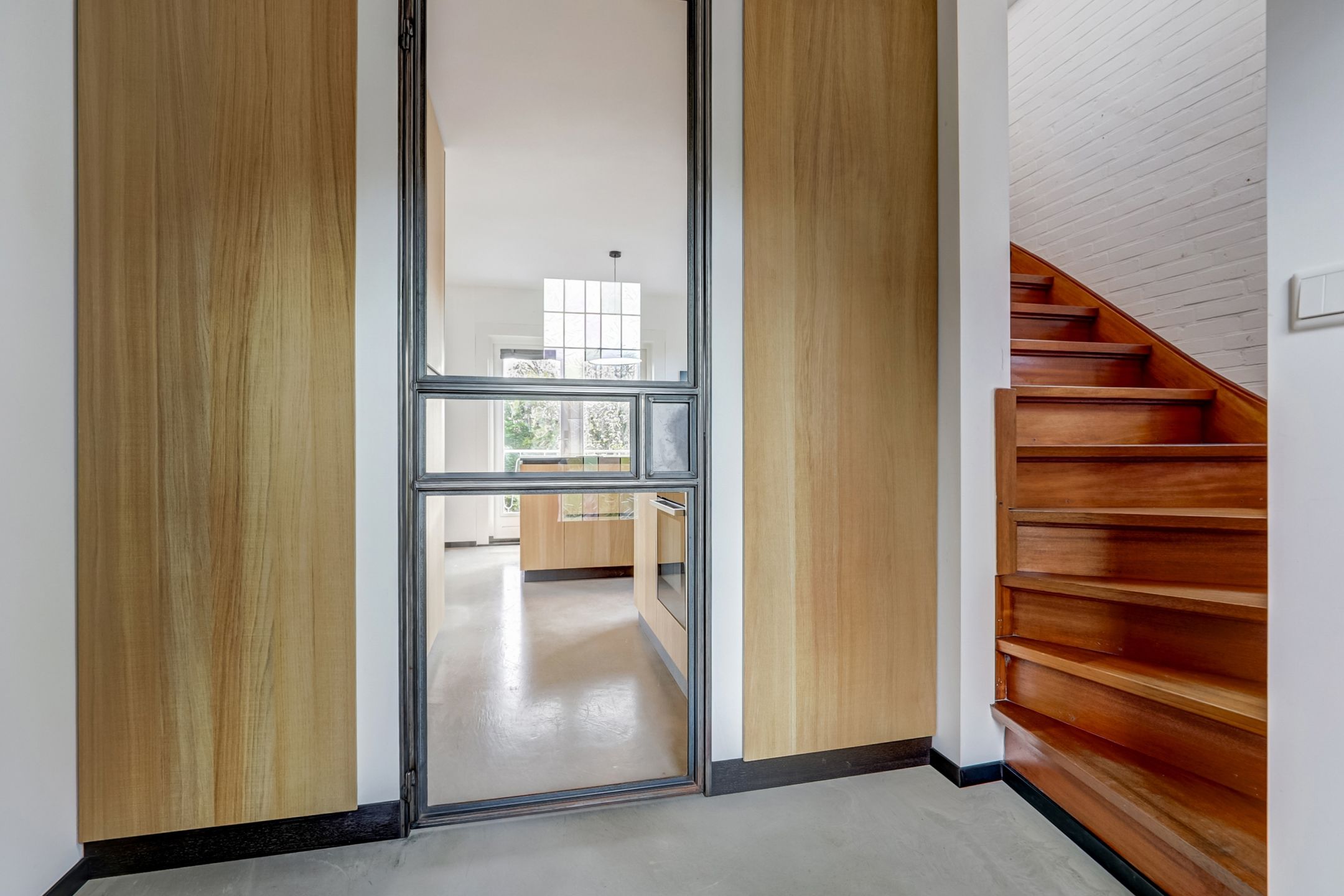 Via de netjes aangelegde voortuin bereik je de voordeur van de woning. Binnenkomend stap je in een ruime hal die direct een prettige indruk geeft. Aan de rechterzijde bevindt zich de toiletruimte, voorzien van een wandtoilet, fonteintje en een klein raam. De wand is hier afgewerkt met stijlvolle houten tegeltjes, wat zorgt voor een warme uitstraling. Aan de linkerzijde van de hal vind je de meterkast en via een glazen deur met stalen kozijn loop je door naar de keuken. Langs deze doorgang zijn aan beide zijden handige inbouwkasten geplaatst voor het opbergen van jassen, schoenen en andere spullen. De geëgaliseerde vloer loopt drempelloos door over de gehele begane grond, wat zorgt voor een ruimtelijk geheel. Deze vloer is bovendien zo te gebruiken of klaar voor verdere afwerking naar eigen smaak, zoals hout, pvc of tegel.