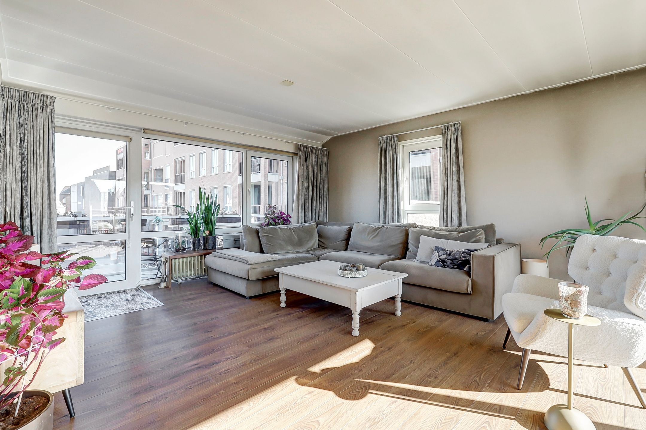 De woonkamer heeft een mooie lichtinval doordat in alle buitenmuren ramen zitten. Meerdere ramen lopen van plafond tot vloer door waardoor het in de winter met zonnetje al snel lekker warm is en als je vindt dat in de zomer de zon te fel schijnt kun je het zonnescherm aan de achterkant van de woning naar beneden doen of het rolluik aan de zijkant. Op het balkon kun je in de warme zomer heerlijk zitten en zien wat er allemaal speelt op het Pastoor Huijbenplein. In het gehele appartement ligt een houtkleurige laminaatvloer.