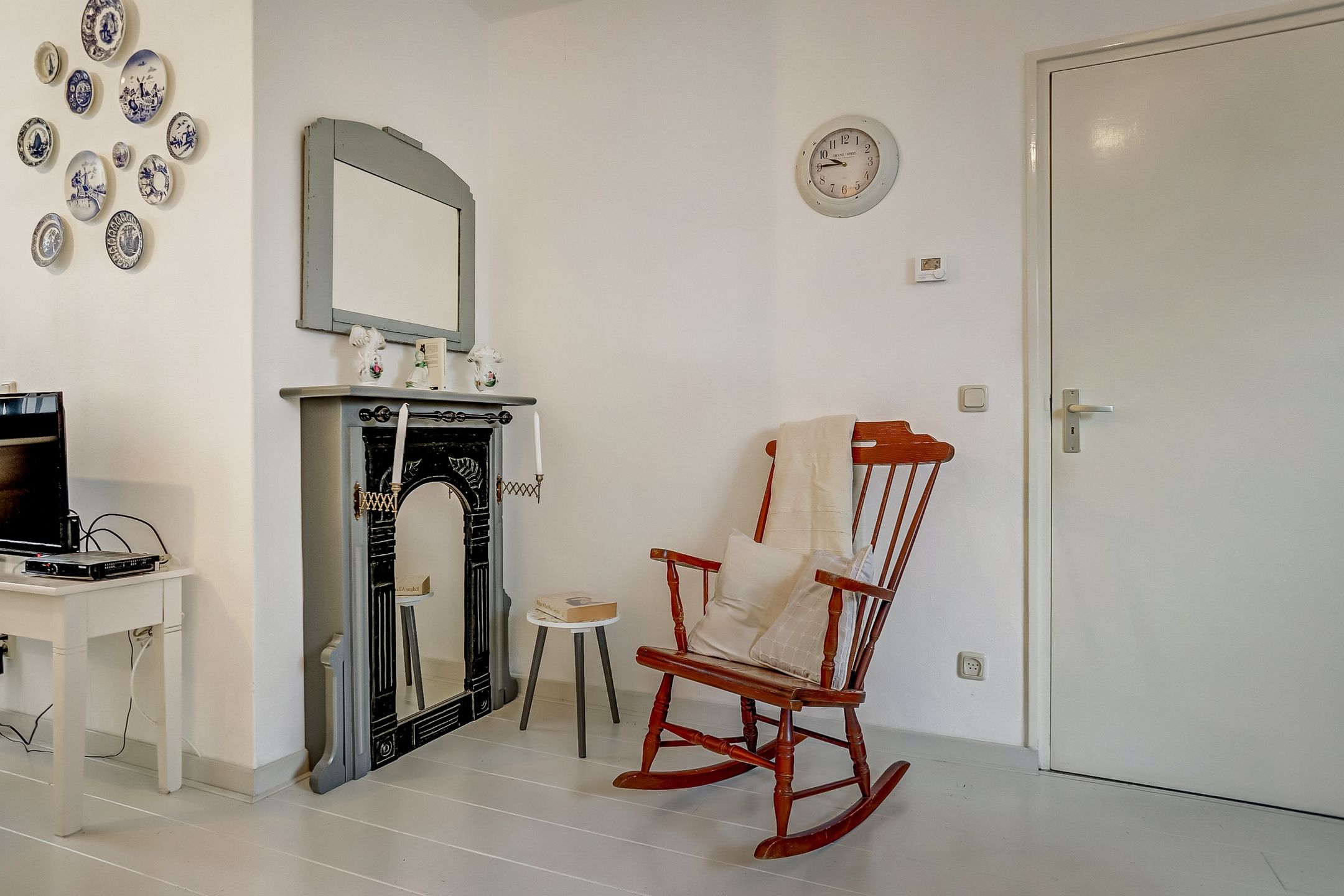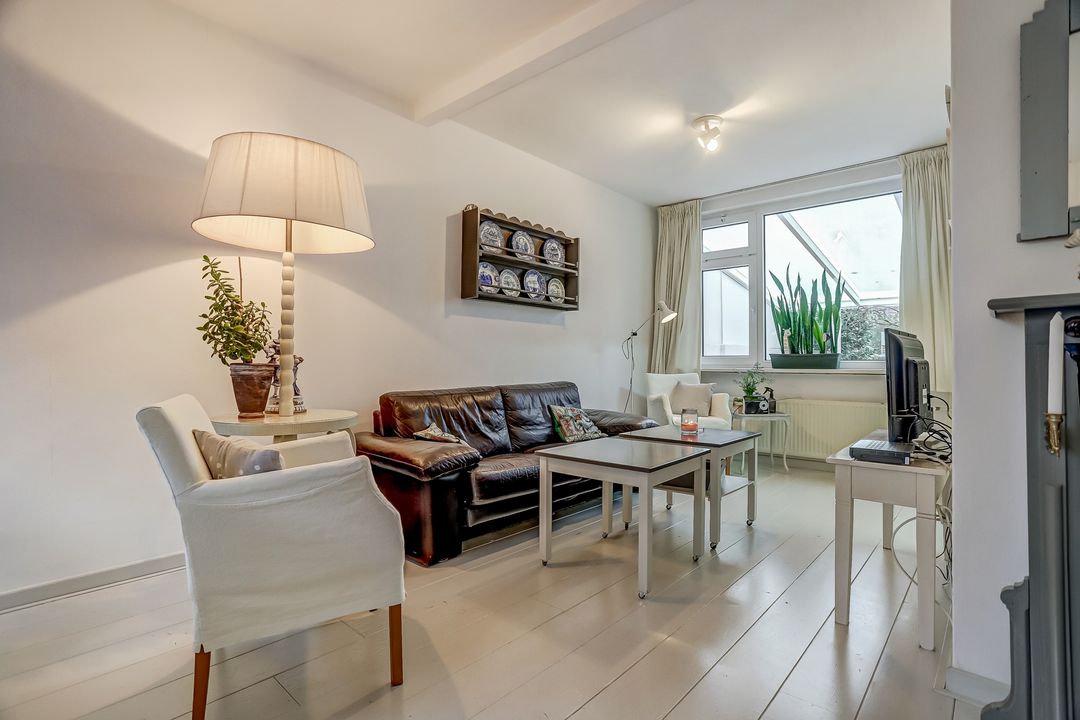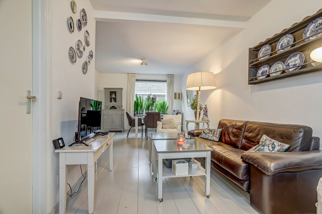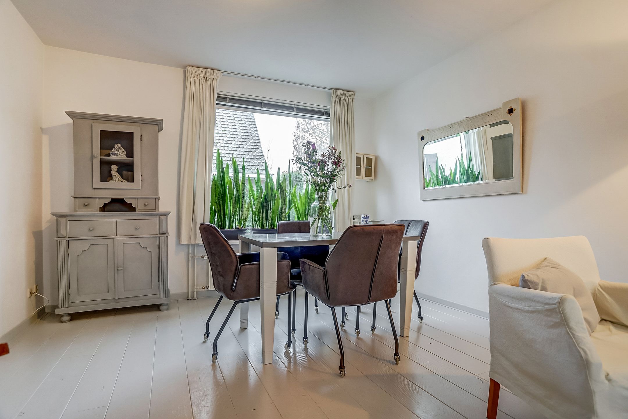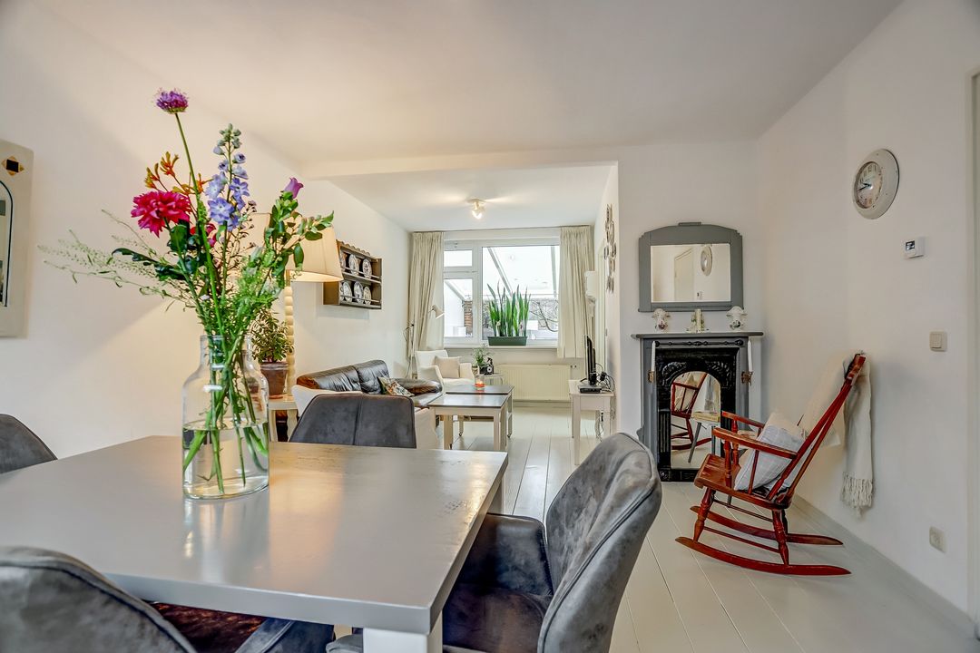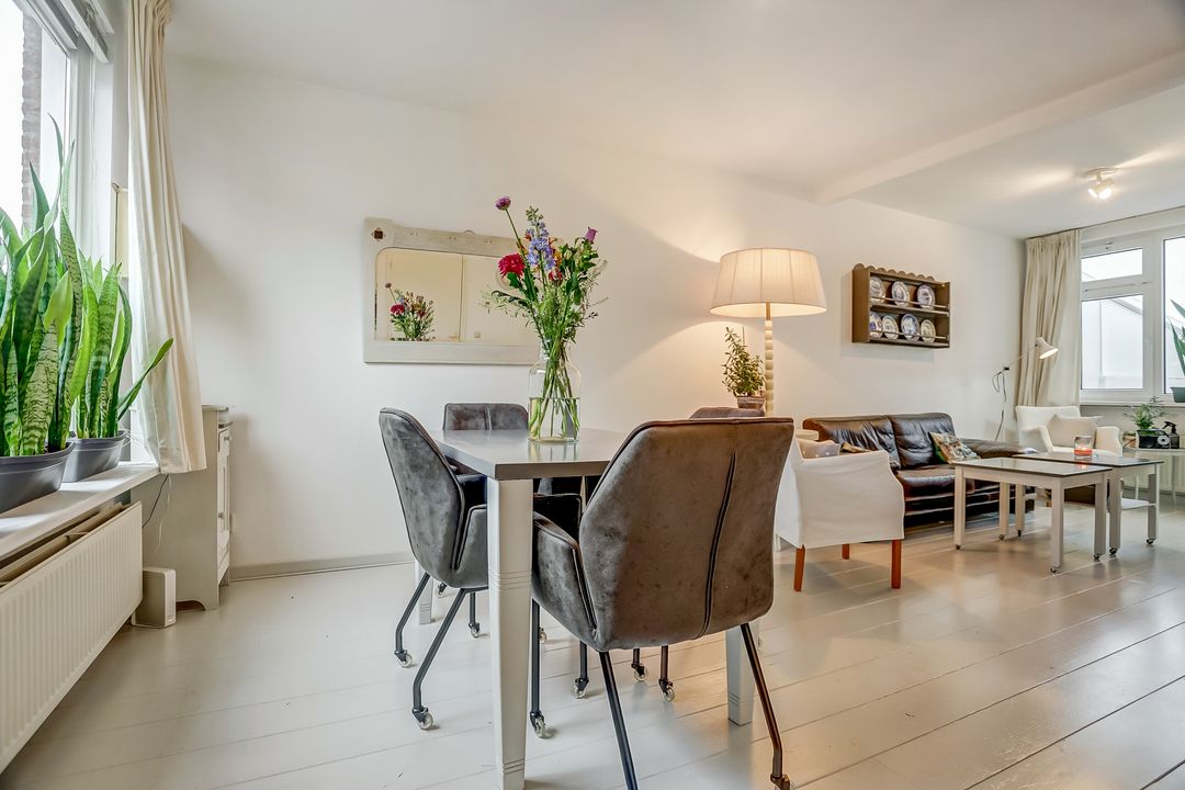 De woonkamer is een heerlijke lichte ruimte door de grote raampartij aan de voorkant en aan de achterkant. Het raam aan de achterkant beschikt ook over een draaikiepvenster en een bovenlicht waardoor je altijd makkelijk wat frisse lucht naar binnen kunt laten. Het licht in de ruimte wordt nog eens extra versterkt door de witte, houten vloer die er keurig onderhouden uit ziet.
