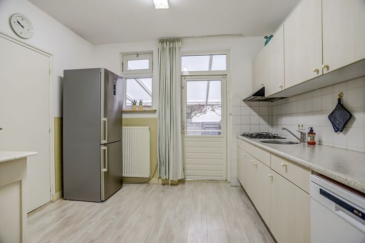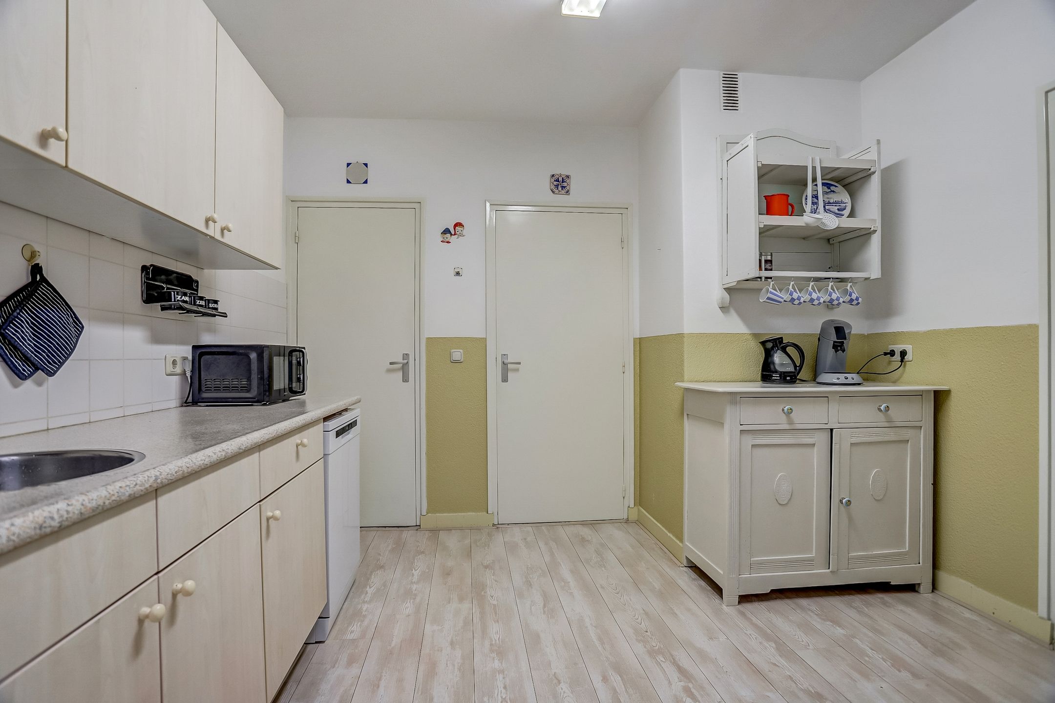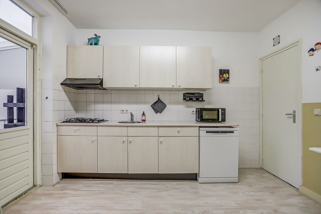 De keuken is eenvoudig maar functioneel ingericht met een vierpits gasfornuis en afzuigkap, een losstaande koel/vriescombinatie en een vaatwasser. Via het raam en de deur met raam heb je goed uitzicht over de lager gelegen tuin. In de keuken ligt een laminaatvloer.