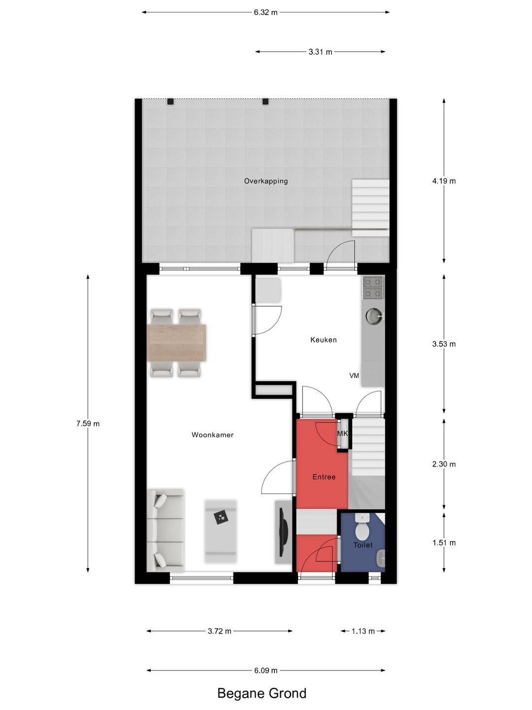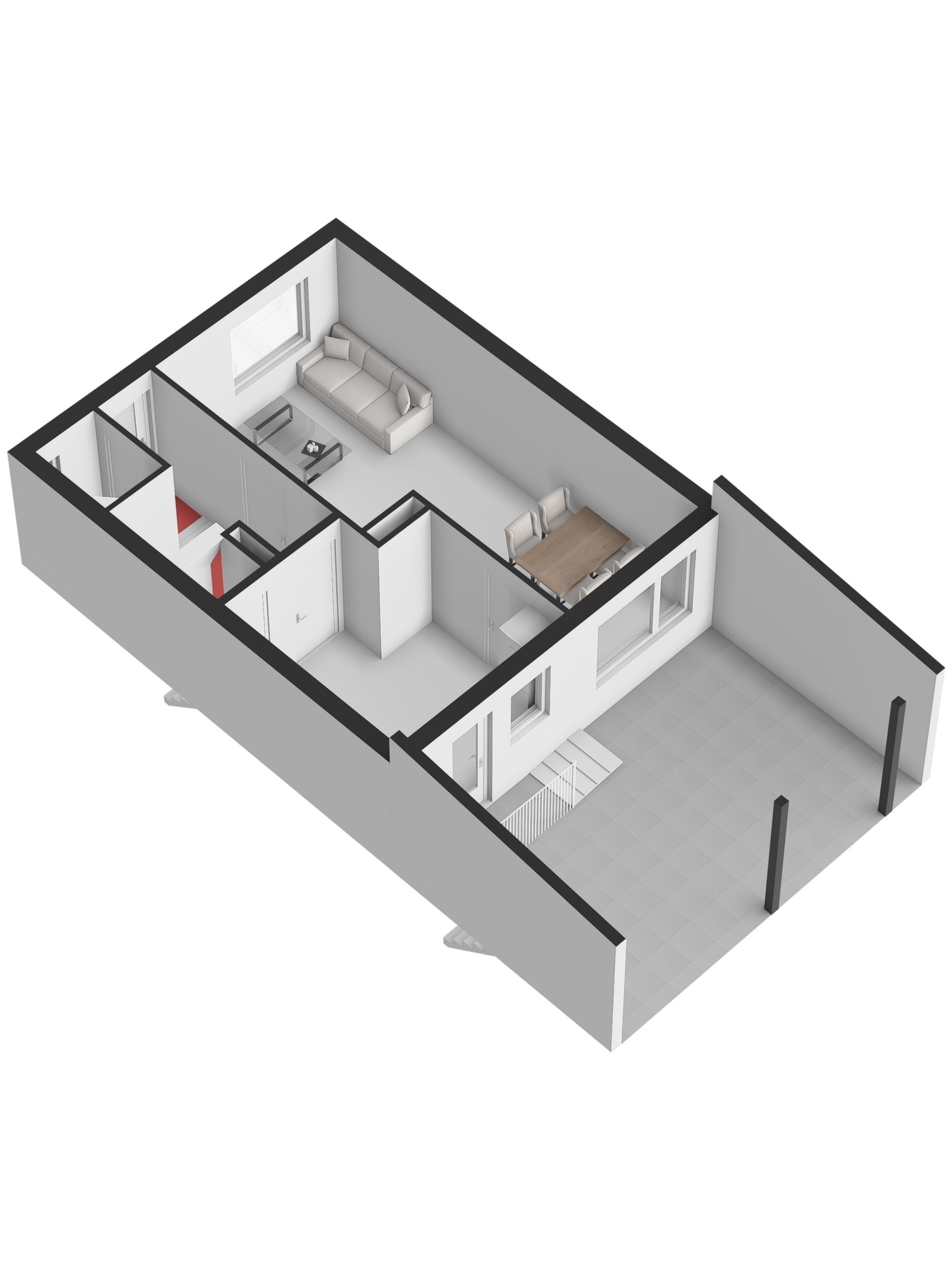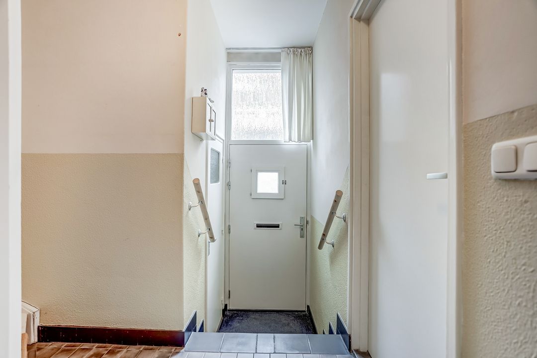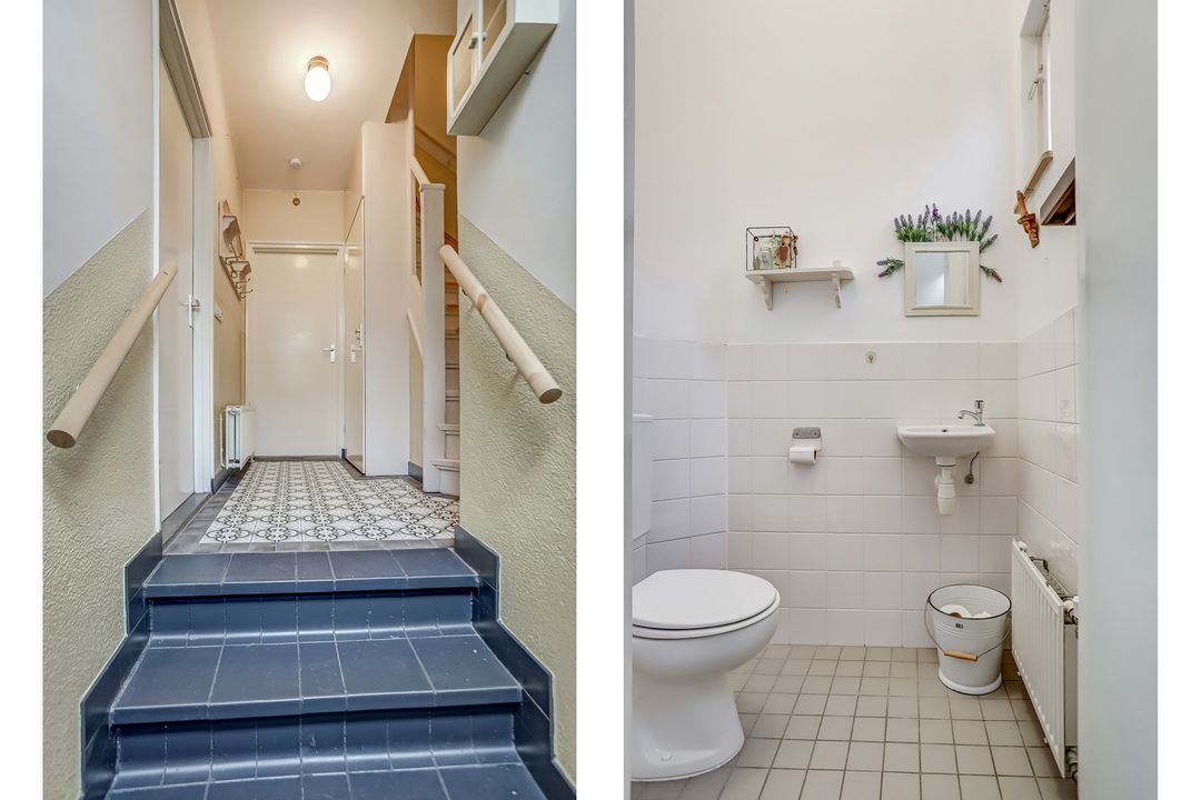 Direct aan de stoep ligt de voordeur die een klein raampje heeft dat je aan de binnenkant open kunt doen. Wel zo veilig dat je eerst kunt checken wie er aan de deur staat. Bij binnenkomst ligt er direct rechts een toiletruimte en via drie trapjes bereik je de hal met leuke patroontegeltjes op de vloer. In de meterkast zijn vijf stroomgroepen beschikbaar en een aansluiting op het glasvezelnetwerk. Aan de linkerkant kun je de woonkamer inlopen of rechtdoor de keuken in.