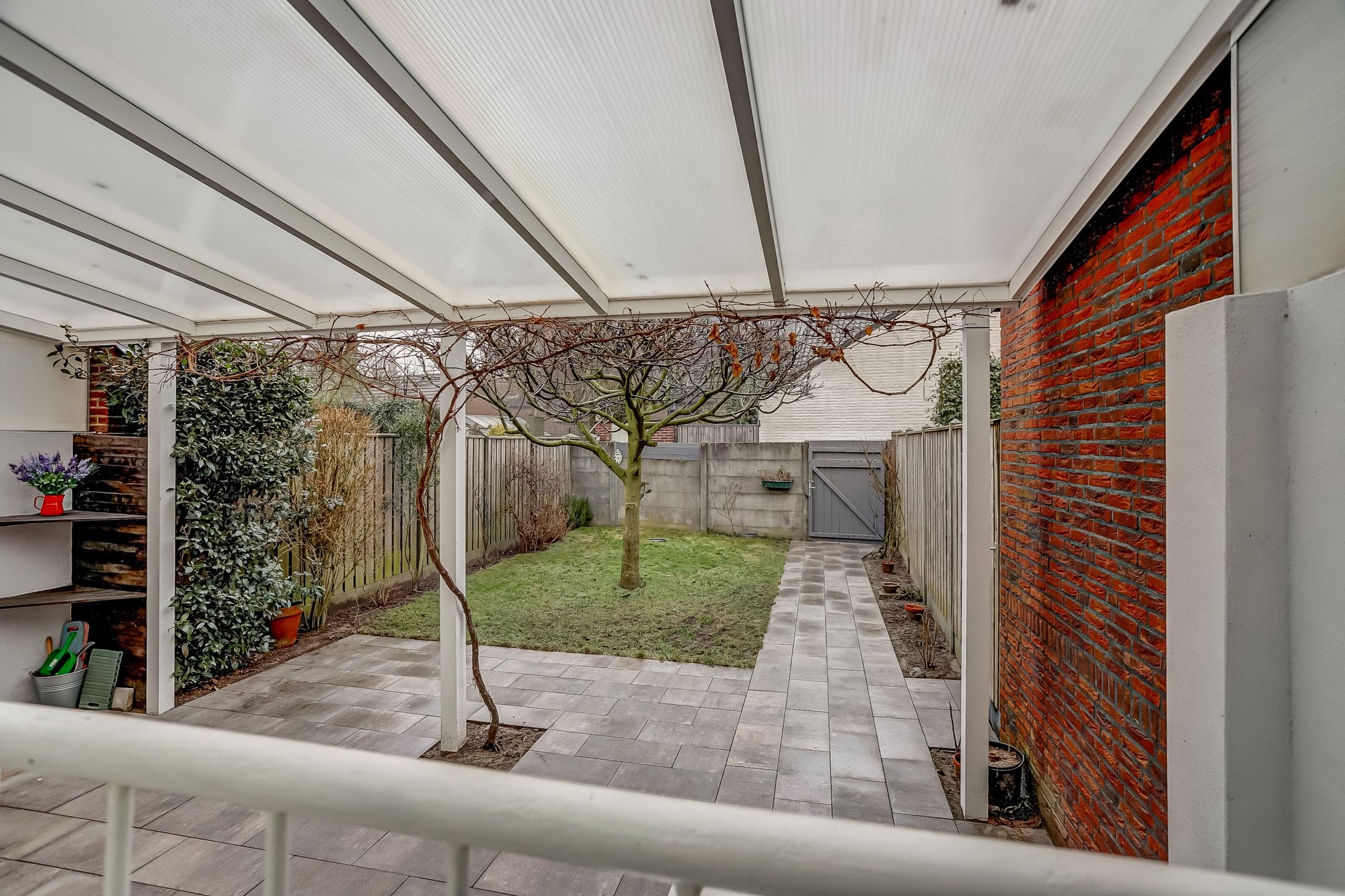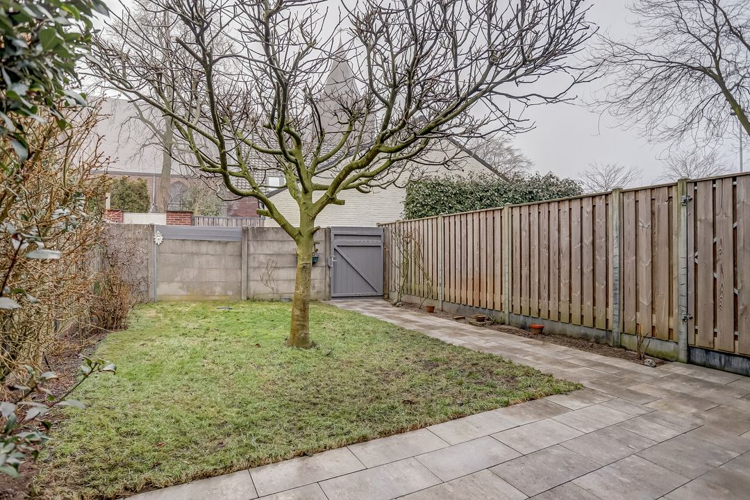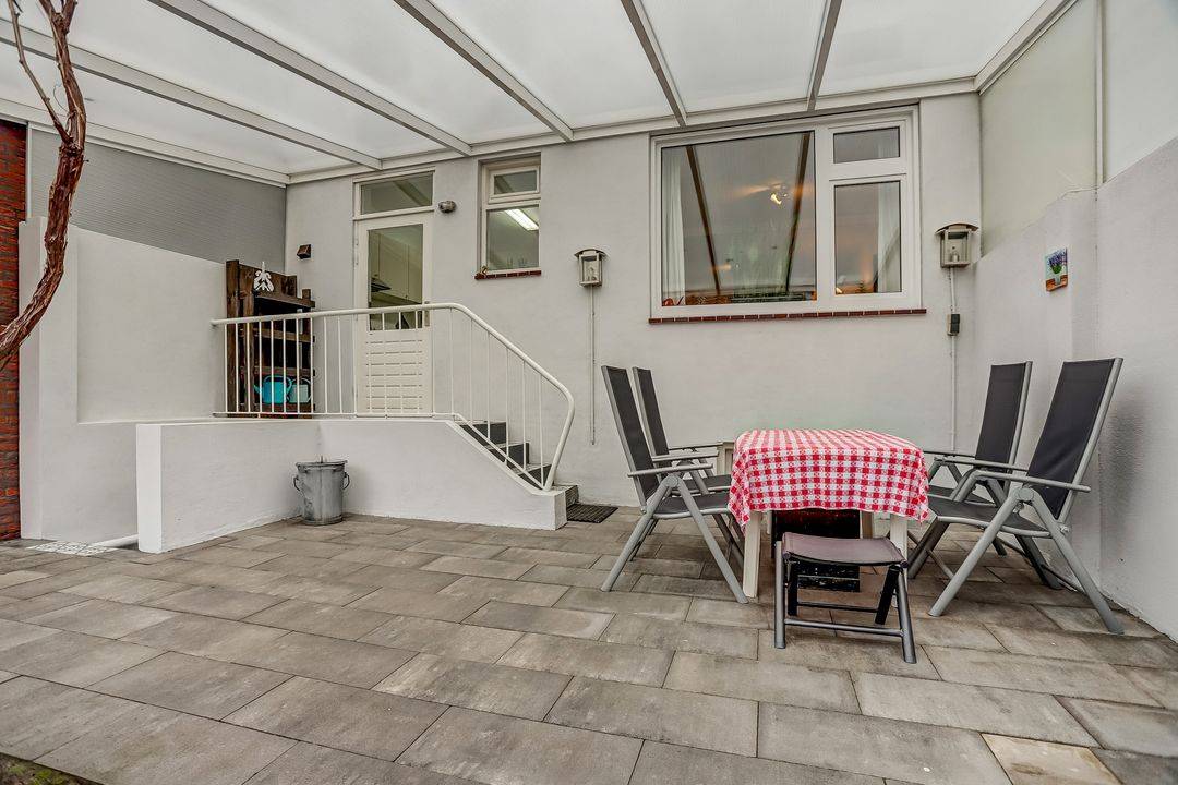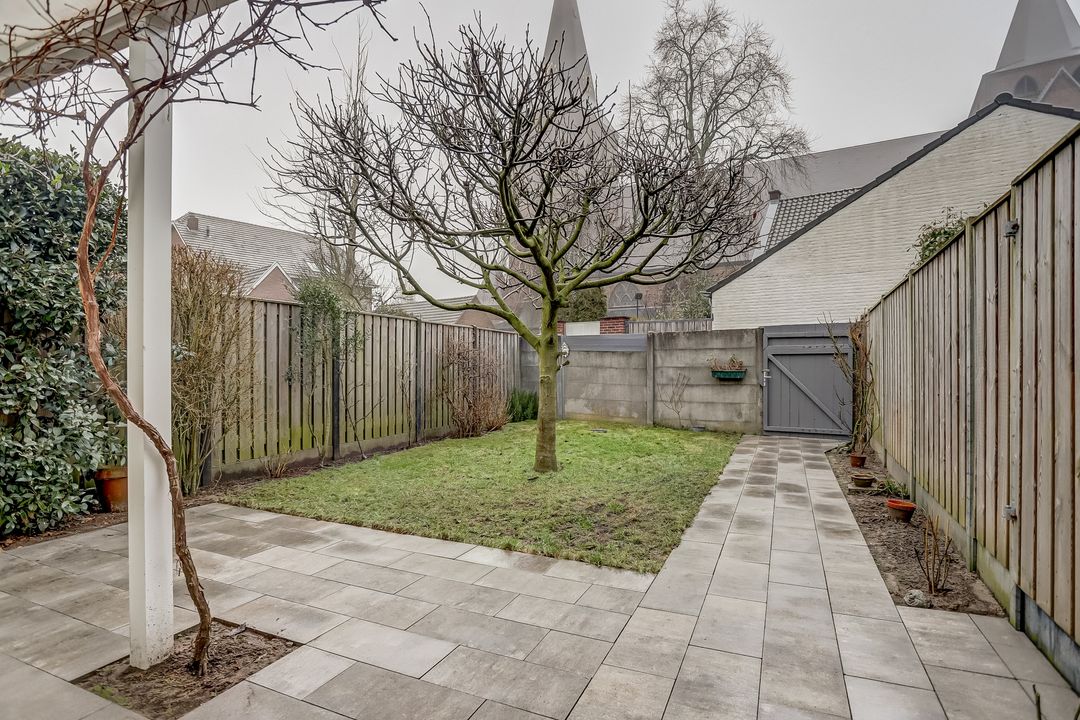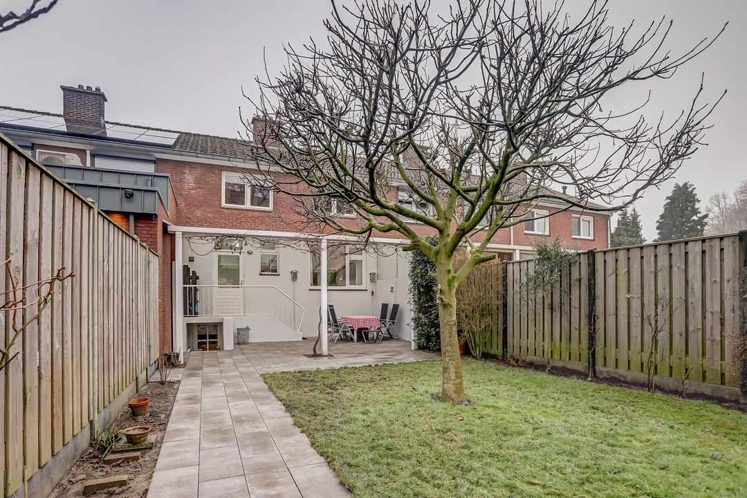 Doordat de tuin wat lager is gelegen heb je hier extra veel privacy. Direct aan de woning bevindt zich een groot overdekt terras waar je in de zomer dus lekker in de schaduw kunt zitten. Als je in deze tuin zit kom je ook nooit meer ergens te laat want je hebt hier prachtig uitzicht op de kerkklok. Een grote notenboom lokt altijd veel vogeltjes en geeft ook in een warme zomer veel verkoeling! Een groot deel van de tuin bestaat uit gazon en tegen de overkapping groeit een druivenstruik. Er is een vrije achterom aanwezig middels een houten poort. Je kunt de tuin bereiken via een trapje bij de keukendeur of bij de kelder.