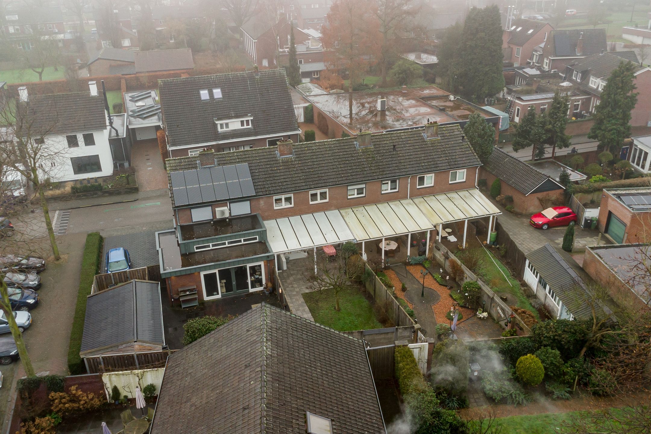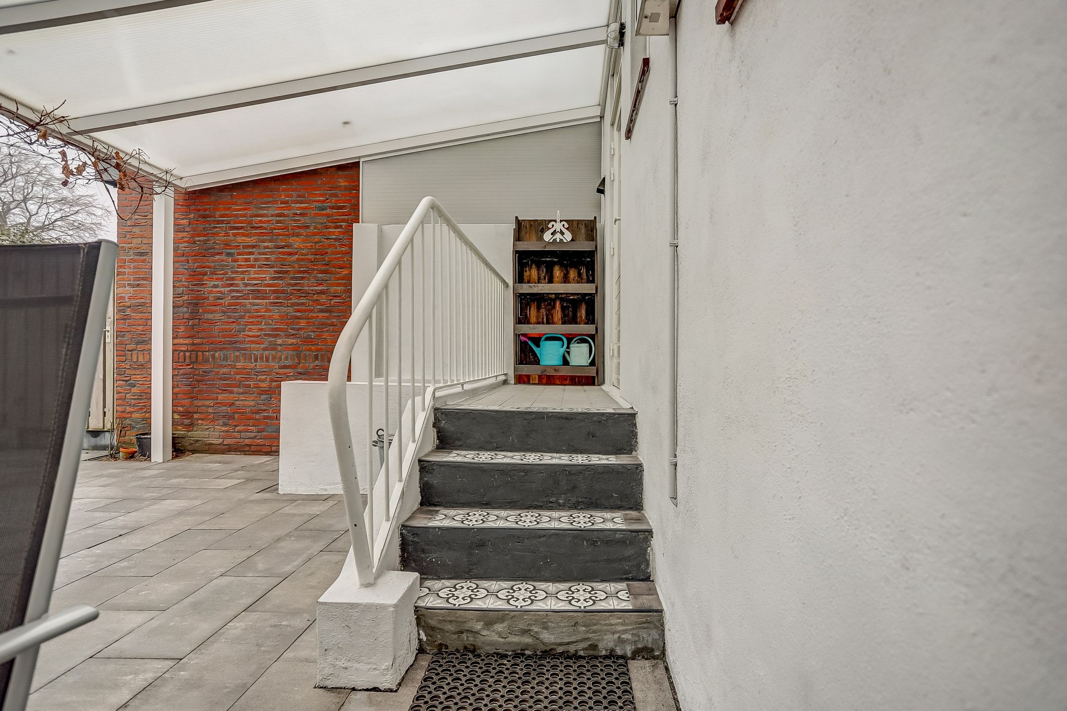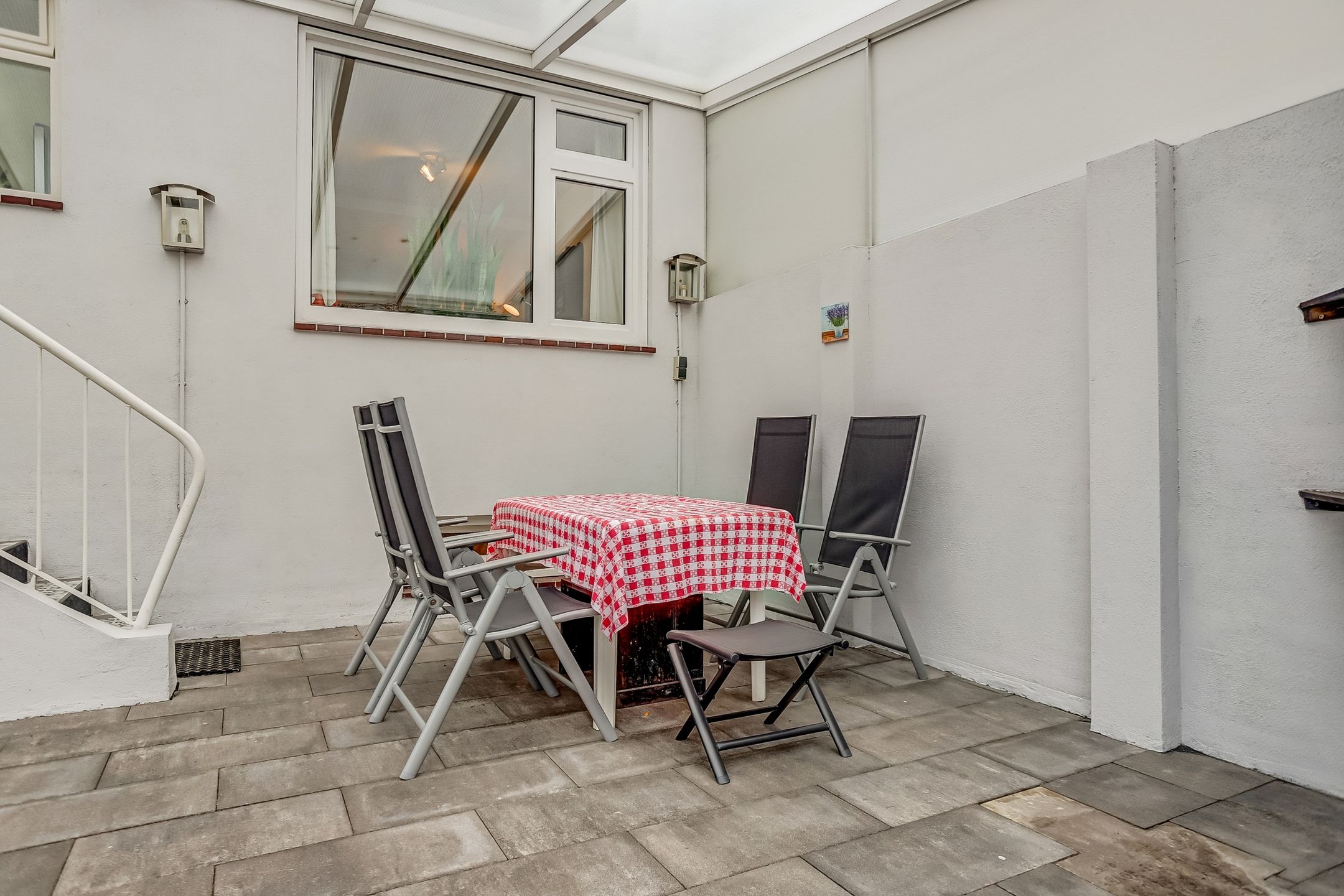 Doordat de tuin wat lager is gelegen heb je hier extra veel privacy. Direct aan de woning bevindt zich een groot overdekt terras waar je in de zomer dus lekker in de schaduw kunt zitten. Als je in deze tuin zit kom je ook nooit meer ergens te laat want je hebt hier prachtig uitzicht op de kerkklok. Een grote notenboom lokt altijd veel vogeltjes en geeft ook in een warme zomer veel verkoeling! Een groot deel van de tuin bestaat uit gazon en tegen de overkapping groeit een druivenstruik. Er is een vrije achterom aanwezig middels een houten poort. Je kunt de tuin bereiken via een trapje bij de keukendeur of bij de kelder.