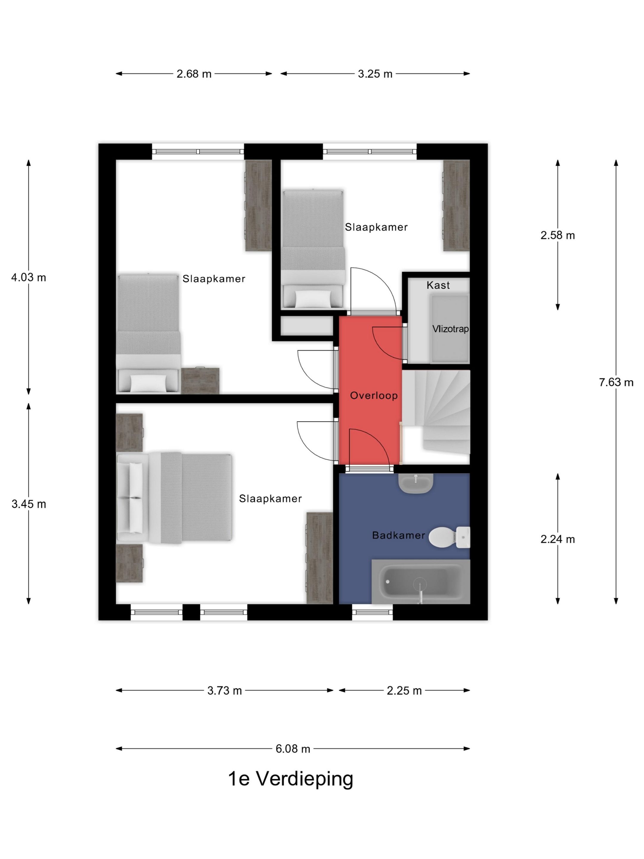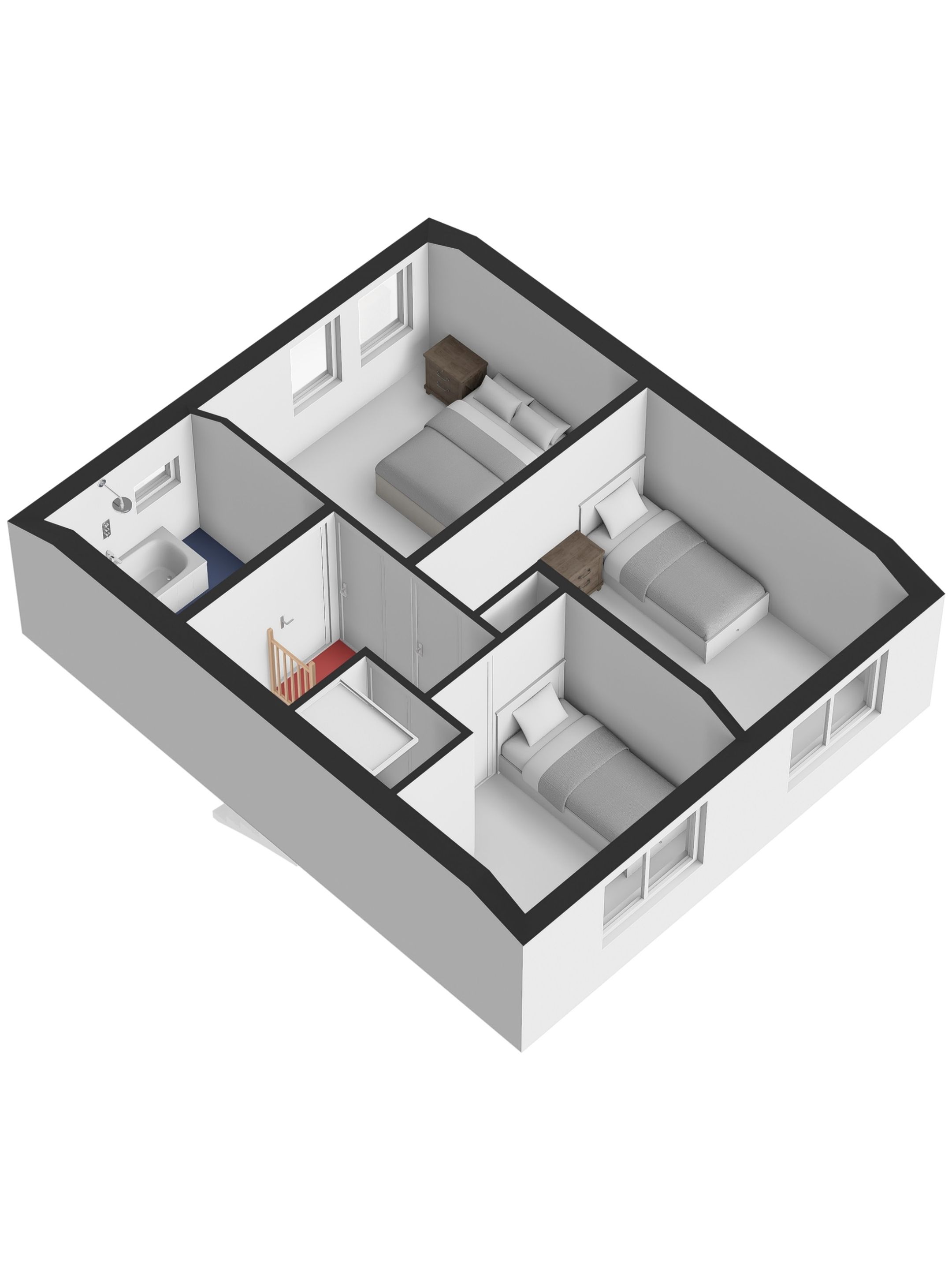 Via de houten trap met trapmatten bereik je de eerste verdieping. Hier liggen drie slaapkamers, een badkamer en een berging. In deze berging is ook een vaste ladder tegen de wand bevestigd die toegang geeft tot de ruime zolder.
