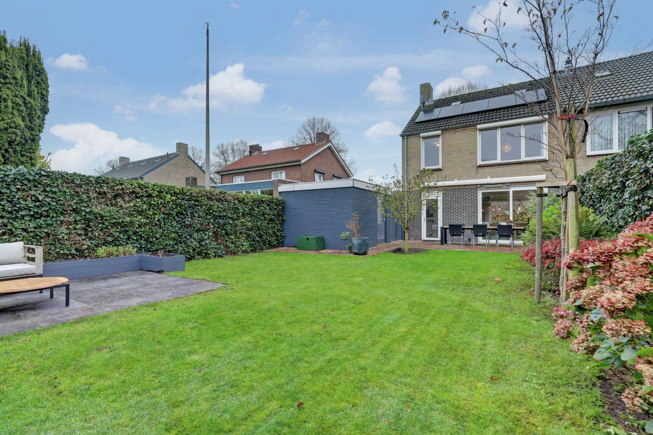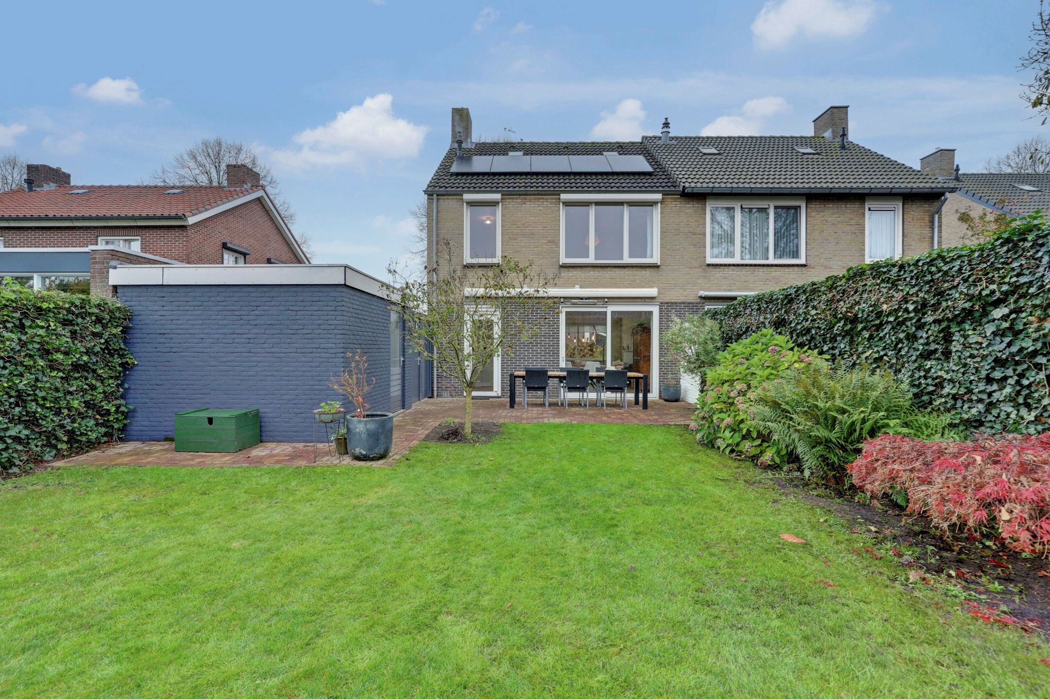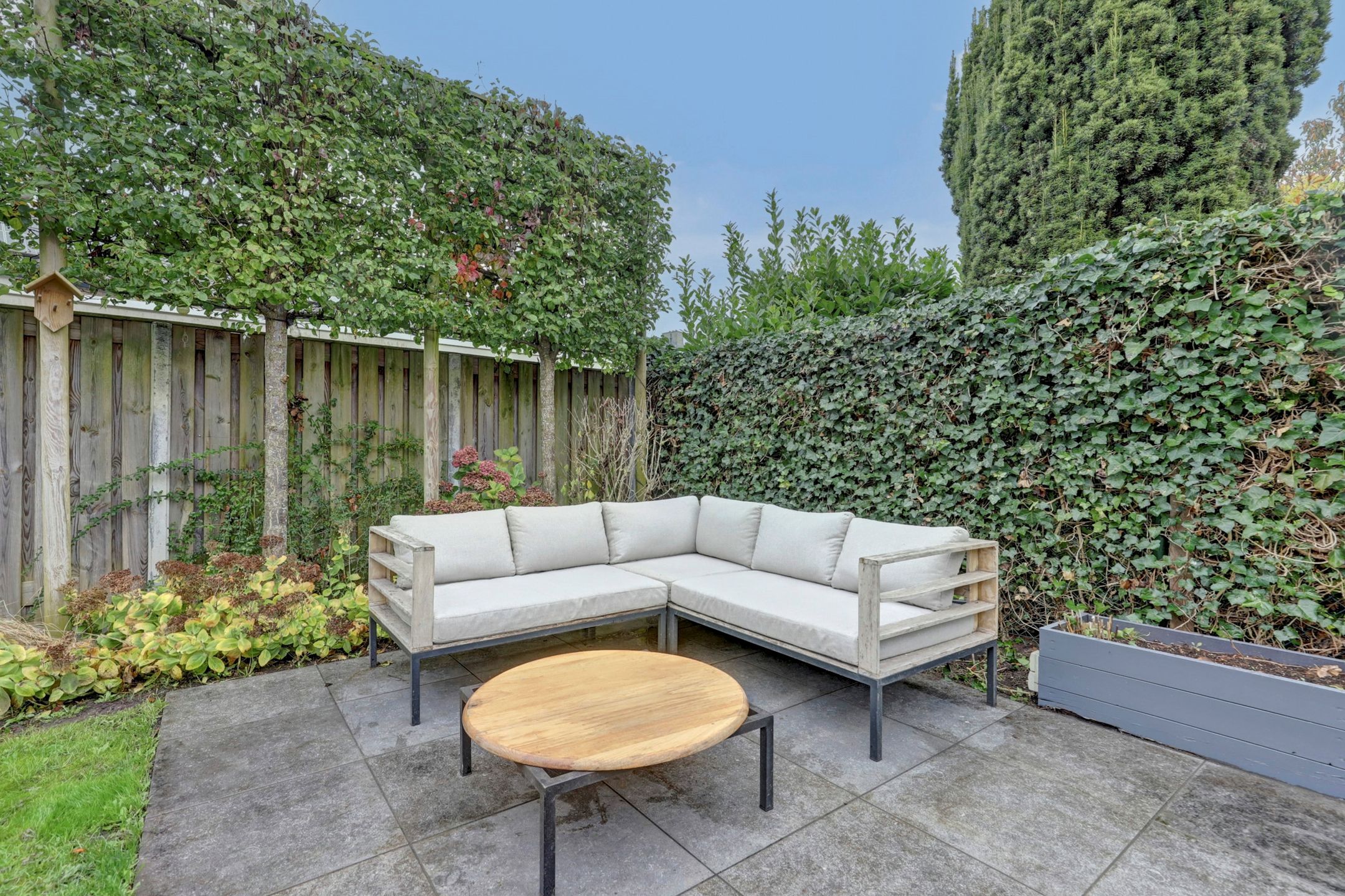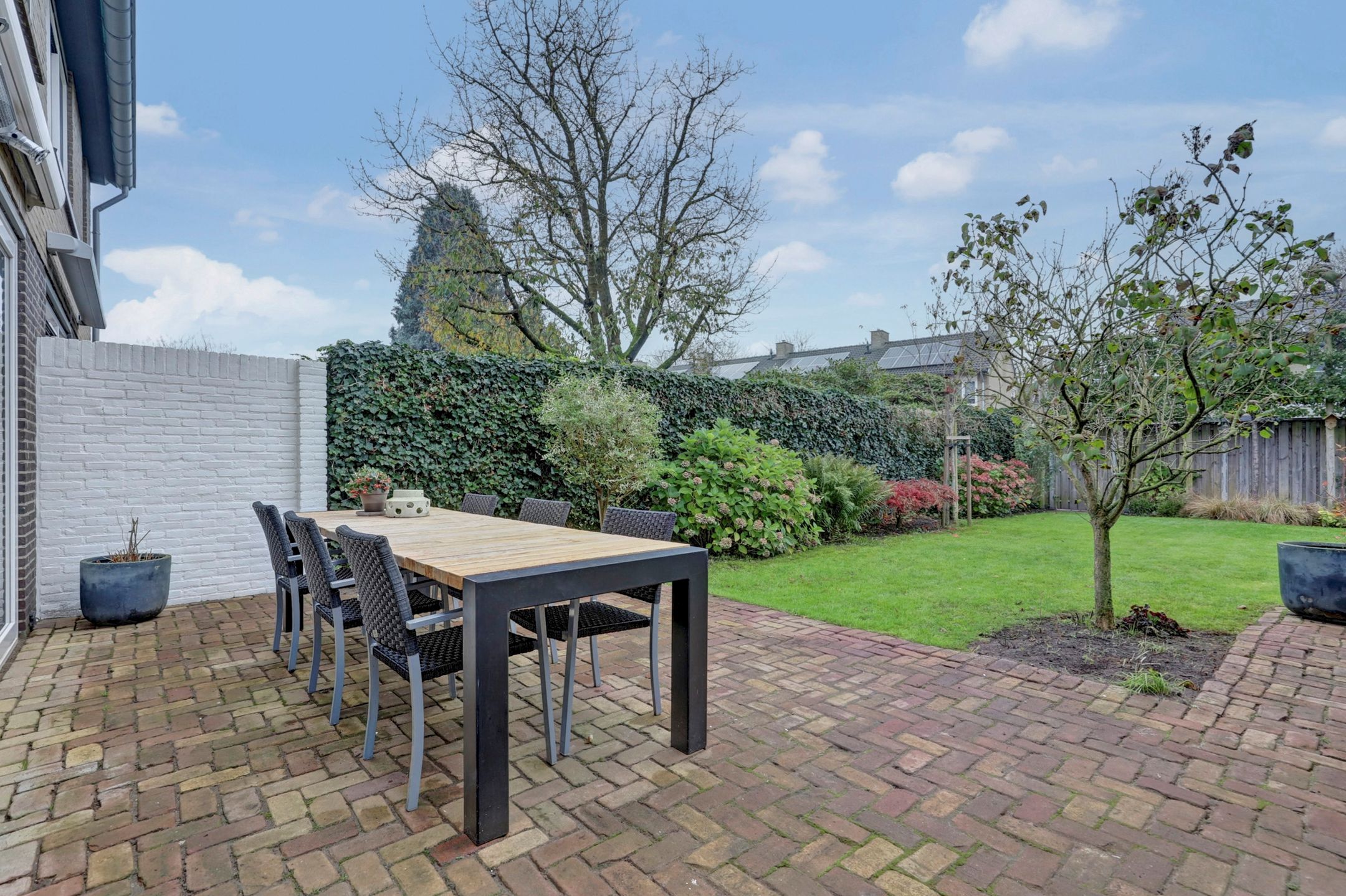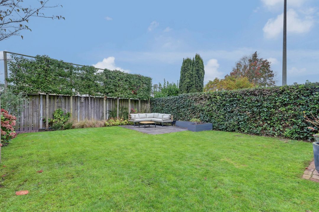 De achtertuin is mooi groen aangelegd met gazon, borders met onder andere een heerlijk ruikende sering, eetbare Japanse wijnbes en Japanse kornoelje. De leibomen helemaal achteraan op het perceel zorgen voor nog meer privacy. Op het terras direct achter de woning kun je heerlijk in de zon zitten of in de schaduw als je het elektrisch te bedienen zonnescherm even uitschuift. Achter in de tuin ligt nog een tweede terras. Om de tuin mooi groen te houden is er een grondwaterpomp aanwezig waarmee gesproeid kan worden. De tuin is geheel omheind en heeft een vrije achterom die uitkomt in de brandgang achter de woningen. In de tuin zijn diverse stopcontacten aanwezig, sfeerverlichting en een buitenkraan. De vrijstaande stenen garage is onlangs nog opnieuw in de verf gezet en hier zijn de witgoedaansluitingen aanwezig en voldoende plaats om bijvoorbeeld fietsen te stallen of een werkplaats te realiseren. Via een poort kom je bij de lange oprit die voor de garage ligt en waar met gemak drie auto’s kunnen parkeren.