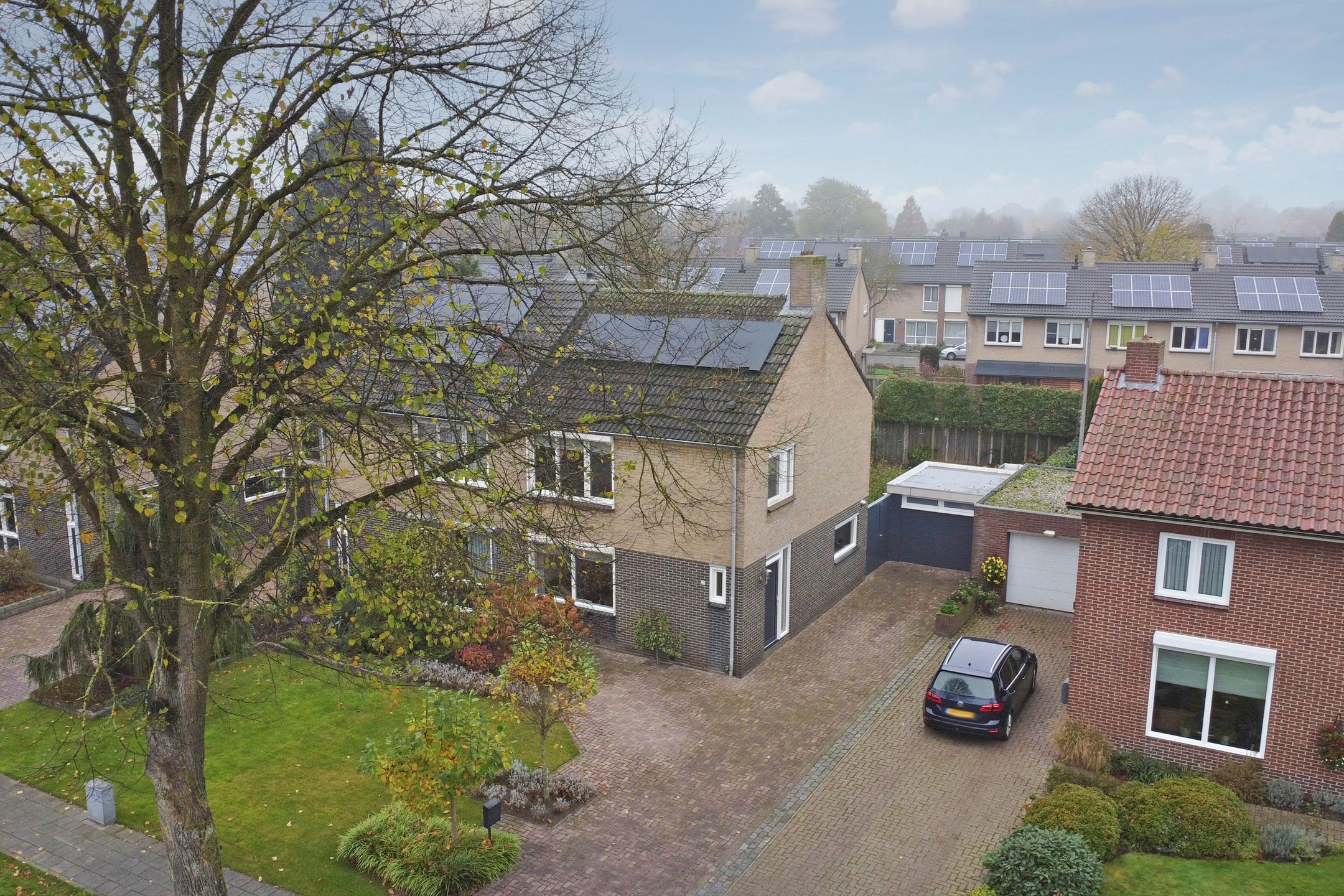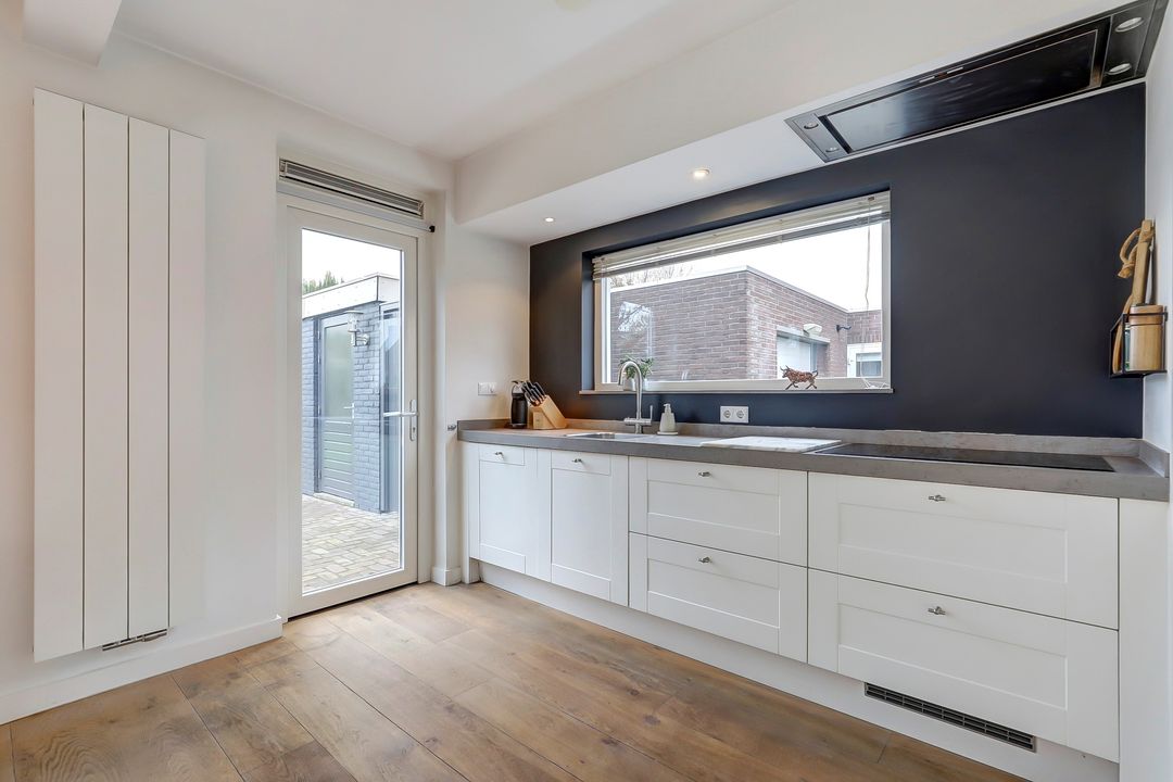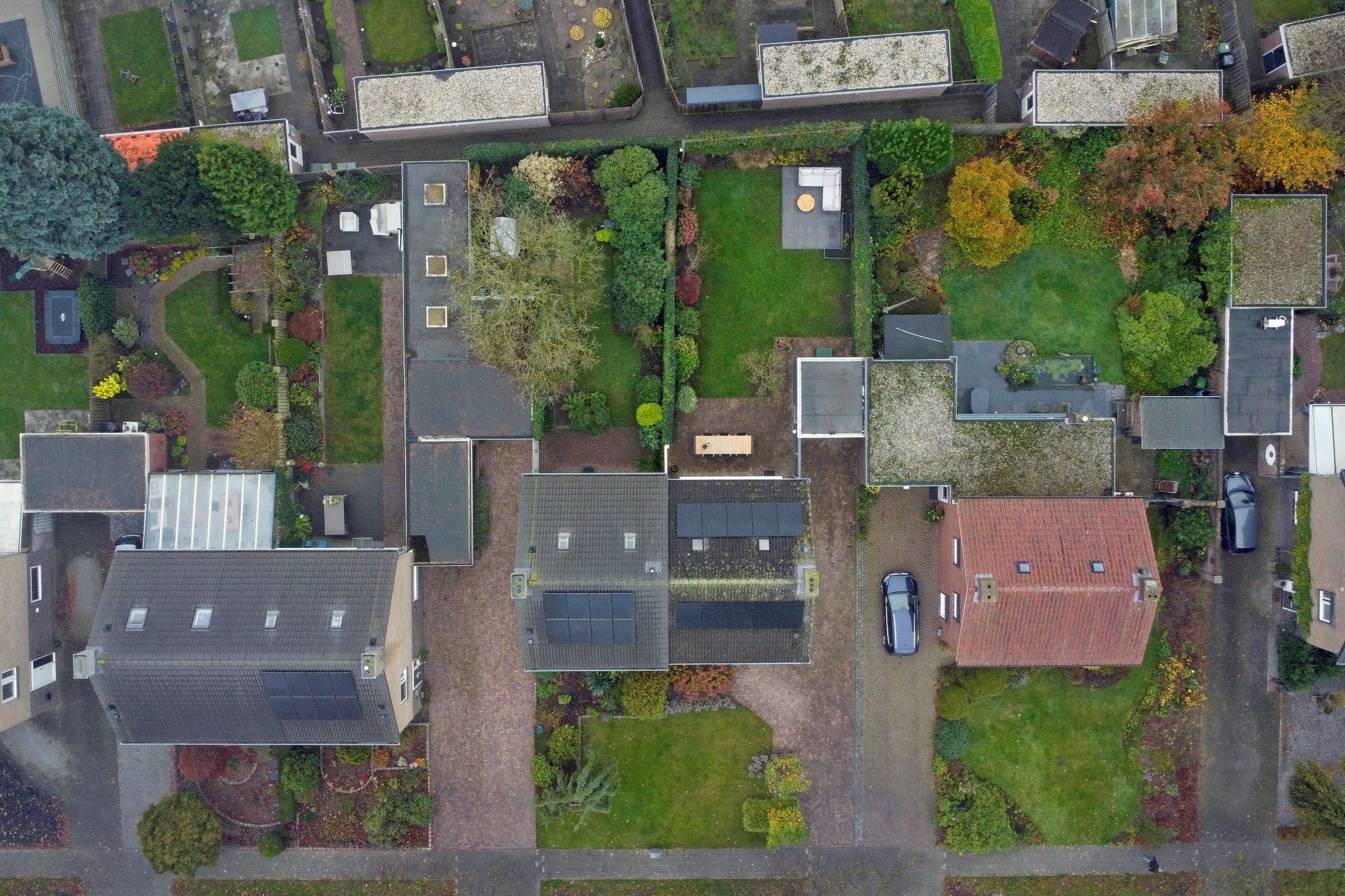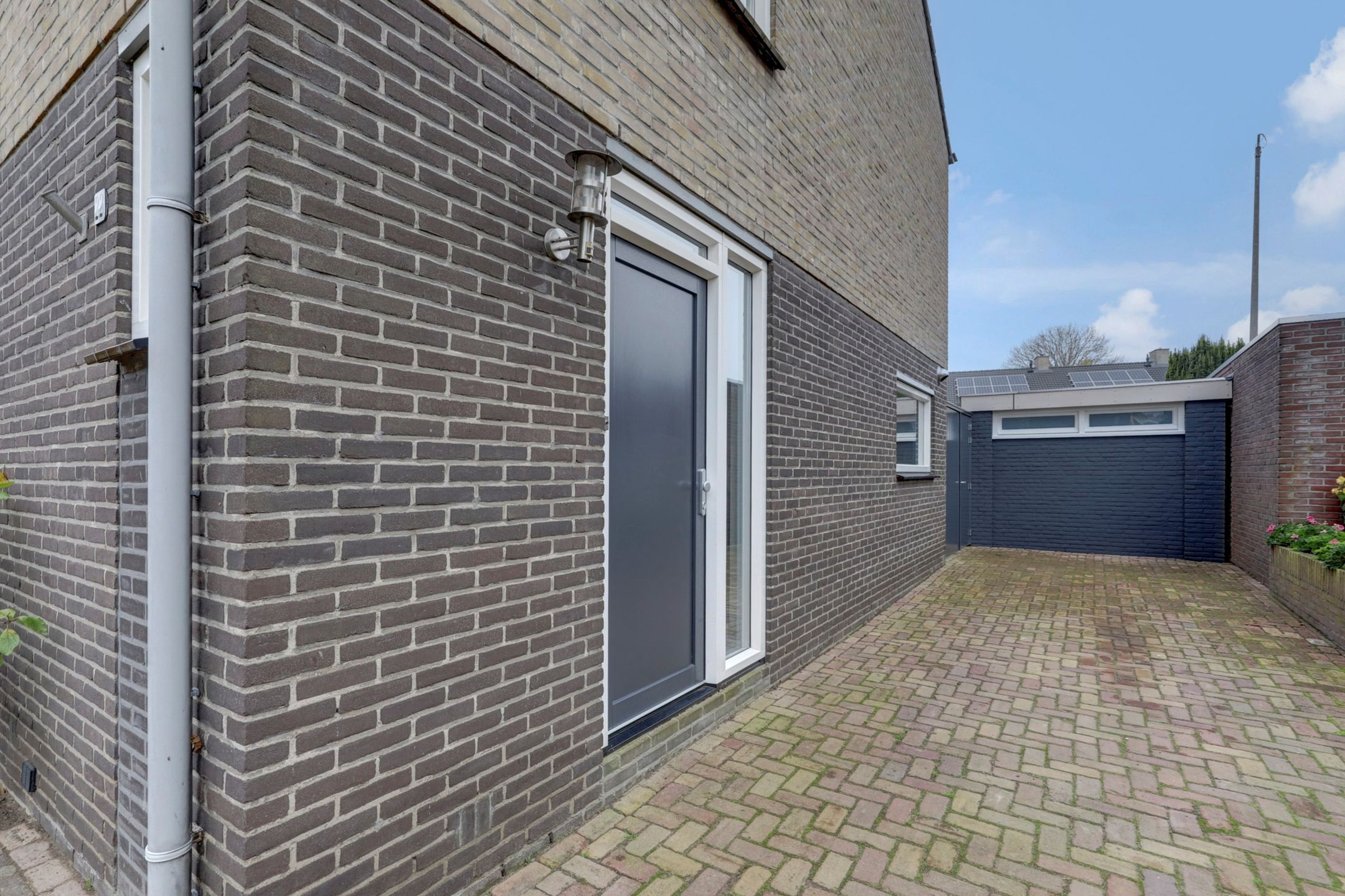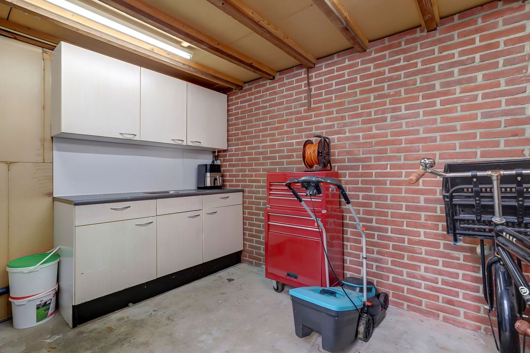 De achtertuin is mooi groen aangelegd met gazon, borders met onder andere een heerlijk ruikende sering, eetbare Japanse wijnbes en Japanse kornoelje. De leibomen helemaal achteraan op het perceel zorgen voor nog meer privacy. Op het terras direct achter de woning kun je heerlijk in de zon zitten of in de schaduw als je het elektrisch te bedienen zonnescherm even uitschuift. Achter in de tuin ligt nog een tweede terras. Om de tuin mooi groen te houden is er een grondwaterpomp aanwezig waarmee gesproeid kan worden. De tuin is geheel omheind en heeft een vrije achterom die uitkomt in de brandgang achter de woningen. In de tuin zijn diverse stopcontacten aanwezig, sfeerverlichting en een buitenkraan. De vrijstaande stenen garage is onlangs nog opnieuw in de verf gezet en hier zijn de witgoedaansluitingen aanwezig en voldoende plaats om bijvoorbeeld fietsen te stallen of een werkplaats te realiseren. Via een poort kom je bij de lange oprit die voor de garage ligt en waar met gemak drie auto’s kunnen parkeren.