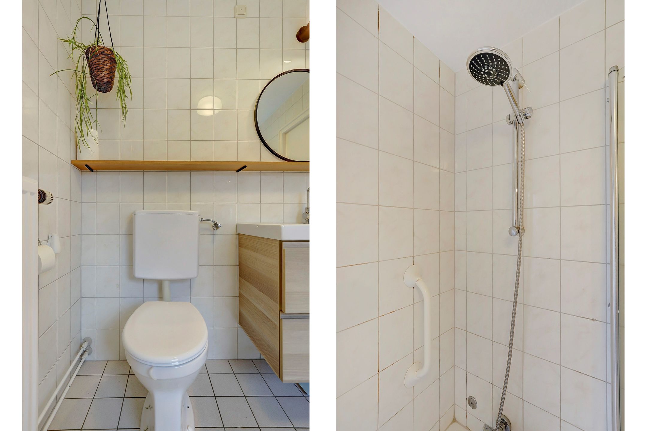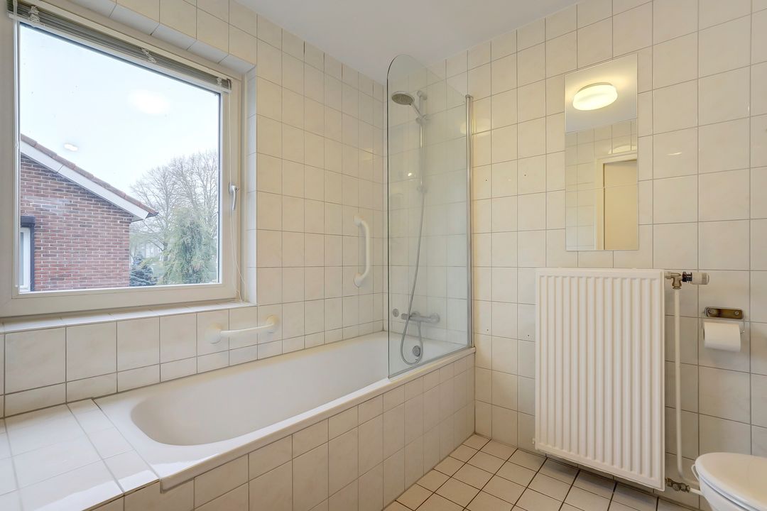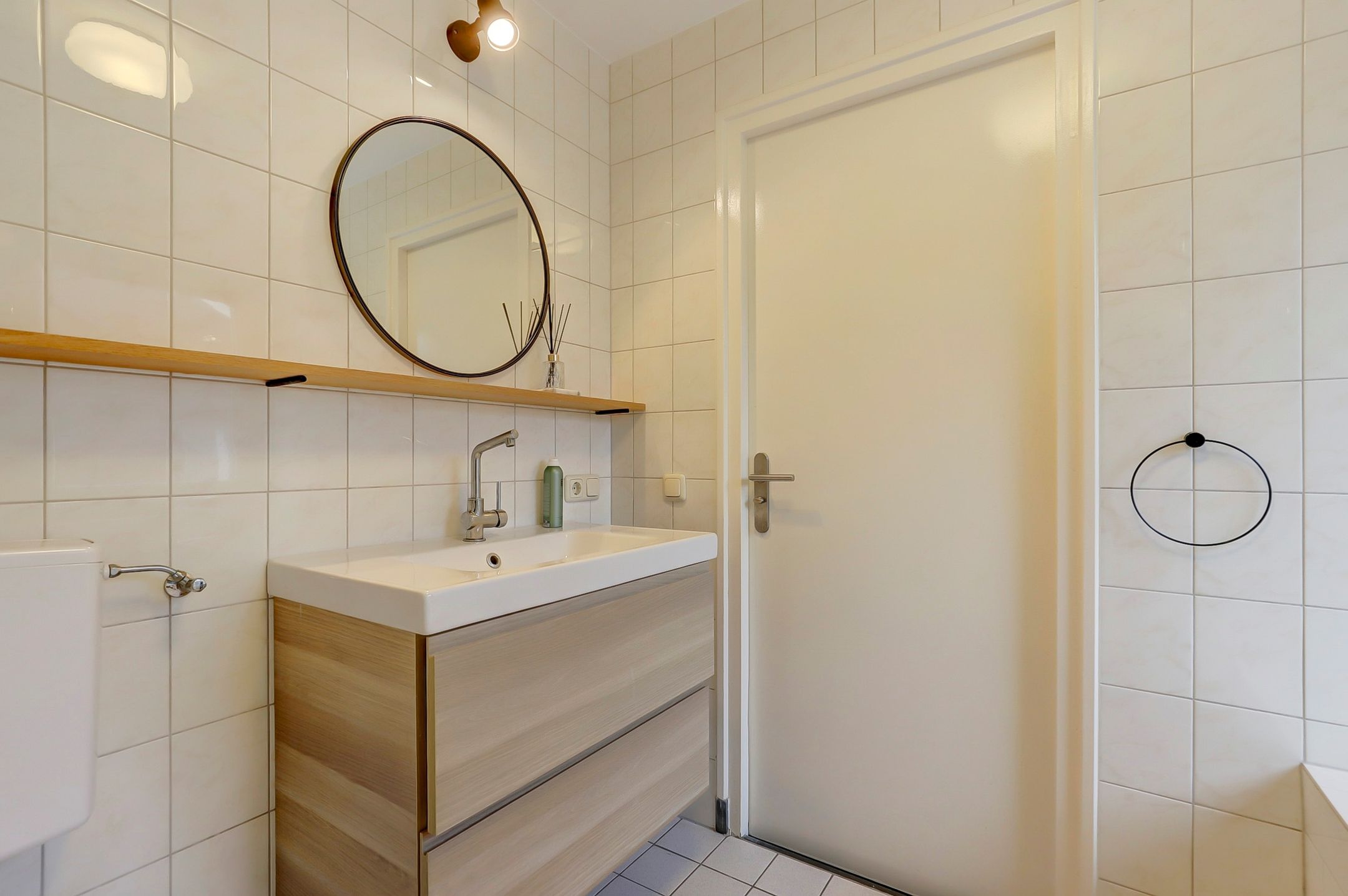 De badkamer is de enige ruimte die nog geen grondige renovatie heeft ondergaan. De badkamer is tijdloos ingericht met neutrale lichte tegels, een ligbad waar je ook in kunt douchen achter het glazen scherm, een vernieuwd wastafelmeubel en een toilet.