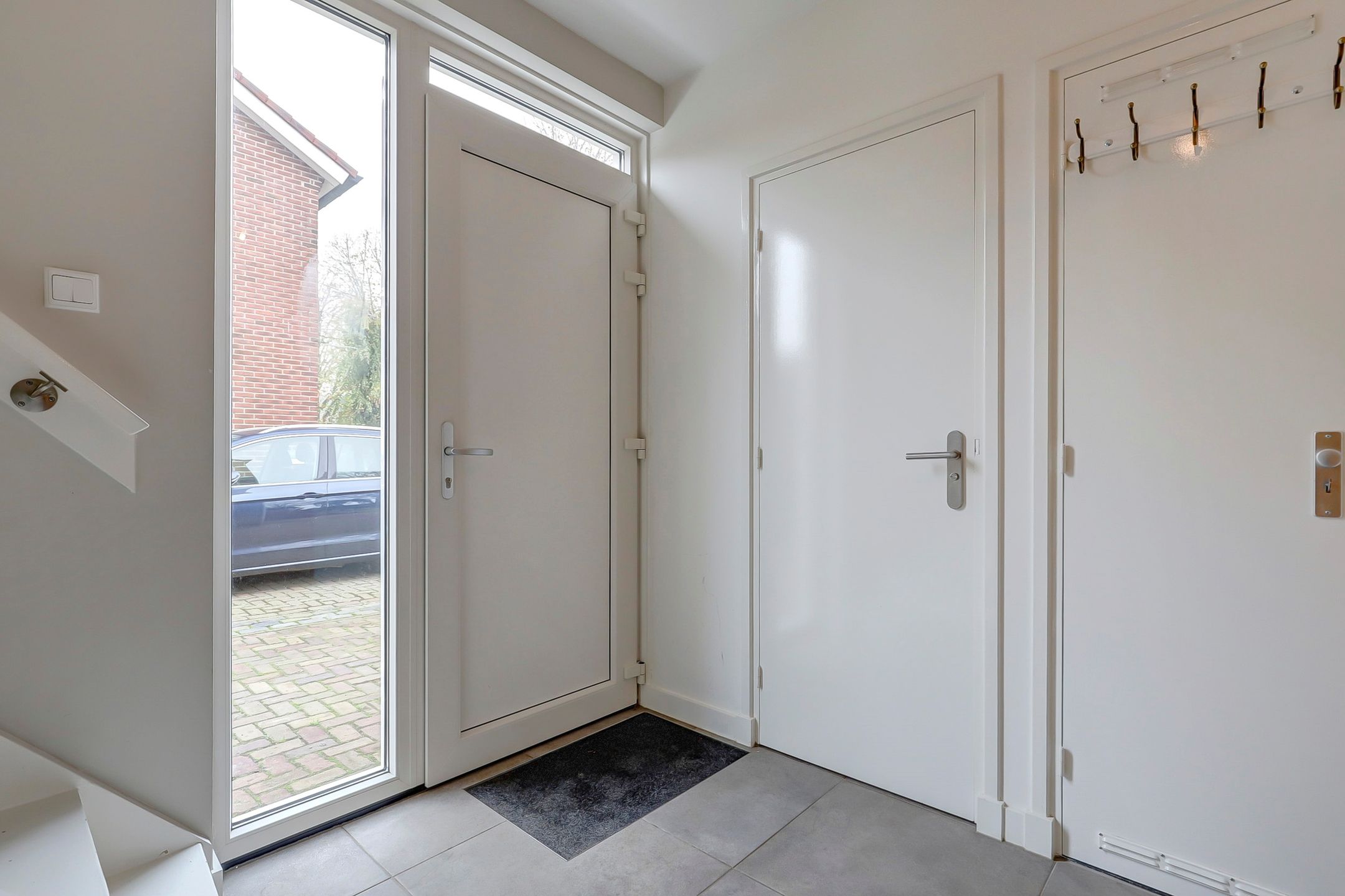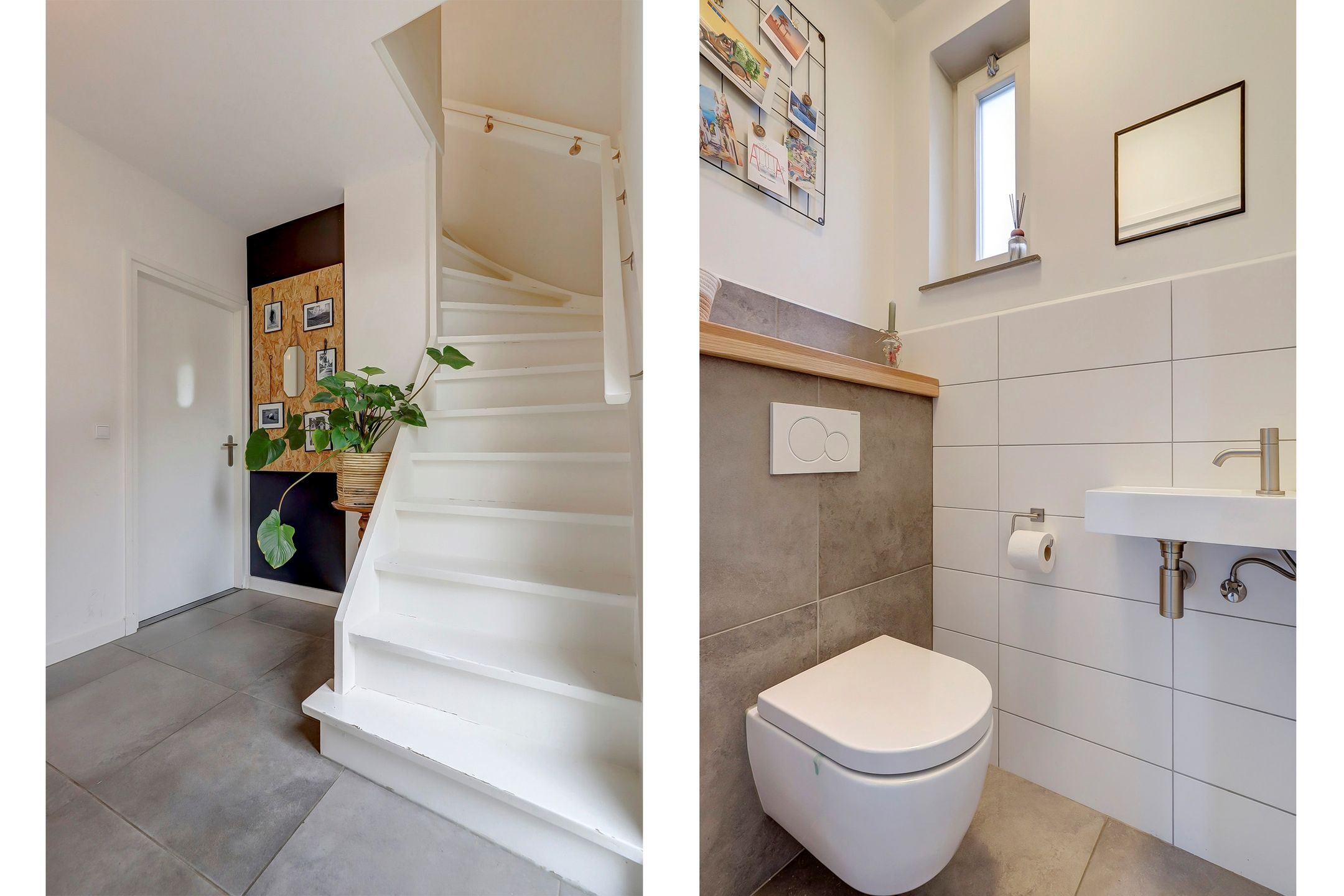 Via de extra lange oprit en naast de netjes aangelegde voortuin loop je naar de voordeur. Deze voordeur is enkele jaren geleden pas geplaatst en van onderhoudsvrije kunststof. In de hal bevindt zich de meterkast met 24 groepen en een toiletruimte met wandtoilet en fonteintje. De vloer bestaat uit lichtgrijze tegels.
