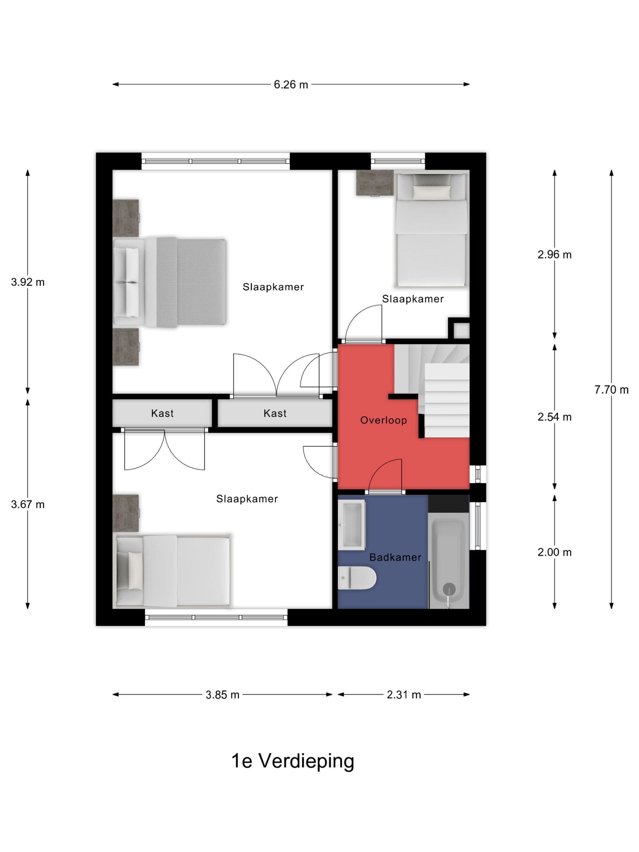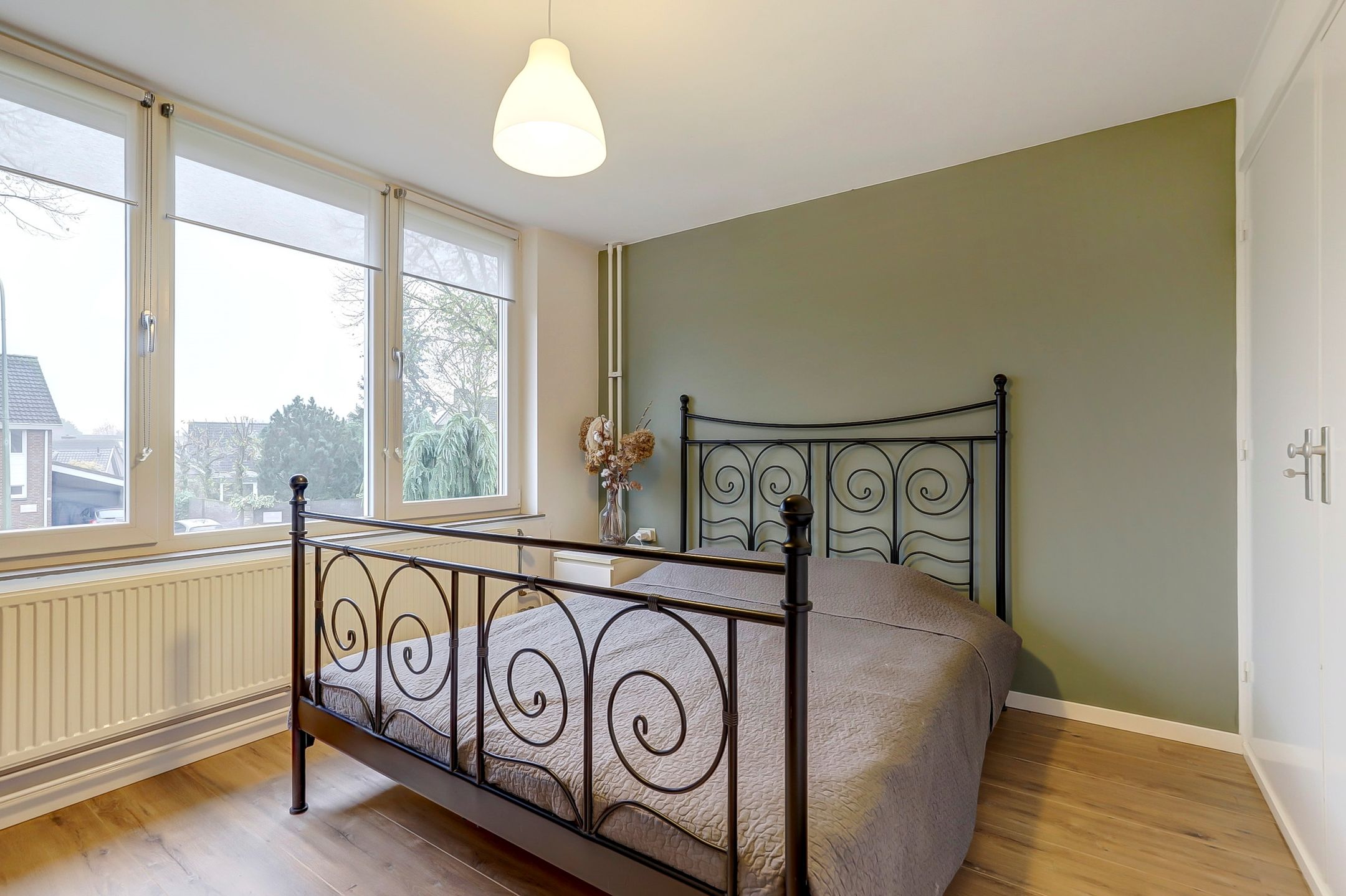 Op de eerste verdieping liggen drie slaapkamers en de badkamer. Zowel de slaapkamers als de overloop zijn voorzien van een laminaatvloer. Leuk weetje: via het kleine raampje bij de zoldertrap kijk je in de winter precies op de klok van de kerktoren van Helden.