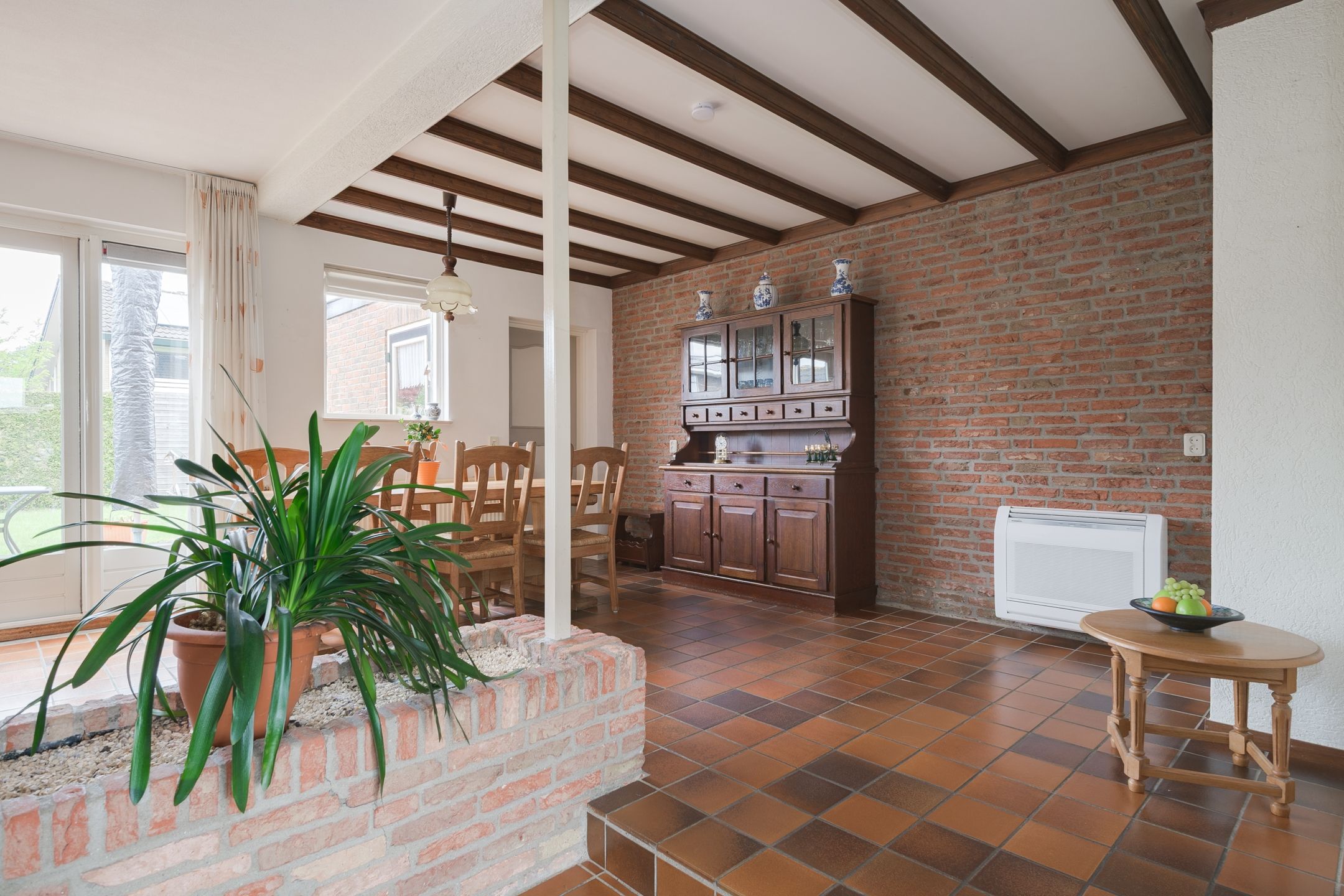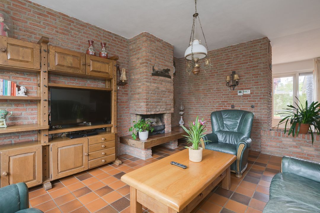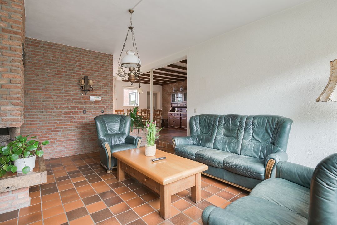 De ruime, lichte woonkamer wordt gekenmerkt door een uniek element: het zitgedeelte is 15 cm verlaagd, wat zorgt voor een gezellige, intieme sfeer. De fraai gemetselde open haard vormt een sfeervol middelpunt. De grote raampartij laat veel daglicht binnen en maakt de ruimte heerlijk licht. De bakstenen muren en houten balken in het plafond geven de woonkamer een warm en authentiek karakter. Er is voldoende ruimte voor zowel een comfortabele zithoek als een royale eettafel.