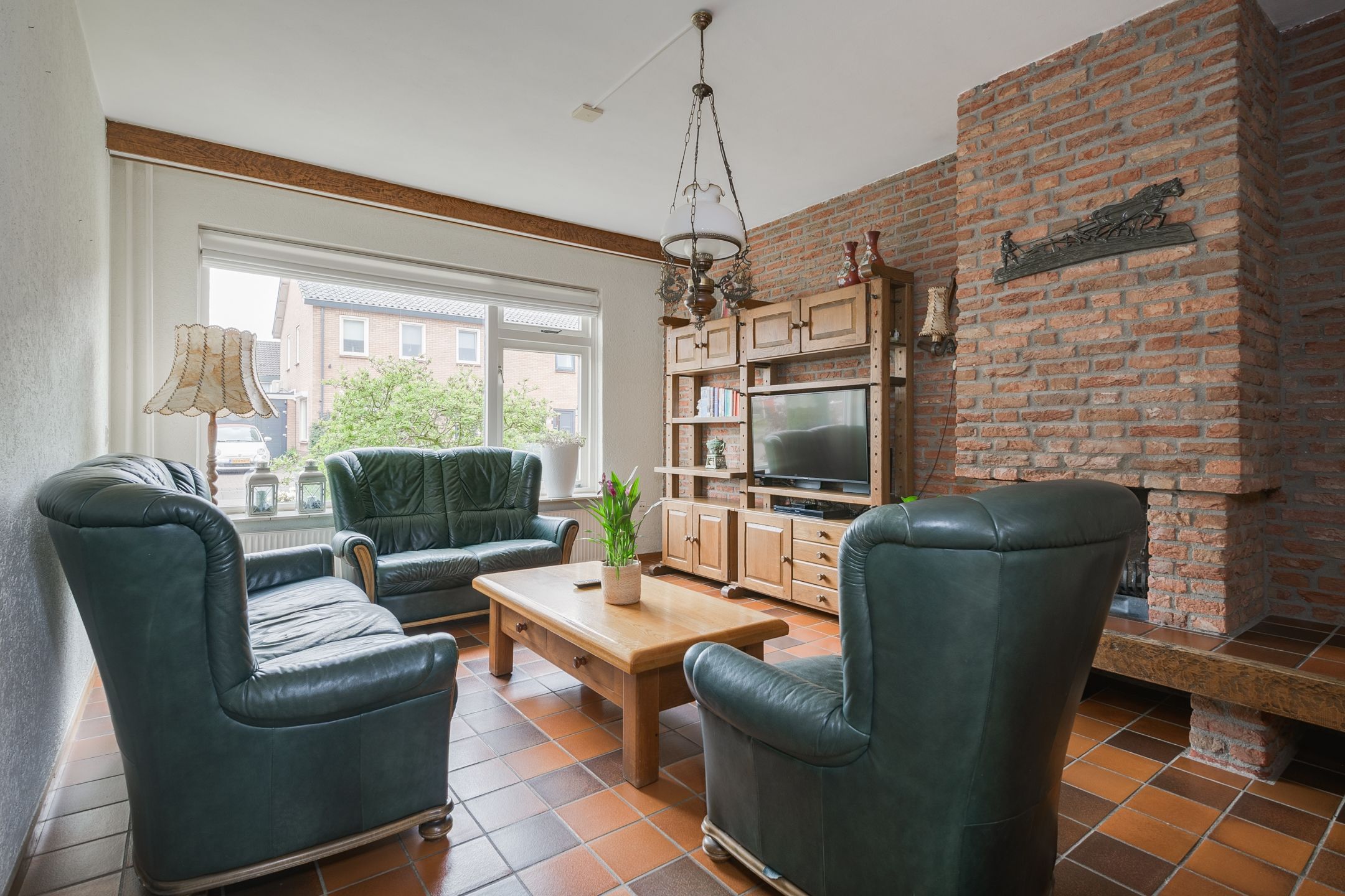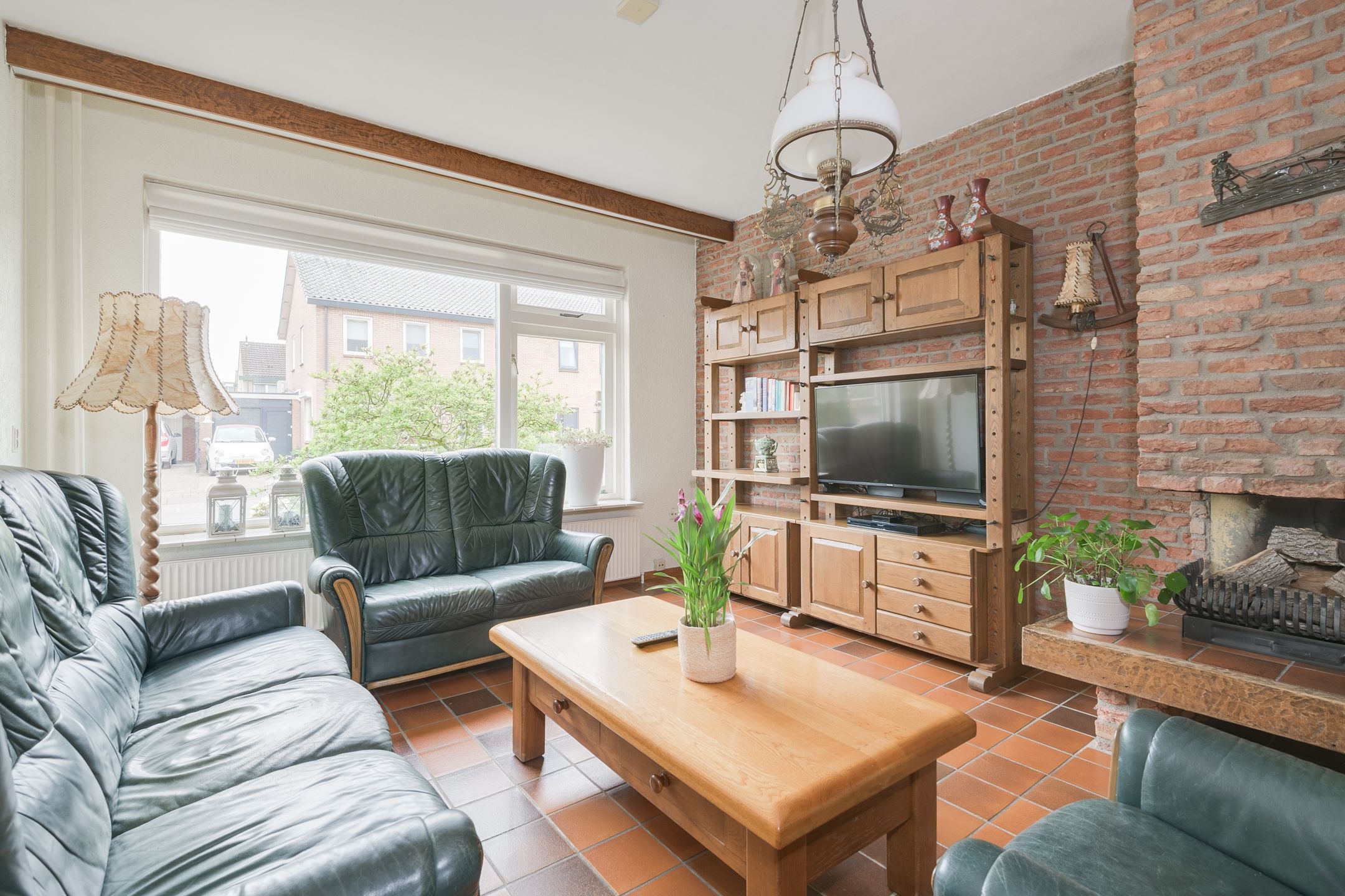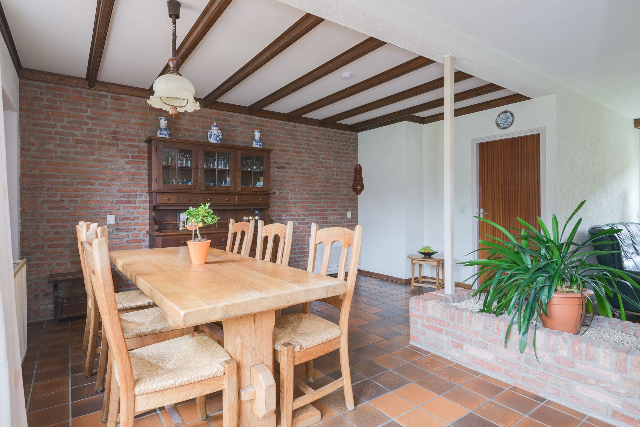 De ruime, lichte woonkamer wordt gekenmerkt door een uniek element: het zitgedeelte is 15 cm verlaagd, wat zorgt voor een gezellige, intieme sfeer. De fraai gemetselde open haard vormt een sfeervol middelpunt. De grote raampartij laat veel daglicht binnen en maakt de ruimte heerlijk licht. De bakstenen muren en houten balken in het plafond geven de woonkamer een warm en authentiek karakter. Er is voldoende ruimte voor zowel een comfortabele zithoek als een royale eettafel.
