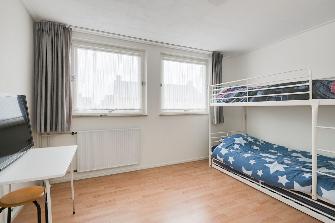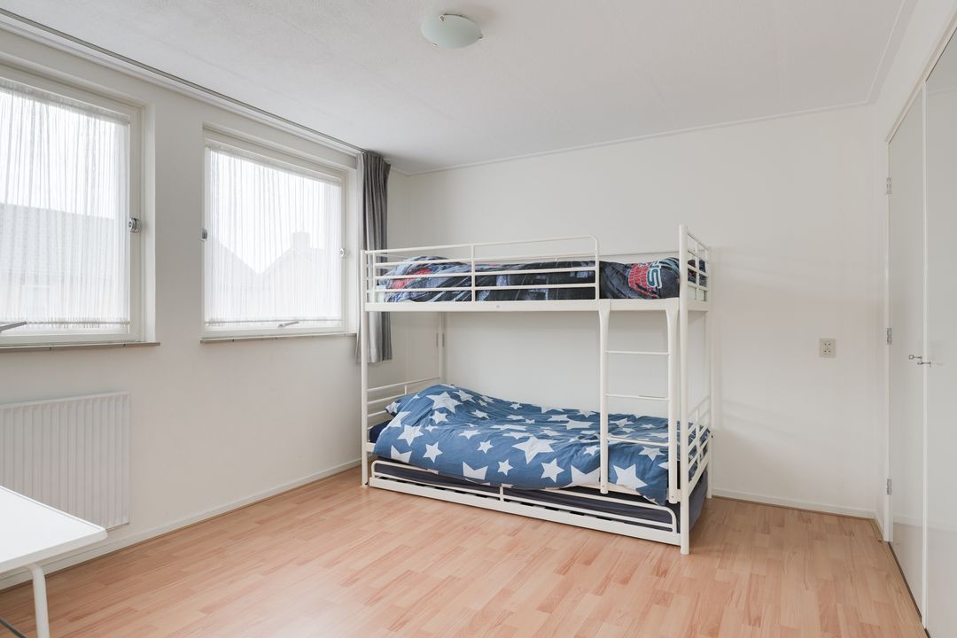 De tweede slaapkamer ligt aan de voorzijde van de woning en is voorzien van een vaste hang – en legkast en dubbele tuimelramen. Deze kamer is momenteel ingericht als kinderkamer met een stapelbed, maar biedt natuurlijk alle ruimte voor een andere invulling.