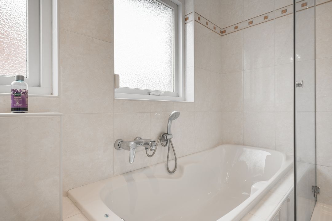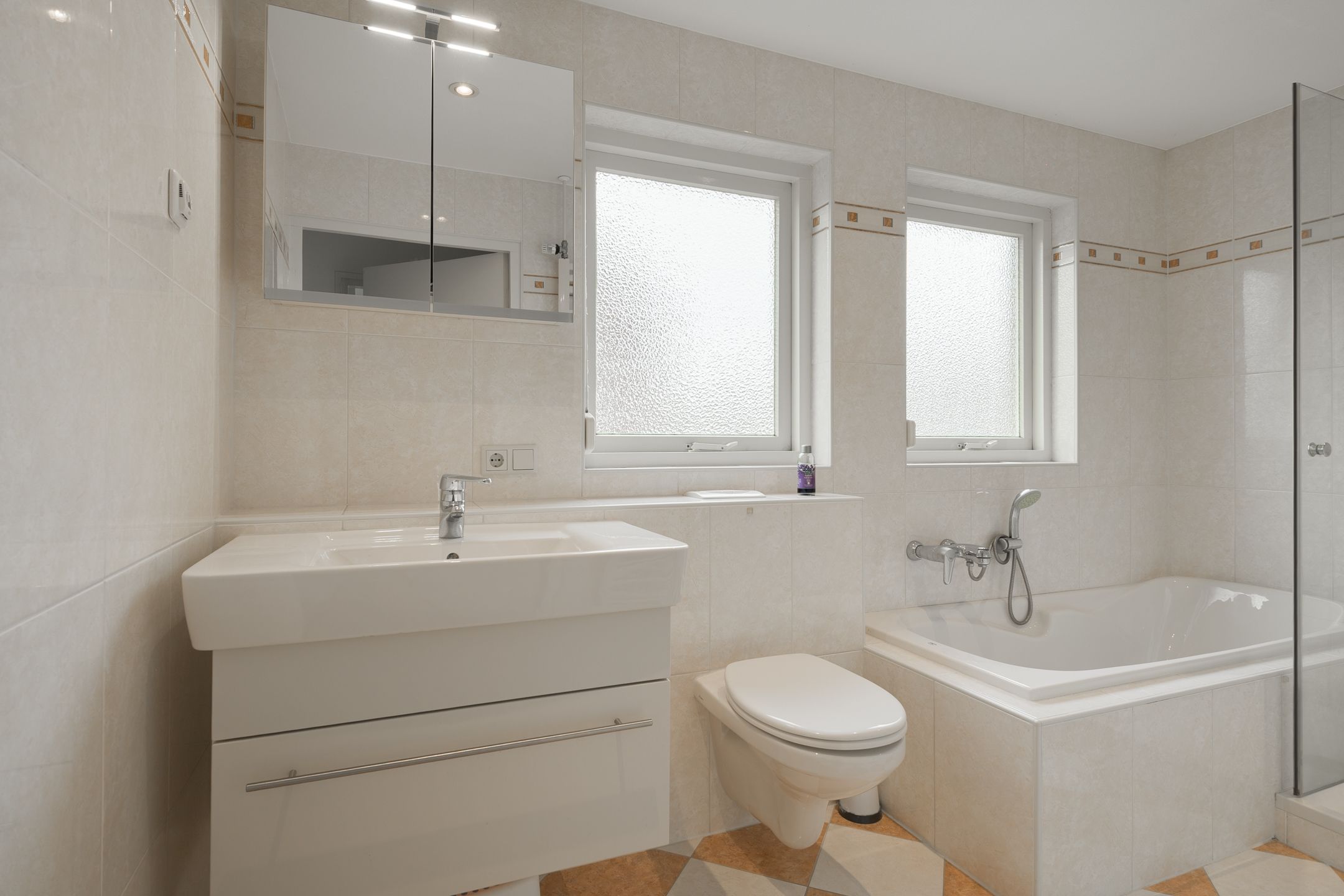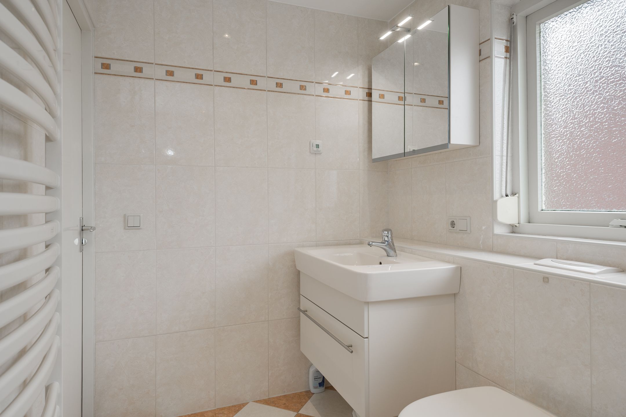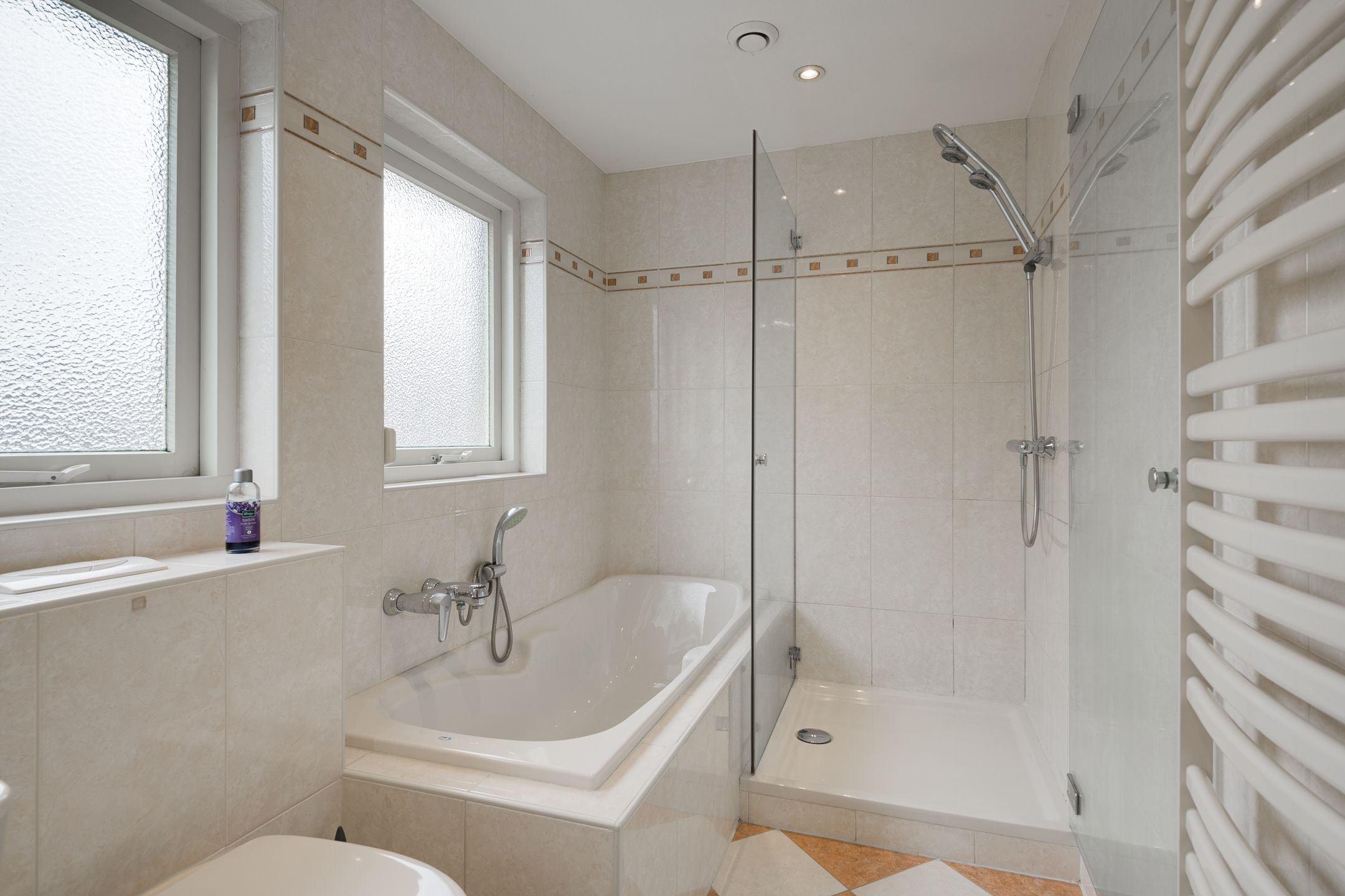 De badkamer is smaakvol ingericht met lichte tegels en voorzien van een ligbad, separate douche, toilet en wastafelmeubel. De klapramen zorgen voor prettige natuurlijke ventilatie en lichtinval. De badkamer is functioneel en biedt alle comfort dat u nodig heeft. Een luxe detail is – naast de designradiator – de extra elektrische vloerverwarming, die zorgt voor warme voeten tijdens frisse ochtenden en avonden.