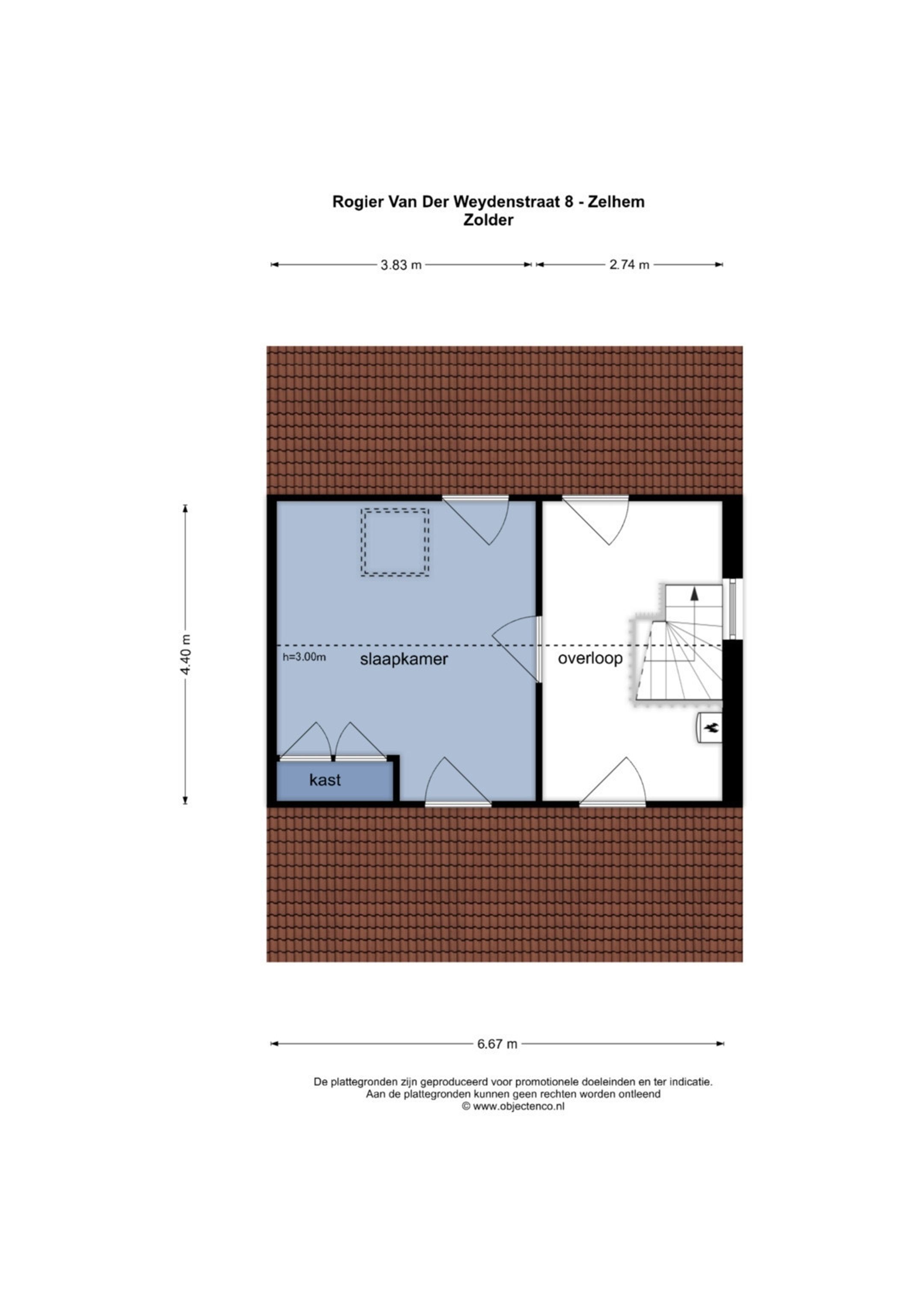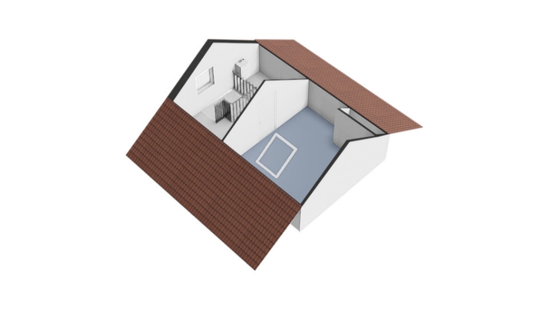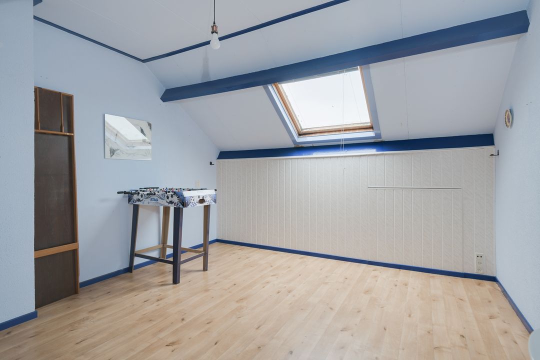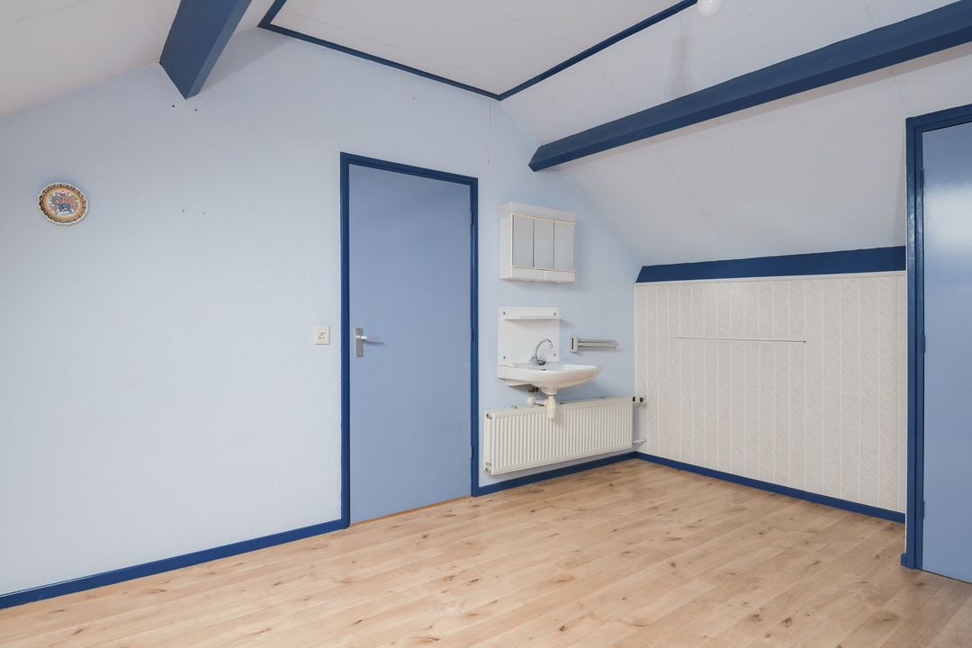 Deze ruime zolderkamer is voorzien van blauwe wanden, een vaste hang – en legkast en een wastafel. Dankzij het grote tuimeldakraam is de kamer heerlijk licht. De schuine wanden geven veel opbergruimte en een knus karakter. Deze veelzijdige kamer is ideaal als extra slaapkamer, maar kan ook uitstekend dienst doen als hobby-, speel- of werkkamer.