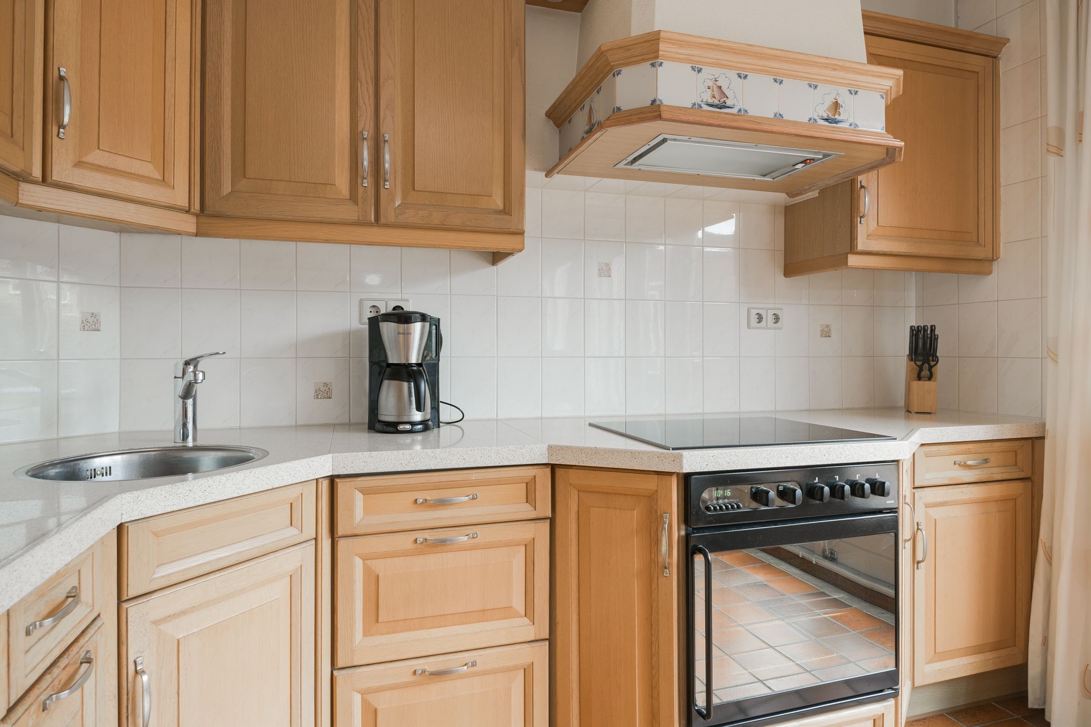De keuken staat in open verbinding met het eetgedeelte, wat zorgt voor een prettige leefruimte. De keuken is voorzien van een composiet werkblad en alle benodigde apparatuur: een 4-pits inductiekookplaat, afzuigkap, koelkast, magnetron, oven en vaatwasser. Via de openslaande deuren heeft u direct toegang tot het terras en de achtertuin – ideaal tijdens zomerse dagen. De fraaie tegelvloer, die doorloopt over de gehele begane grond, is bijzonder praktisch in onderhoud.