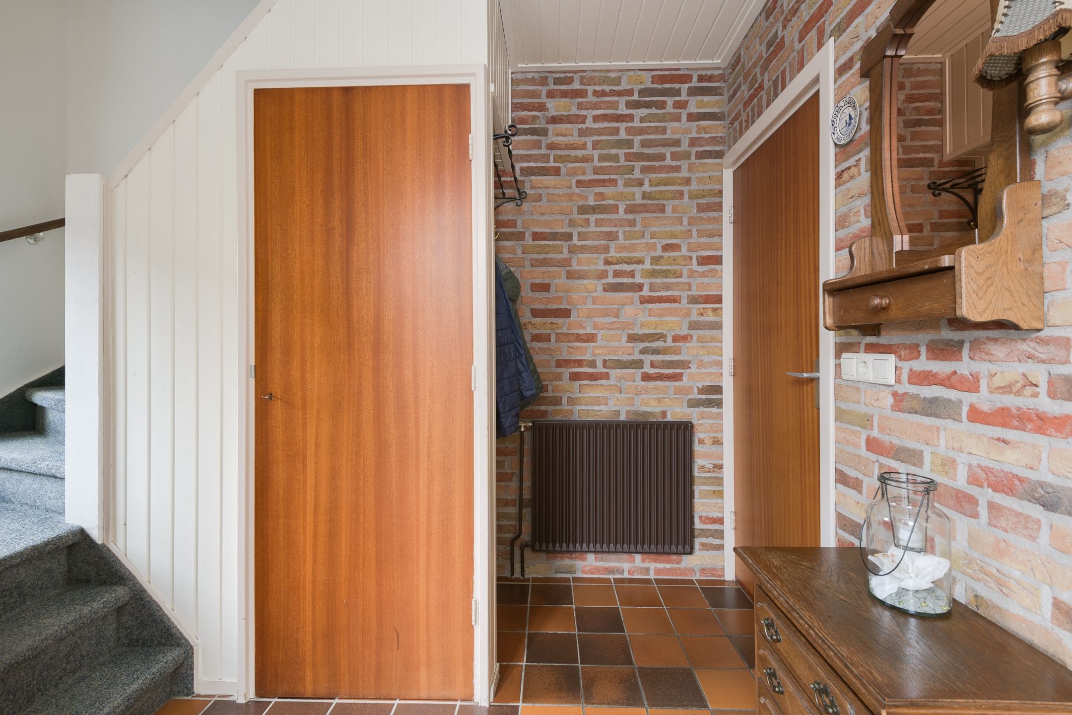 Via de nette voortuin met uw eigen oprit bereikt u de entree van de woning. De hal is praktisch ingedeeld met karakteristieke bakstenen muren die direct sfeer geven. Hier vindt u de toegang tot het authentieke toilet met fonteintje, de meterkast (voorzien van 10 stroomgroepen) en de vaste trap naar de eerste verdieping. Onder het trapbordes bevindt zich een praktische trapkast/verlaagde kelderruimte (180 x 150 cm, 130 cm hoog). De hal geeft tevens toegang tot de woonkamer.
