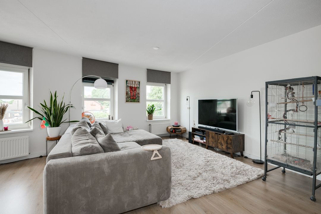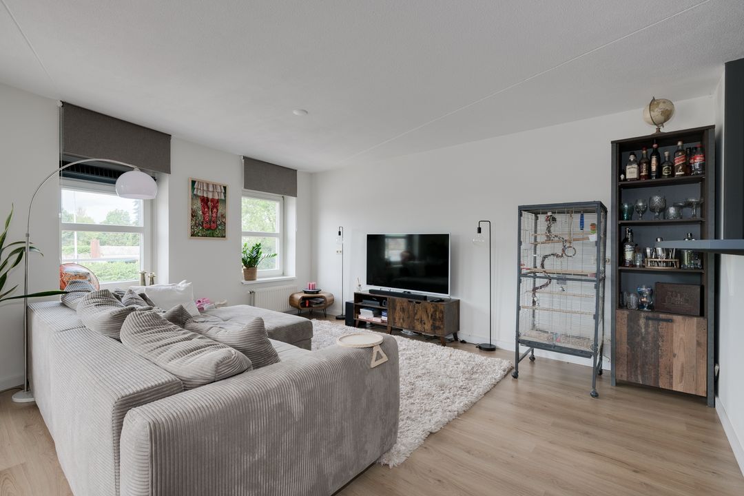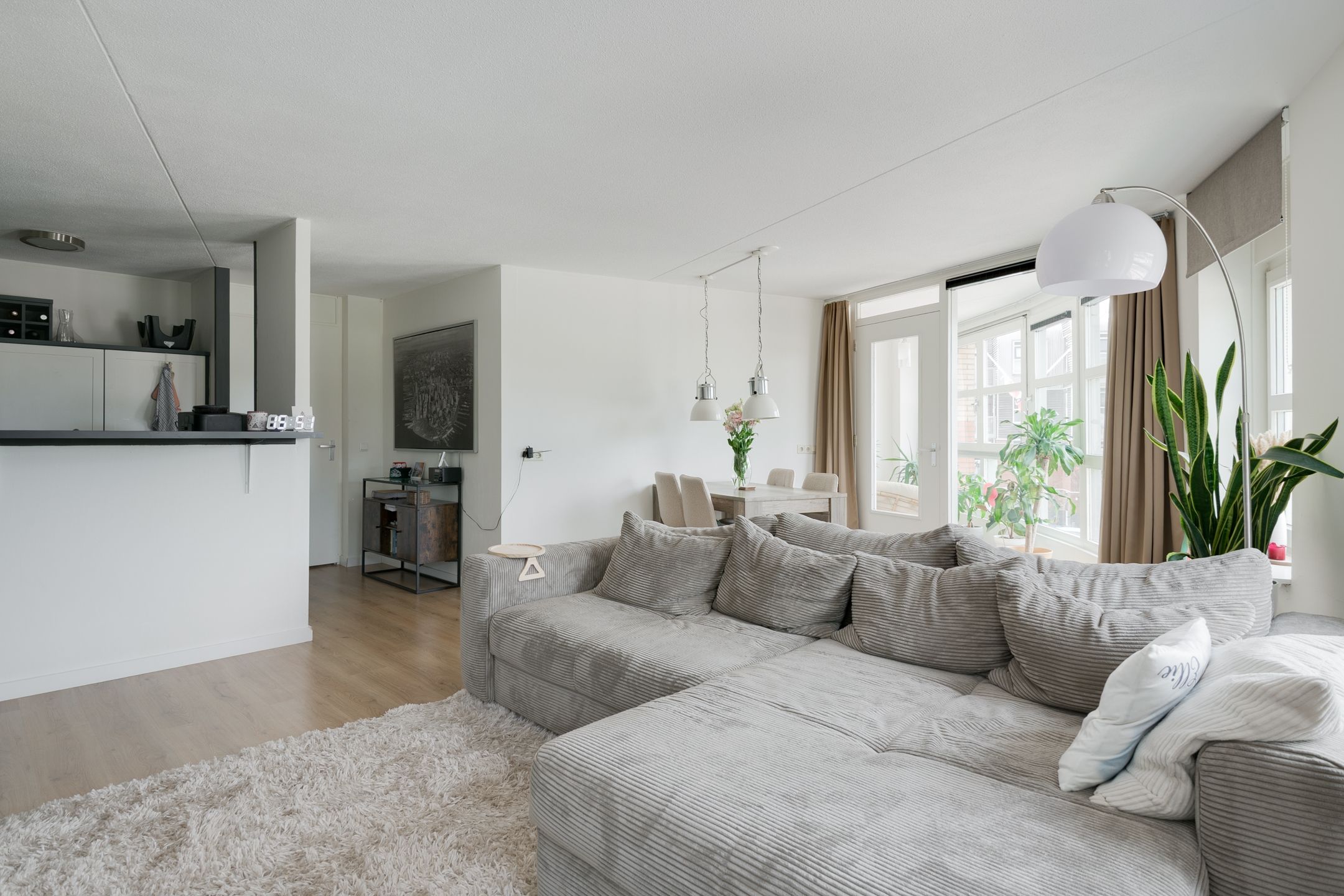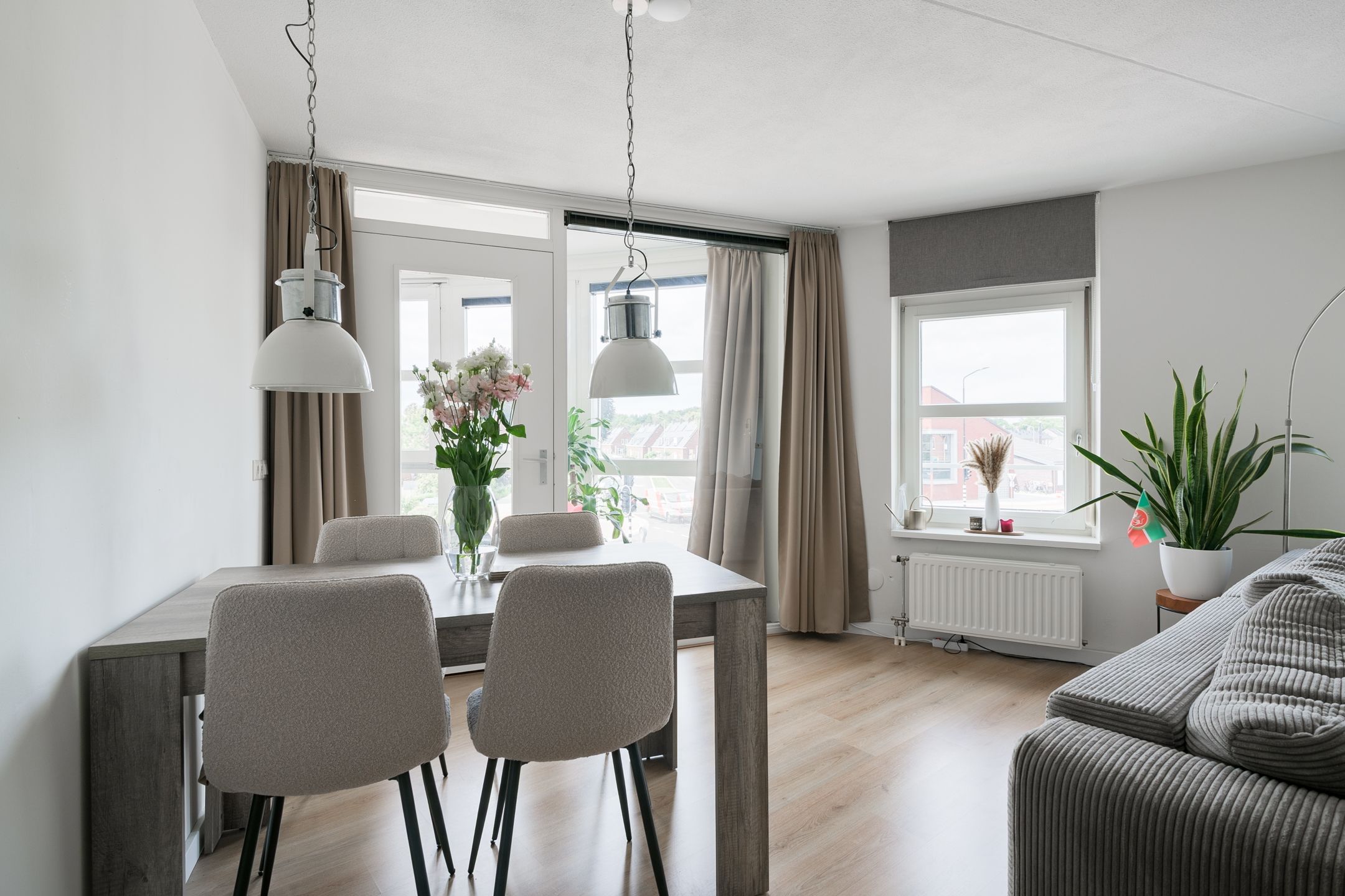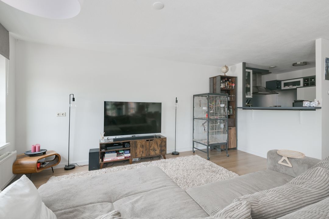 De woonkamer profiteert van de kromming van de gebouwvorm, waardoor een interessant ruimtelijk effect ontstaat. Door de ligging op de eerste verdieping kijkt u uit op de directe omgeving en het reilen en zeilen in de straat, zonder de connectie met de begane grond te verliezen. De neutrale laminaatvloer en witte wanden bieden een frisse basis voor uw eigen meubelkeuze. De ruimte is praktisch ingedeeld voor zowel een gezellige zithoek als een eetgedeelte.