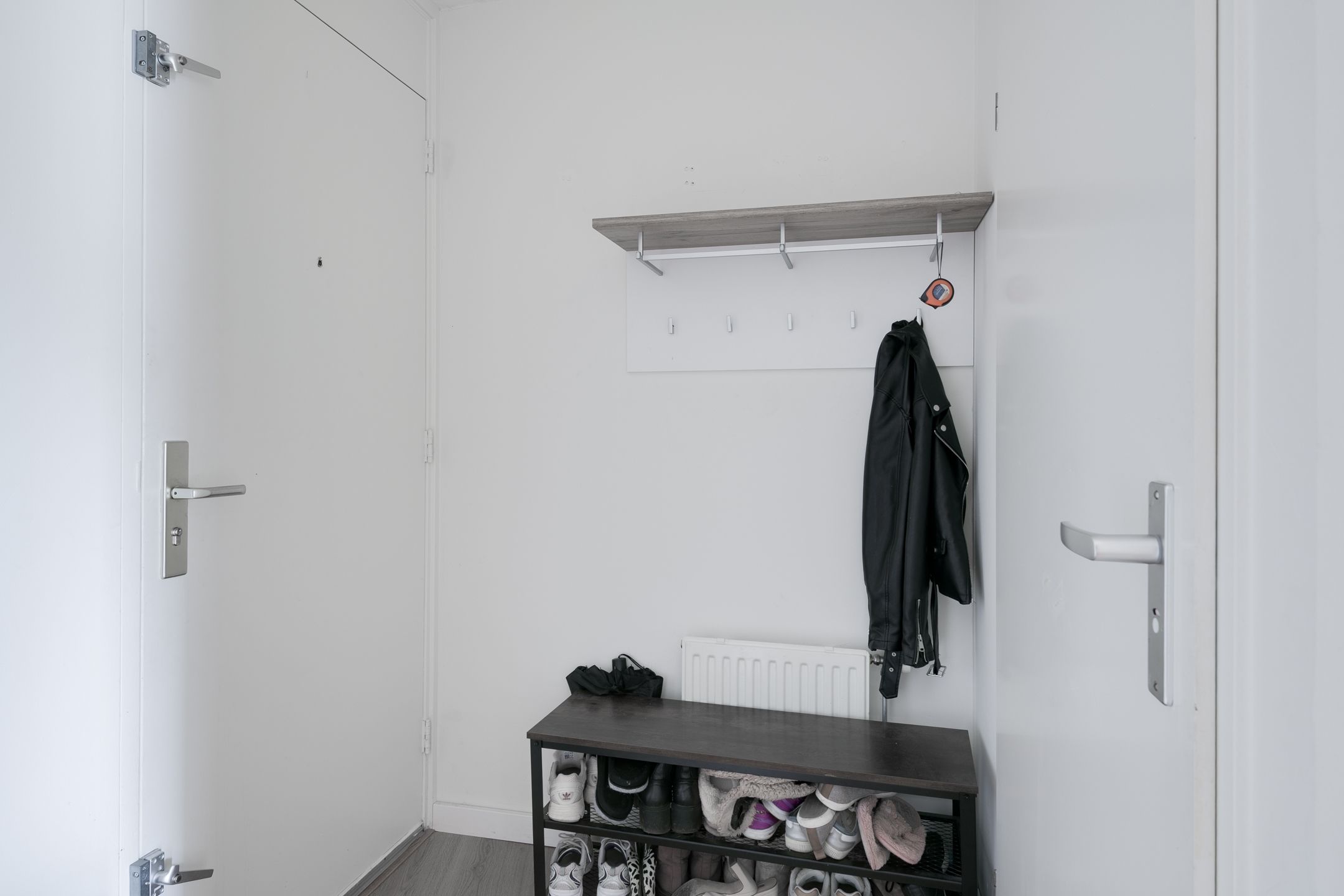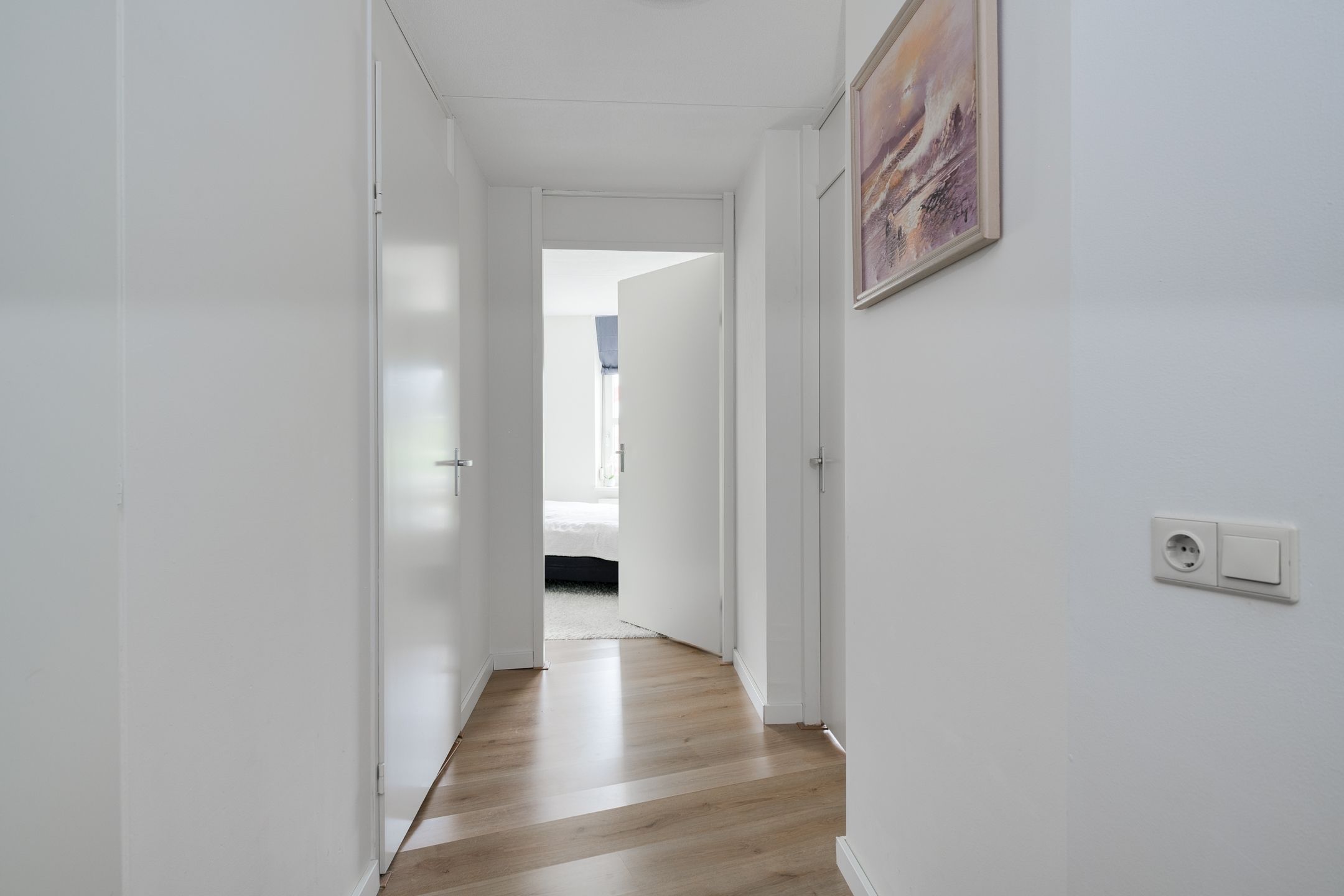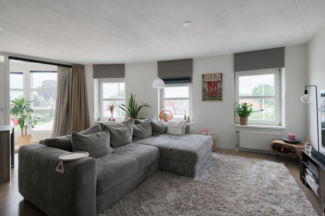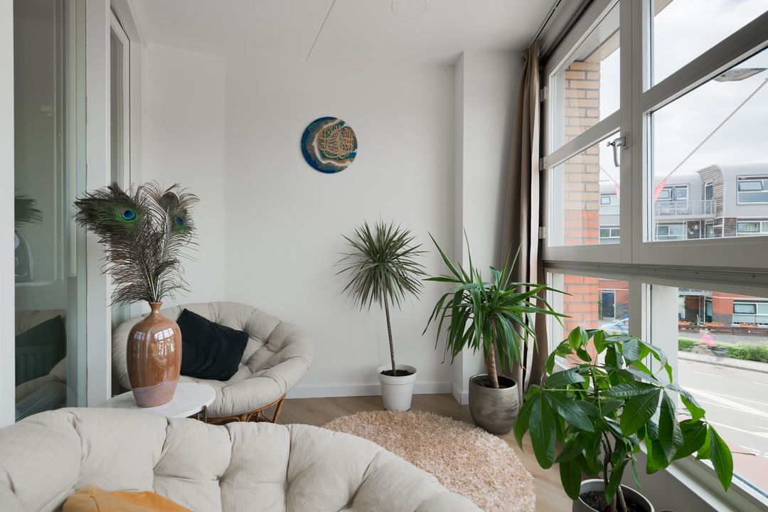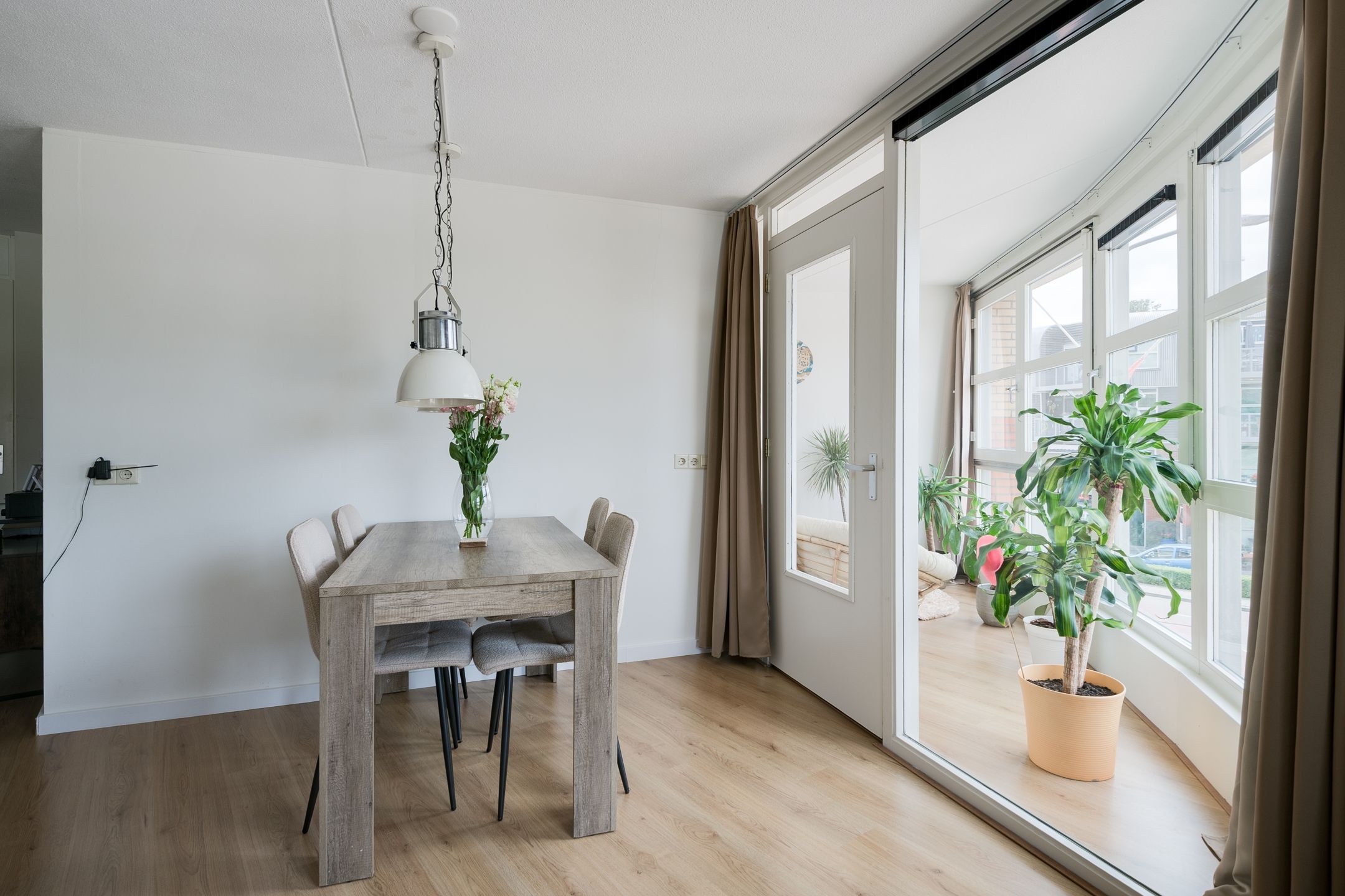 De woonkamer profiteert van de kromming van de gebouwvorm, waardoor een interessant ruimtelijk effect ontstaat. Door de ligging op de eerste verdieping kijkt u uit op de directe omgeving en het reilen en zeilen in de straat, zonder de connectie met de begane grond te verliezen. De neutrale laminaatvloer en witte wanden bieden een frisse basis voor uw eigen meubelkeuze. De ruimte is praktisch ingedeeld voor zowel een gezellige zithoek als een eetgedeelte.