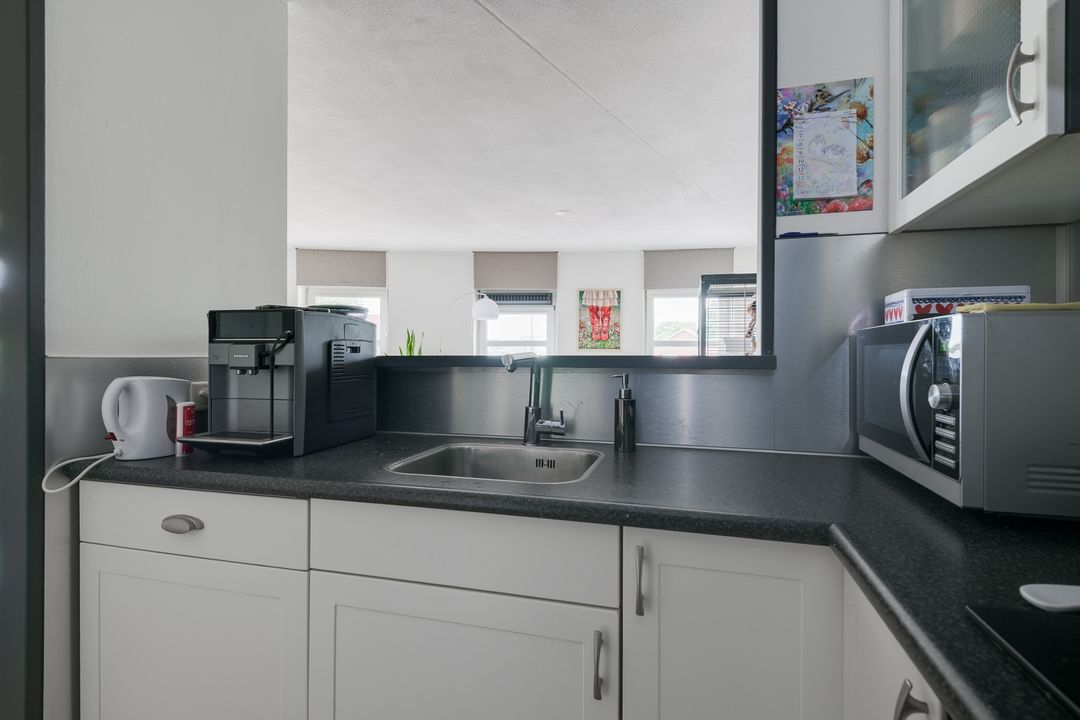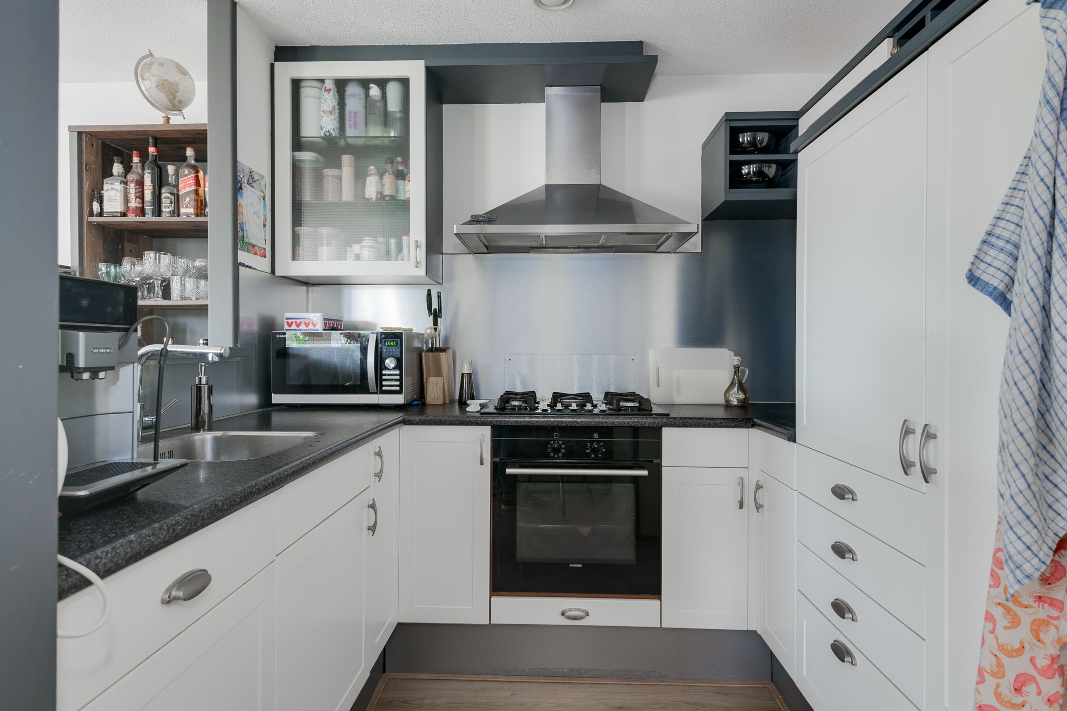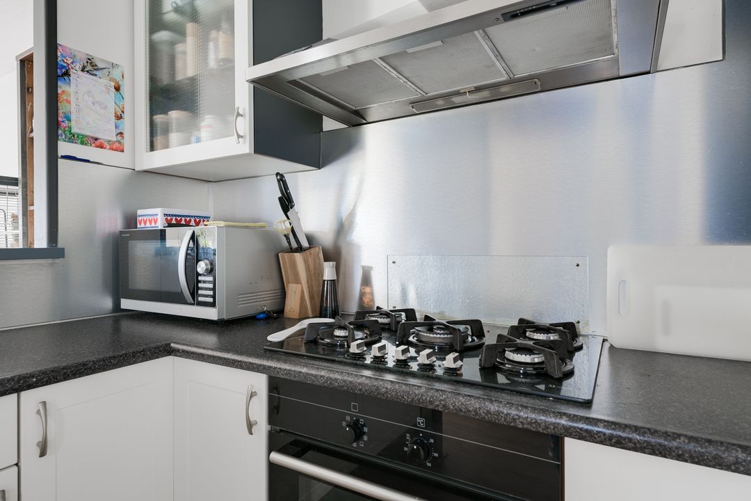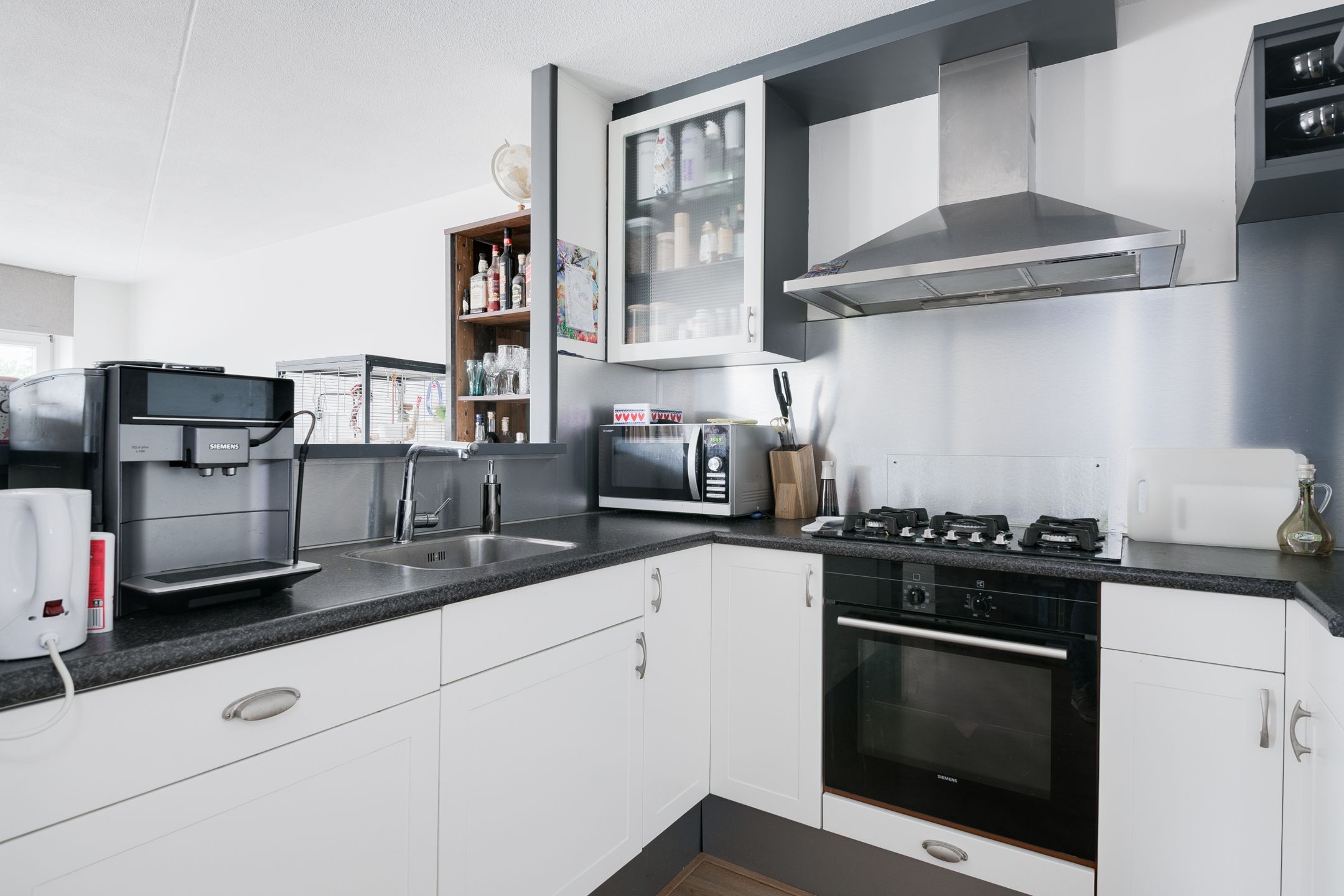 De keuken is halfopen en grenst aan de woonkamer, wat zorgt voor een prettige verbinding tijdens het koken. Het kunststof werkblad is praktisch en gemakkelijk schoon te houden. De inbouwapparatuur omvat onder andere een koelkast, vaatwasser, vijfpits gasfornuis, afzuigkap en oven. De slimme, U-vormige indeling zorgt ervoor dat u ondanks de compacte opzet voldoende werkruimte en opbergruimte heeft.