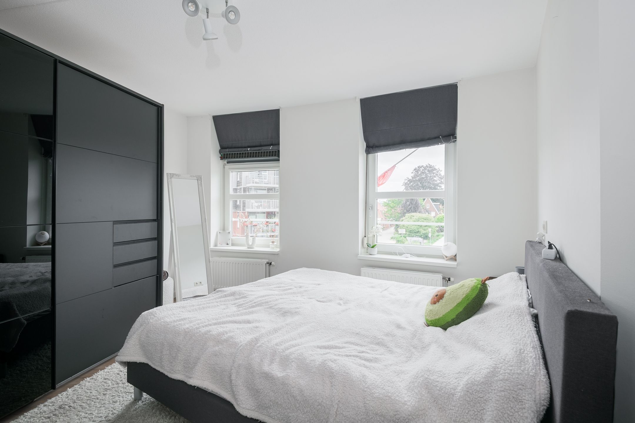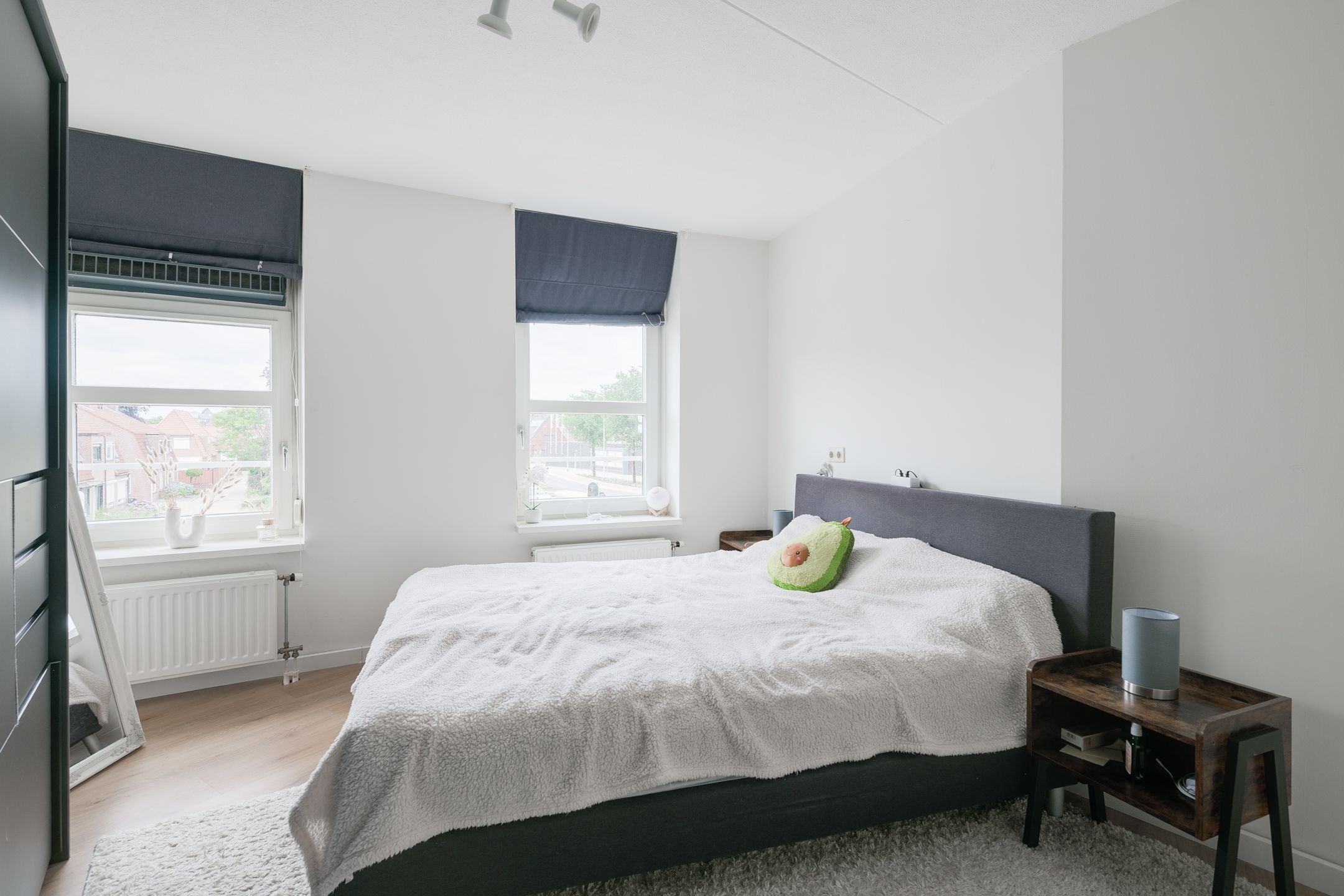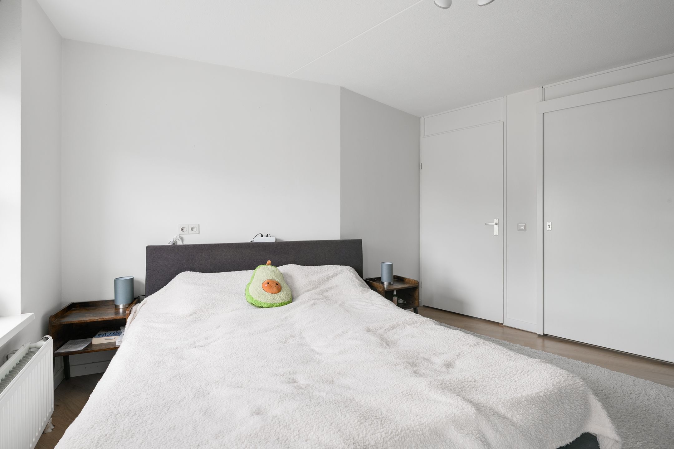 De hoofdslaapkamer is ruim opgezet en voorzien van hetzelfde lichte laminaat als in de rest van de woning. De twee grote ramen aan de gebogen gevel zorgen voor veel natuurlijk licht en een prettig uitzicht op de buurt. Er is voldoende plaats voor een groot tweepersoonsbed en garderobekast, waardoor u alle ruimte heeft voor een comfortabele inrichting.