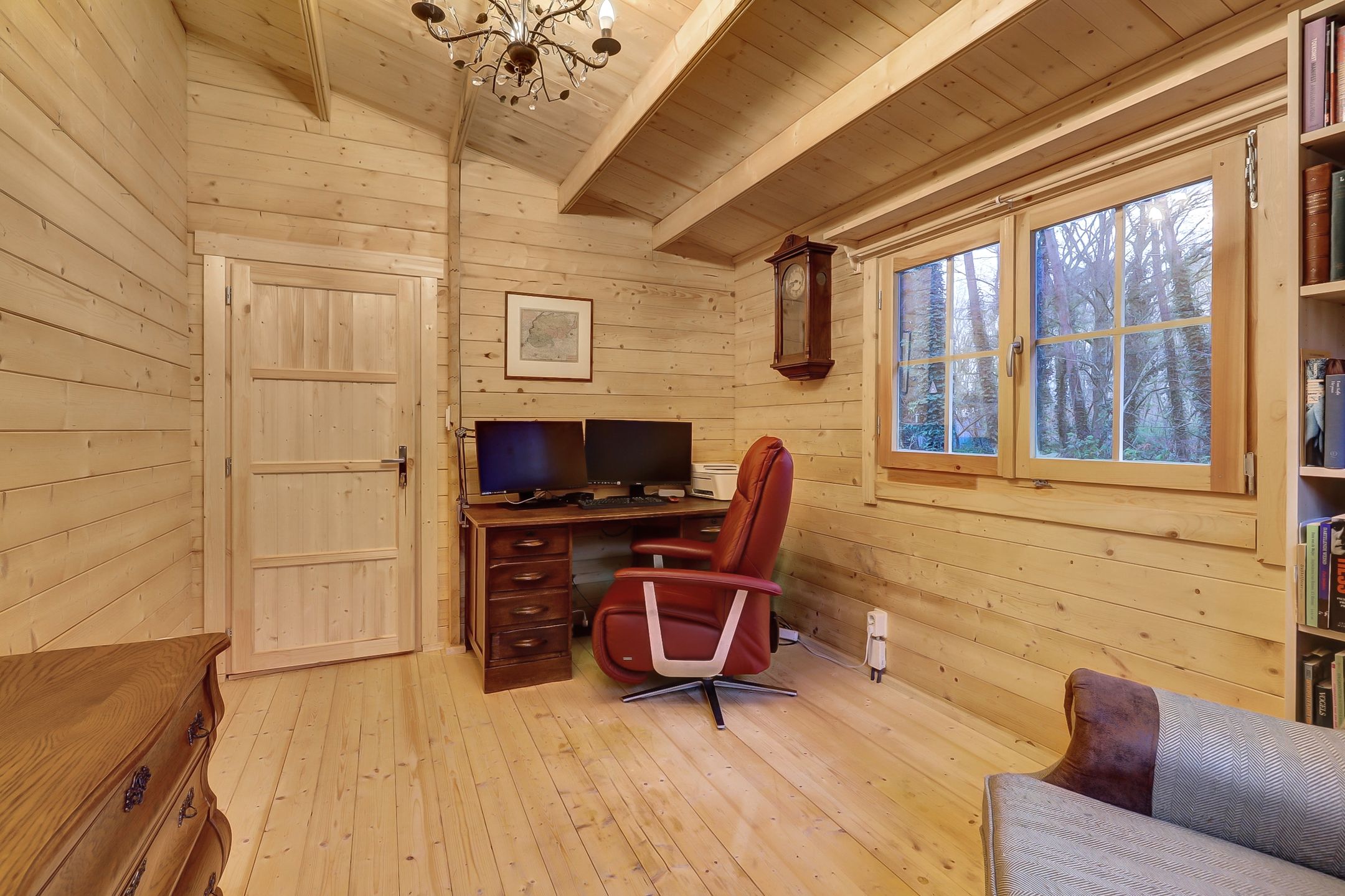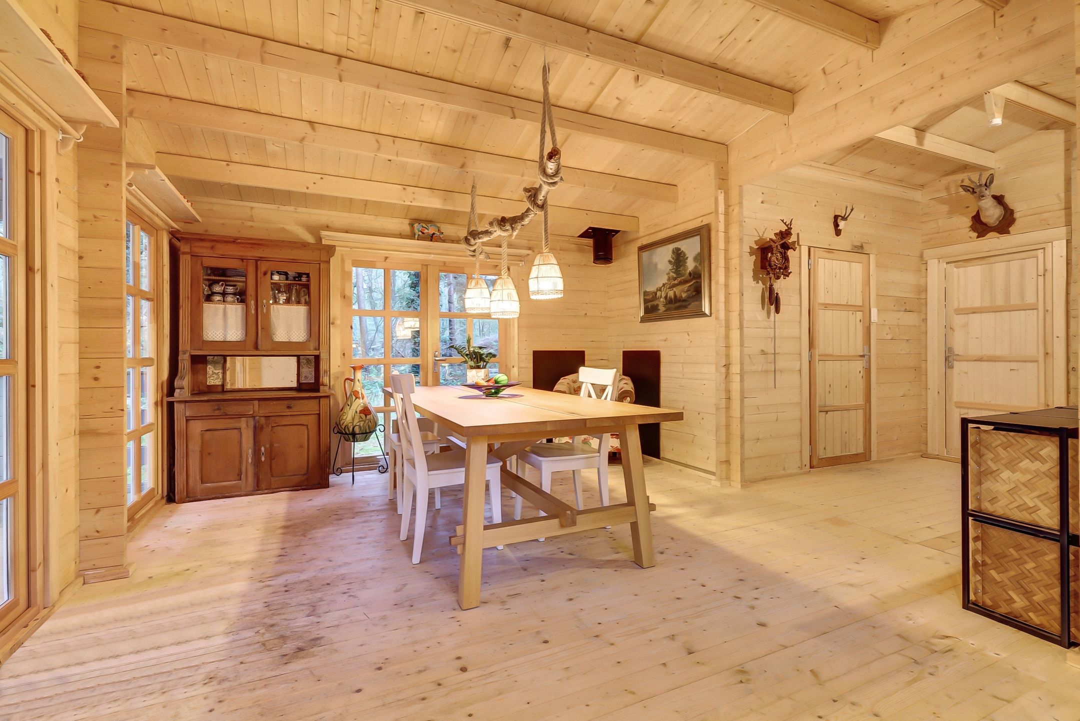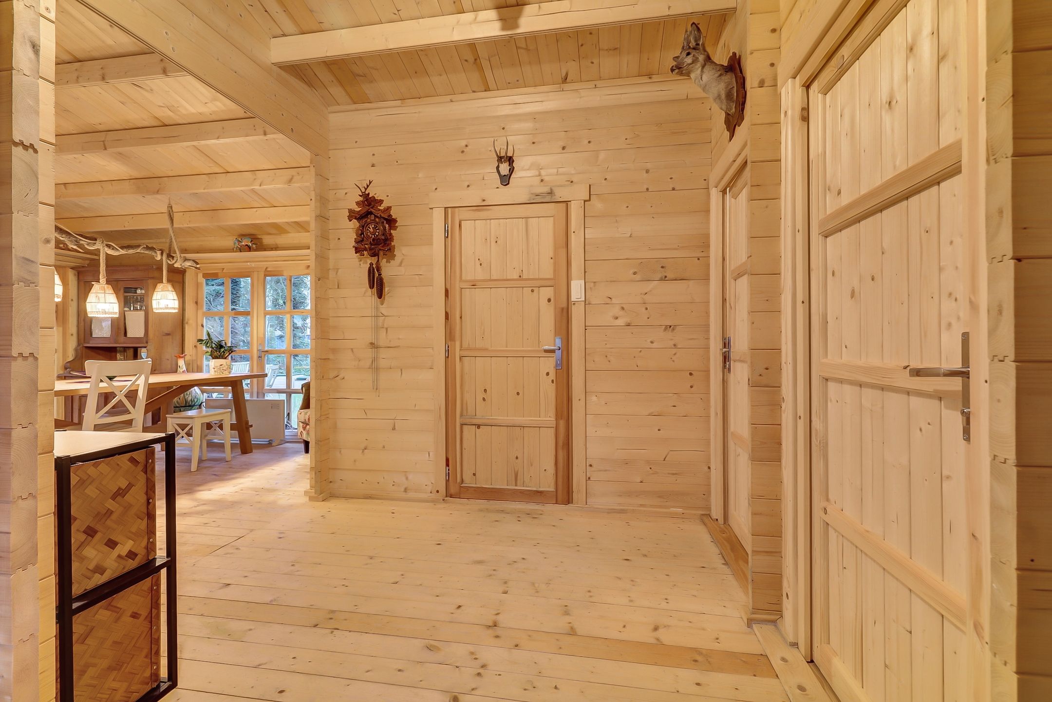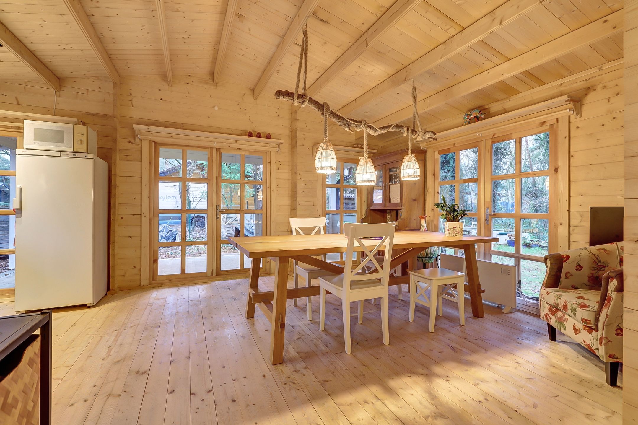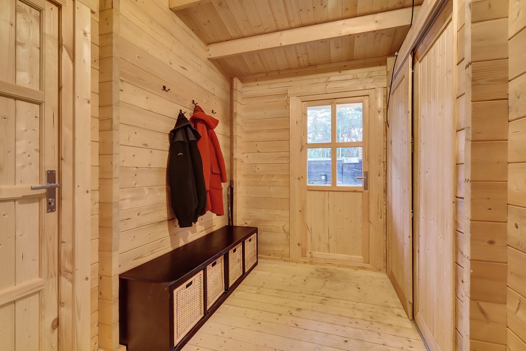 Of je nu via de voordeur binnenkomt of door de dubbele deuren van de veranda stapt, je voelt het meteen: dit huisje leeft. De geur van geolied hout, het zachte licht dat door de vele ramen naar binnen valt, de warme sfeer die zich als een deken om je heen legt.