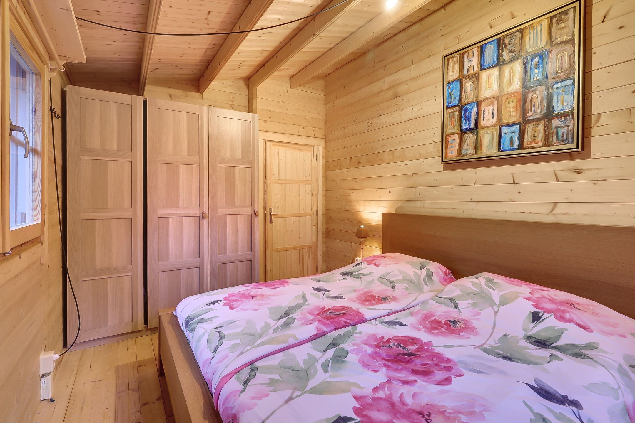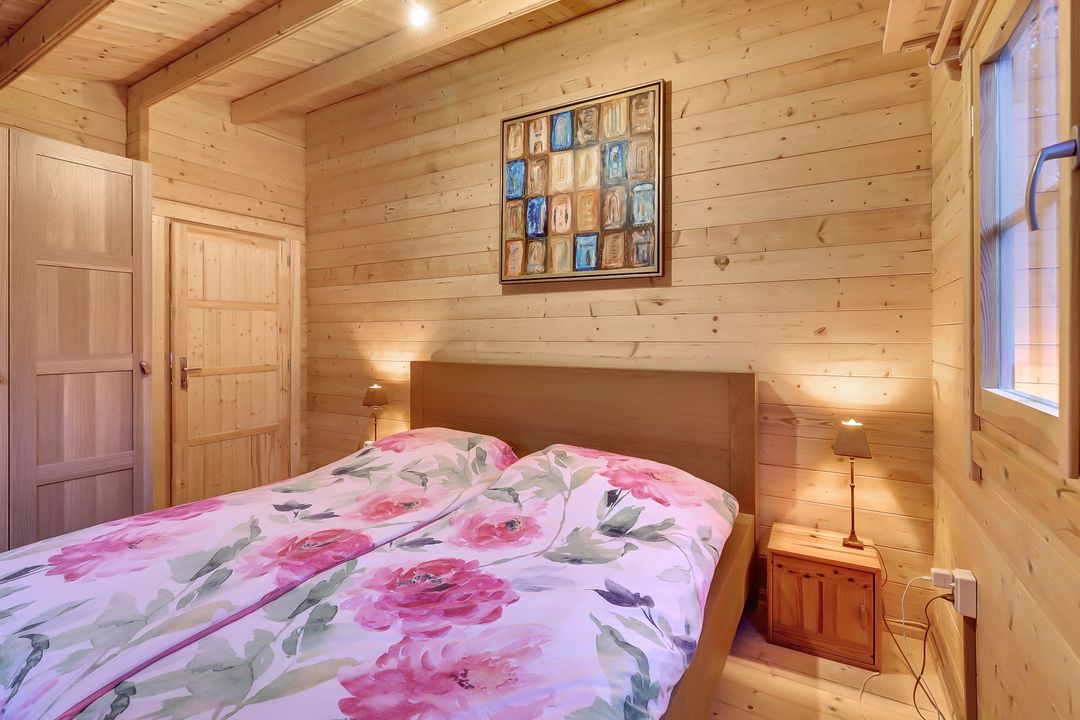 Verderop in het huis liggen twee gelijkwaardige slaapkamers, beide licht, warm en knus. De raampartijen met draaikiepvensters laten je kiezen tussen frisse lucht of volledige rust. De houten luiken aan de buitenkant geven een zacht, landelijk contrast en zorgen ervoor dat je de kamers in een oogwenk kunt verduisteren: heerlijk tijdens warme zomerdagen of juist voor een diepe, stille nacht.