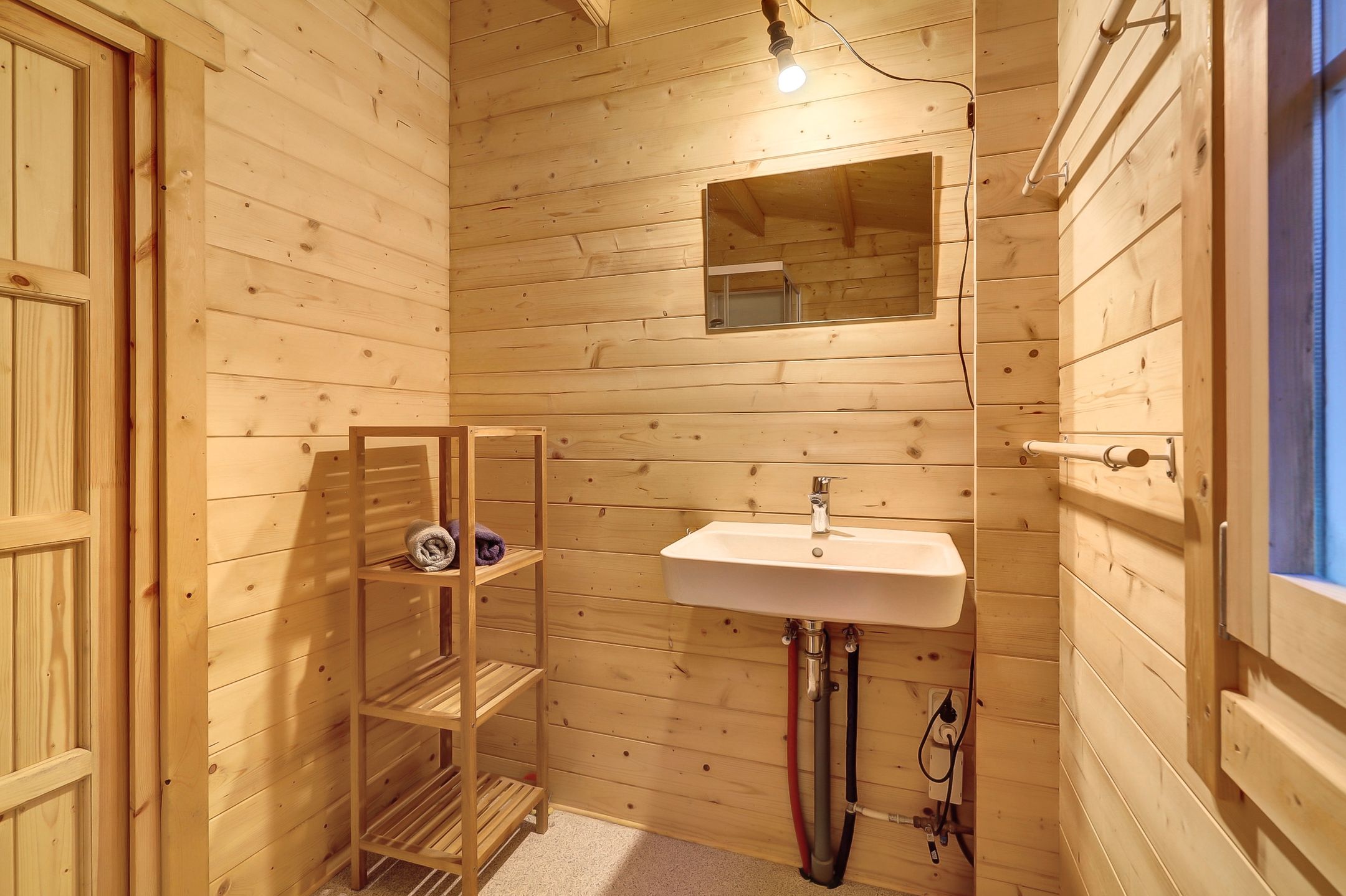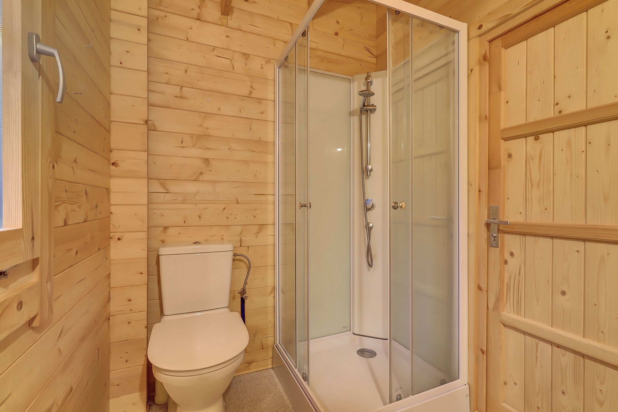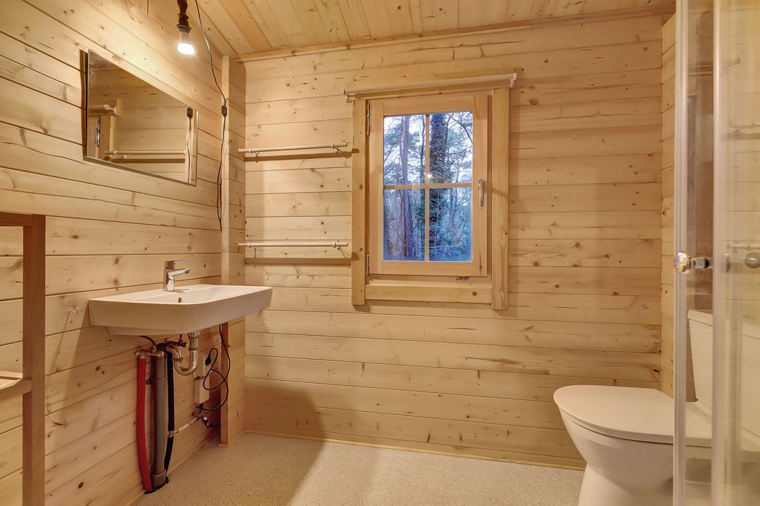 De badkamer is compact maar precies goed met een comfortabele douchecabine, toilet en wastafel, alles afgewerkt met oog voor detail. De vinylvloer voelt praktisch en warm tegelijk en is waterbestendig wat fijn is voor het dagelijkse gebruik.