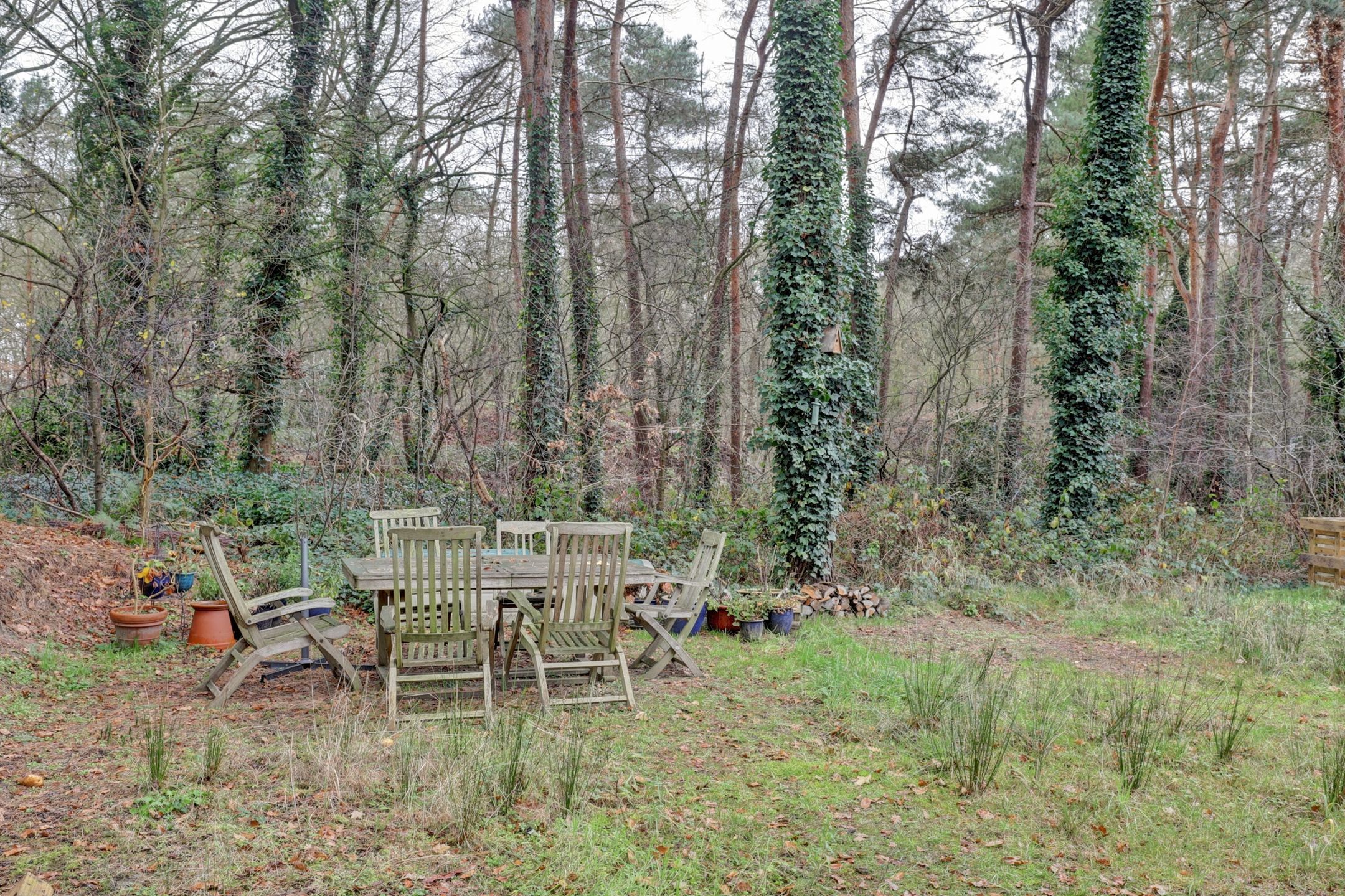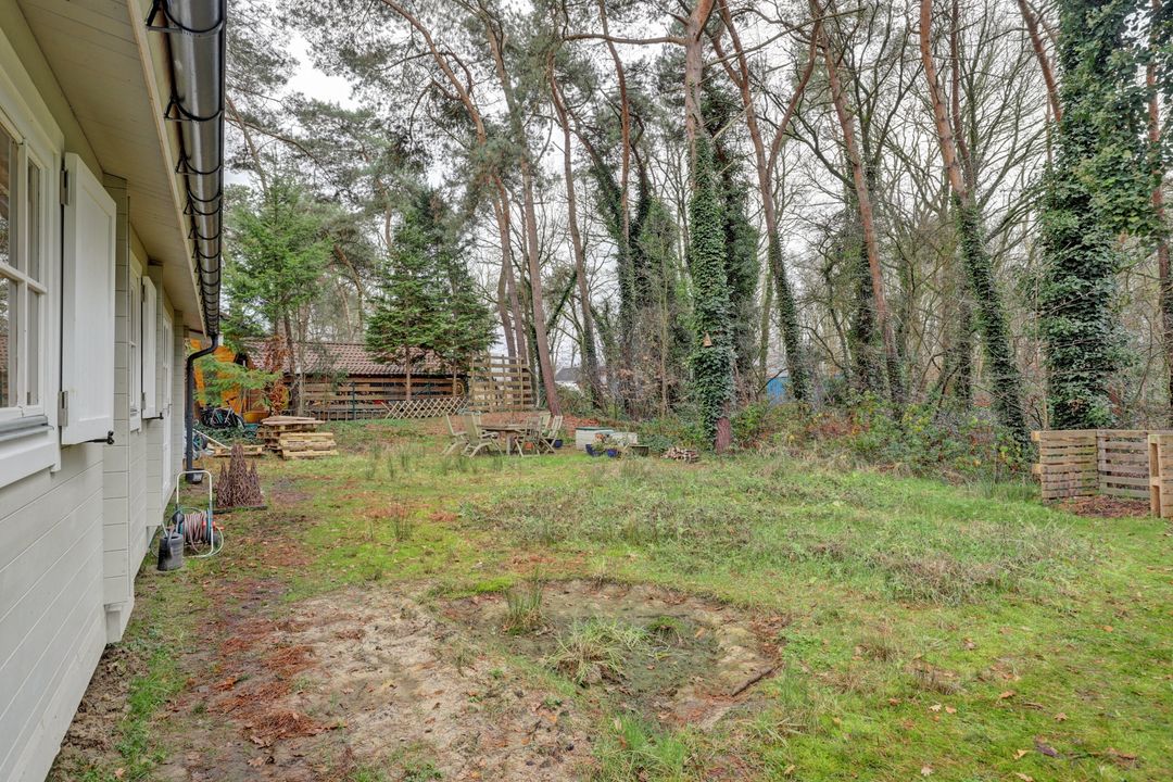 Rondom het huis strekt zich een tuin uit die voelt alsof hij langzaam opgaat in het bos. Hier geen strakke lijnen maar een plek waar je de natuur haar gang laat gaan en jij met haar meebeweegt. Een tuin die leeft, groeit, ruist en bruist van kleine ontdekkingen.