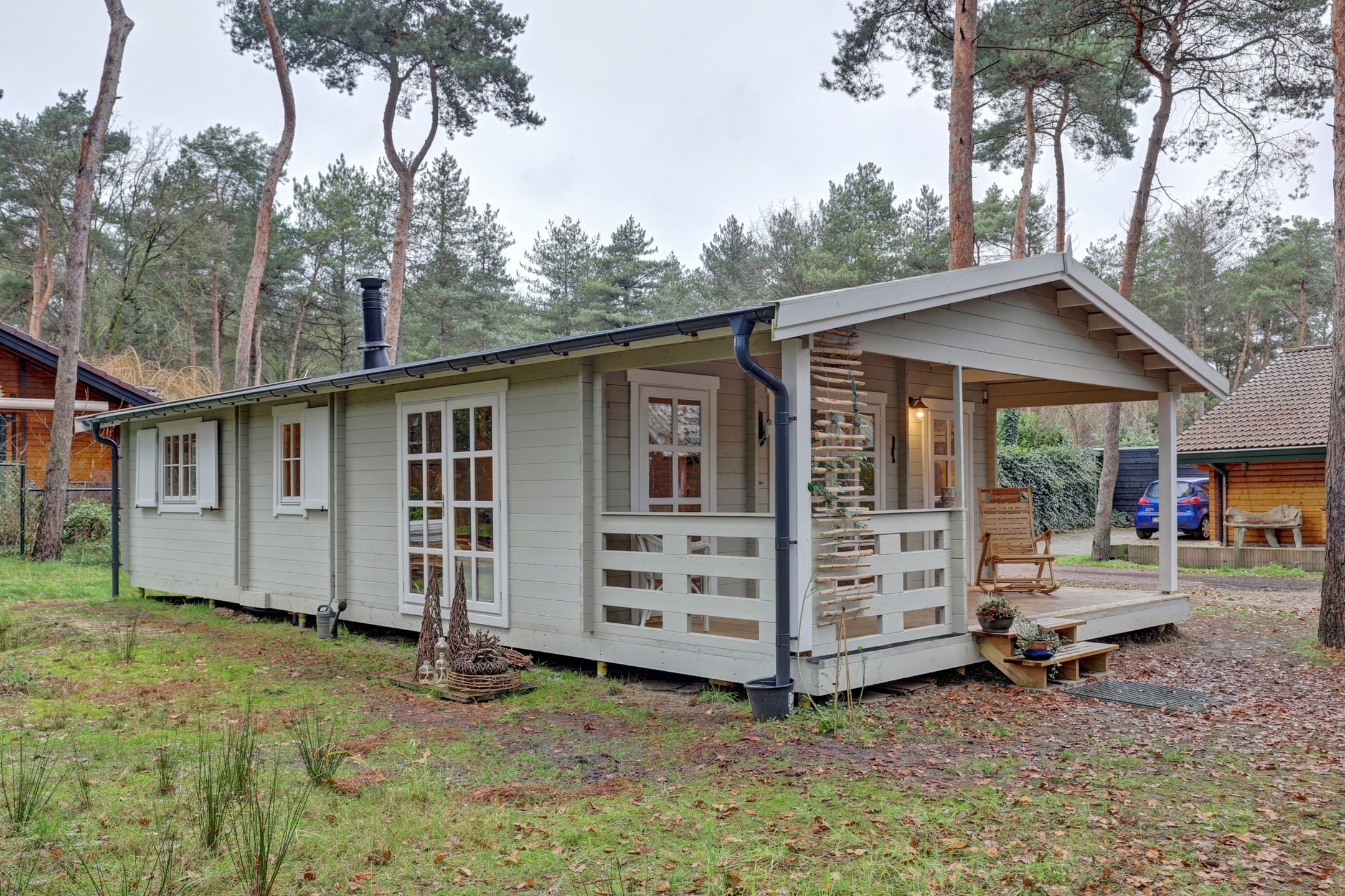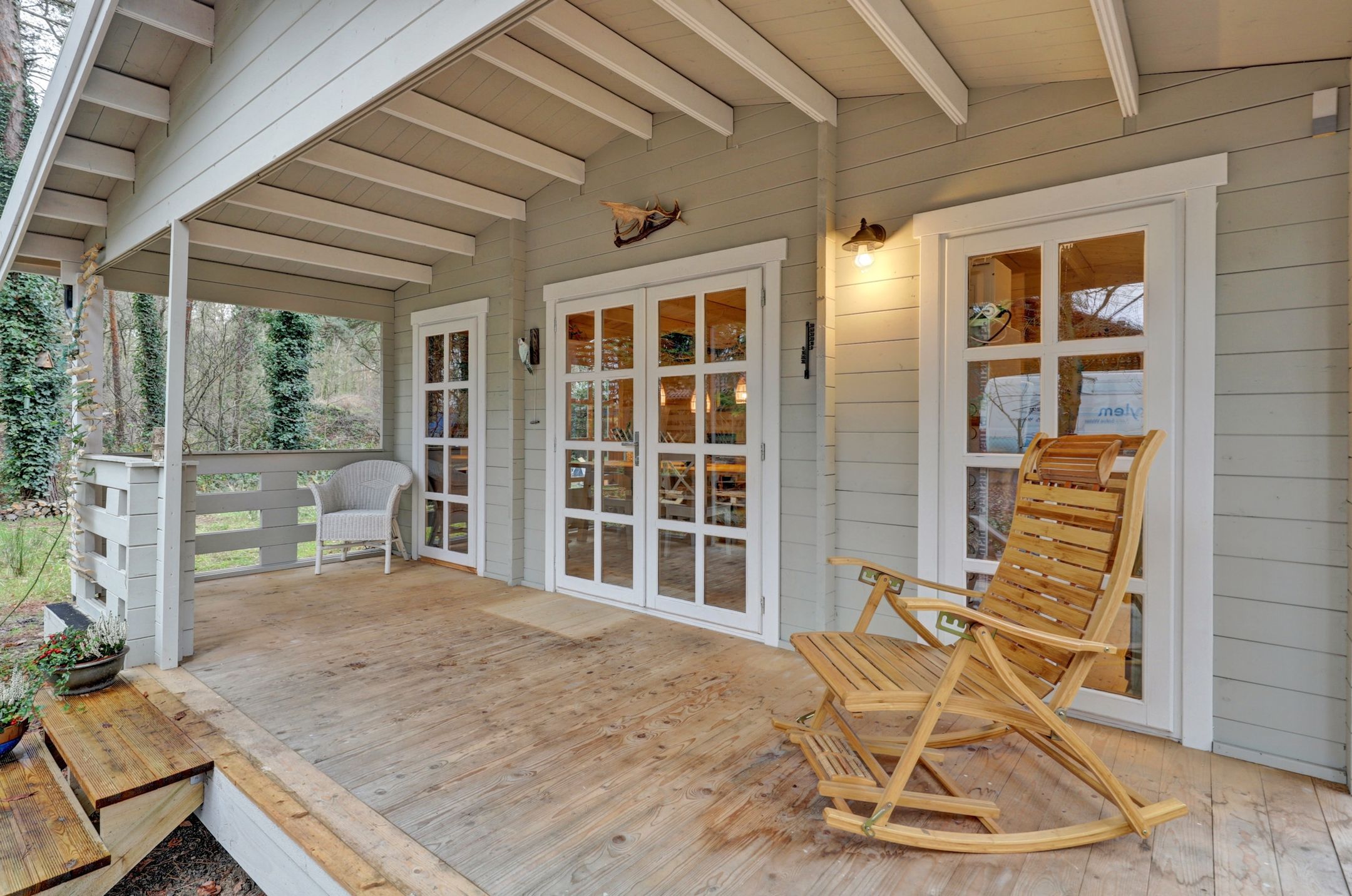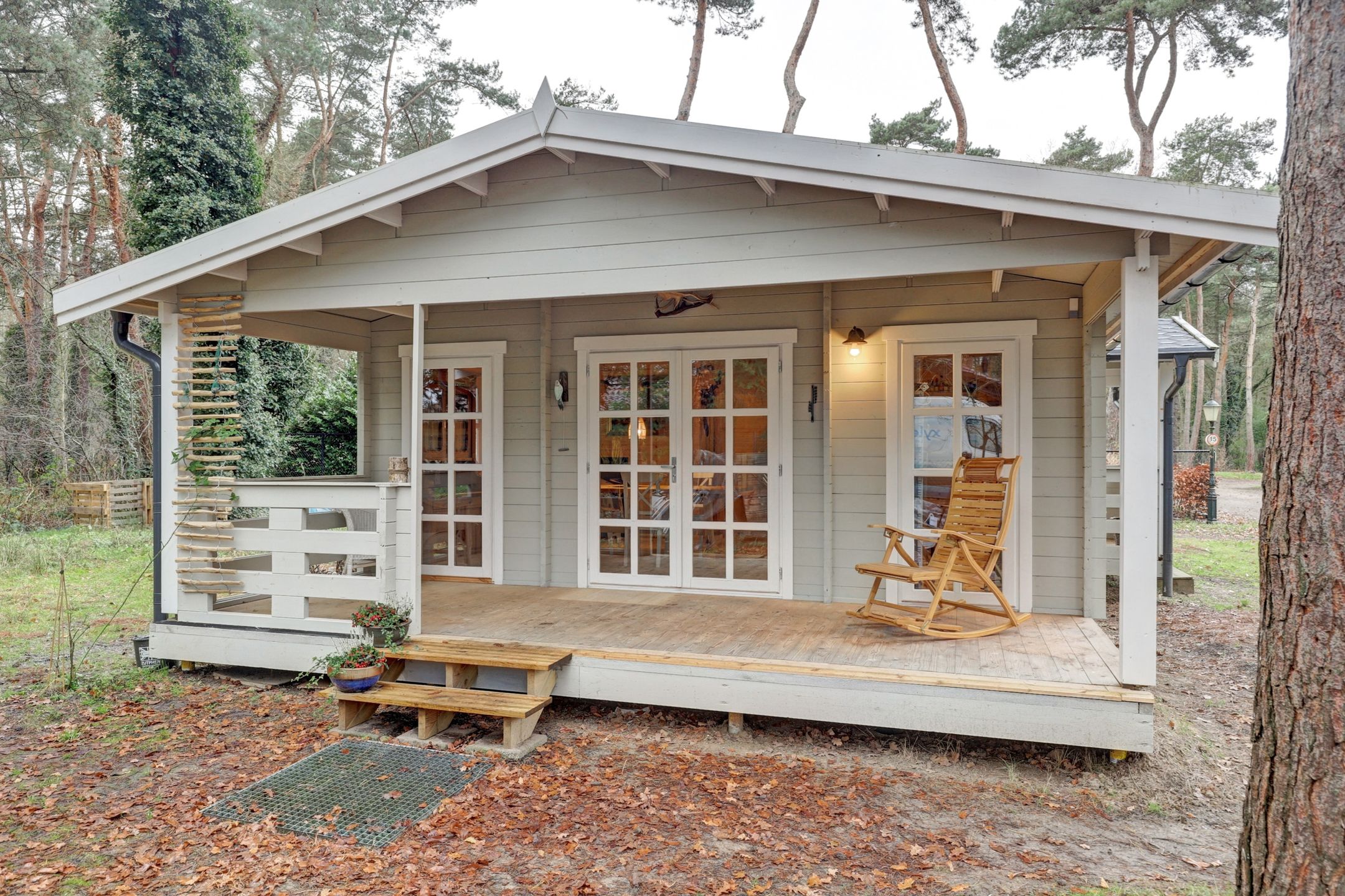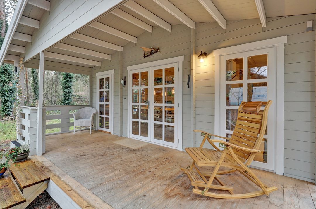 En dan die veranda aan de zijkant… Een plek om wakker te worden met je eerste kop koffie, terwijl het zachte ochtendlicht door de bomen valt. Of juist om ’s avonds, gewikkeld in een plaid, de stilte van de natuur te horen ademen.