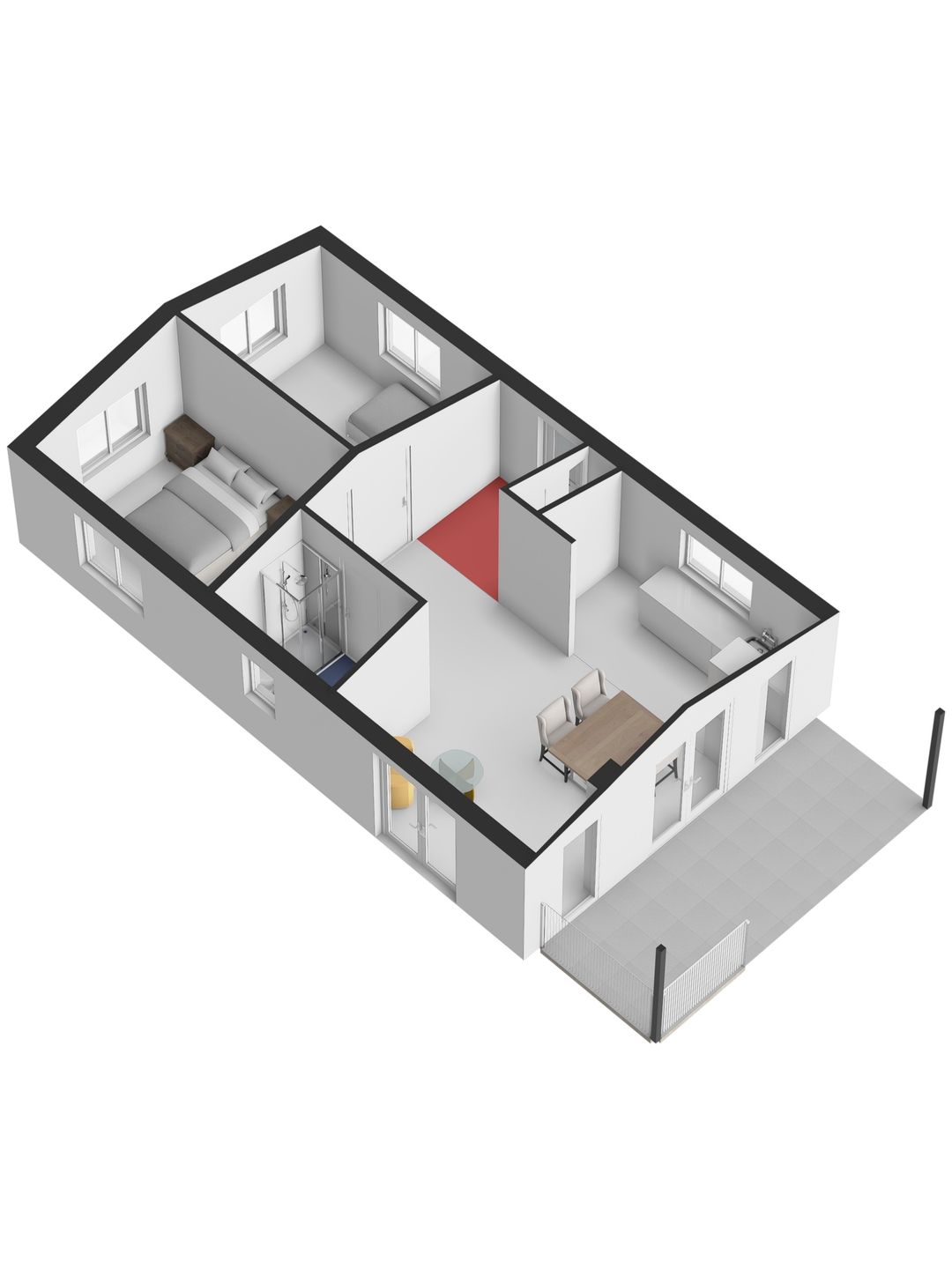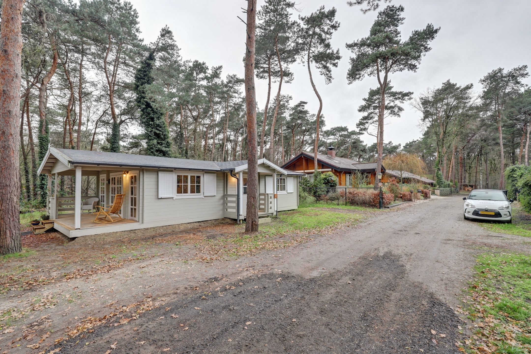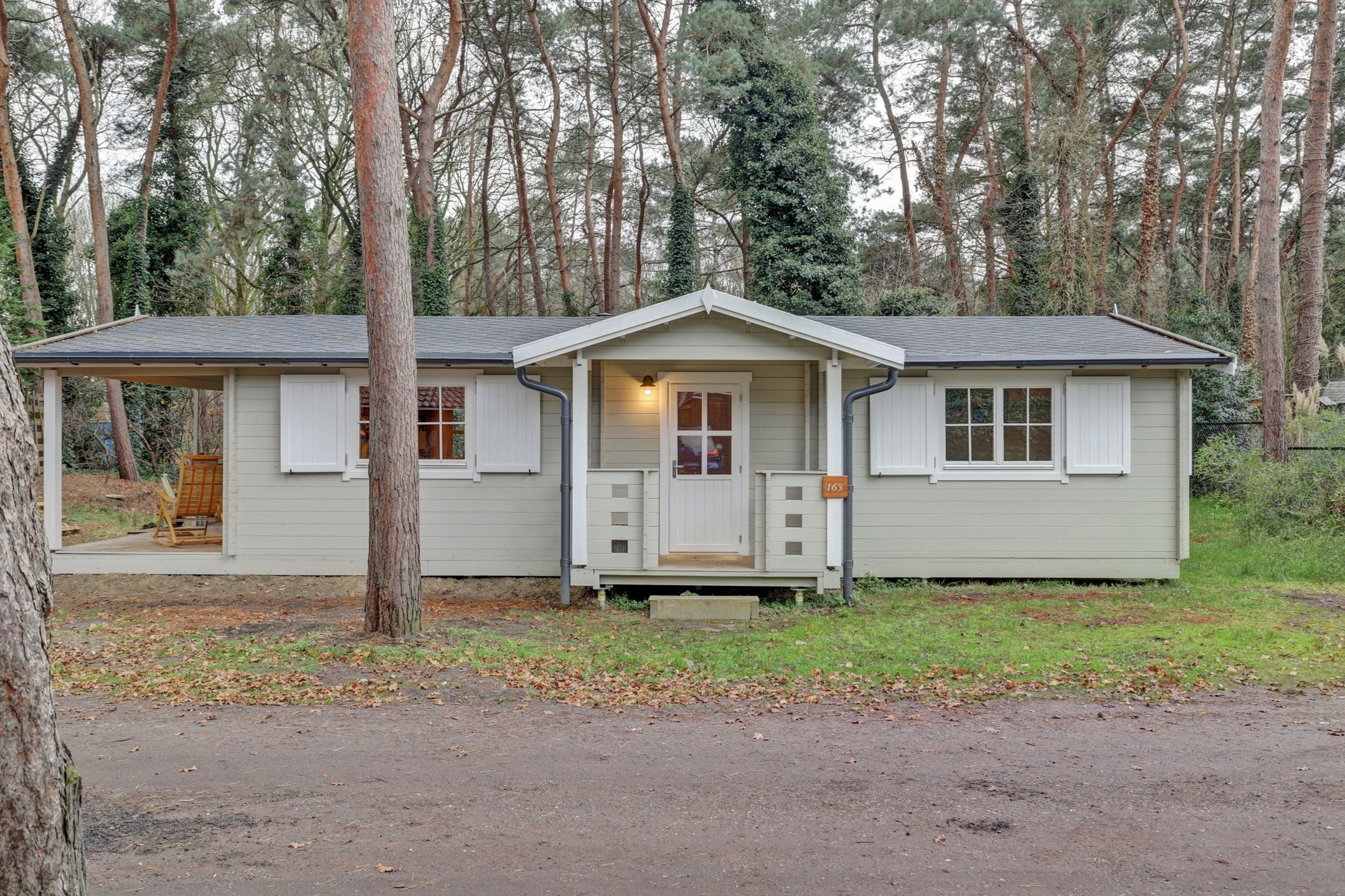 En dan die veranda aan de zijkant… Een plek om wakker te worden met je eerste kop koffie, terwijl het zachte ochtendlicht door de bomen valt. Of juist om ’s avonds, gewikkeld in een plaid, de stilte van de natuur te horen ademen.
